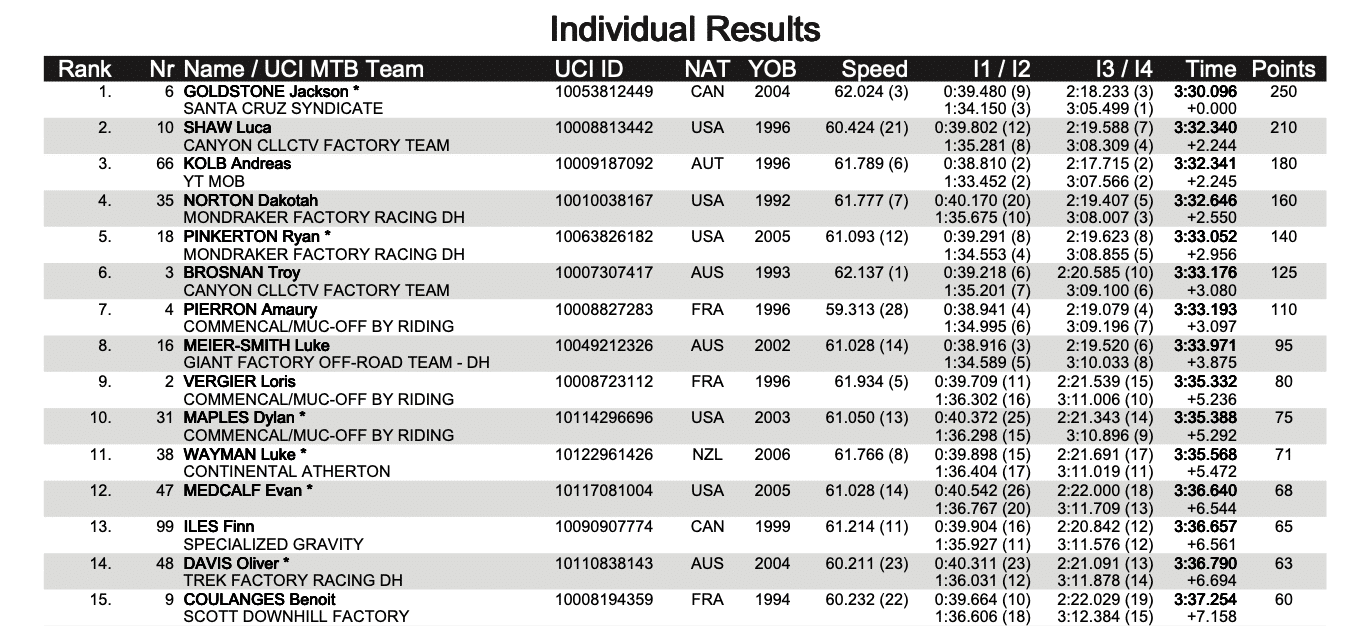Puis vient le moment que tout le monde attendait. Jackson Goldstone s’élance, à domicile, porté par un public en fusion. Dans les bois, il saute plus loin que quiconque, triple le rock garden, reste debout malgré les erreurs, et trouve une vitesse surnaturelle dans les derniers mètres. À la ligne : 3’30’’00. Deux secondes plus vite que Kolb. Le public explose. Le héros local vient, peut-être, de tout renverser.