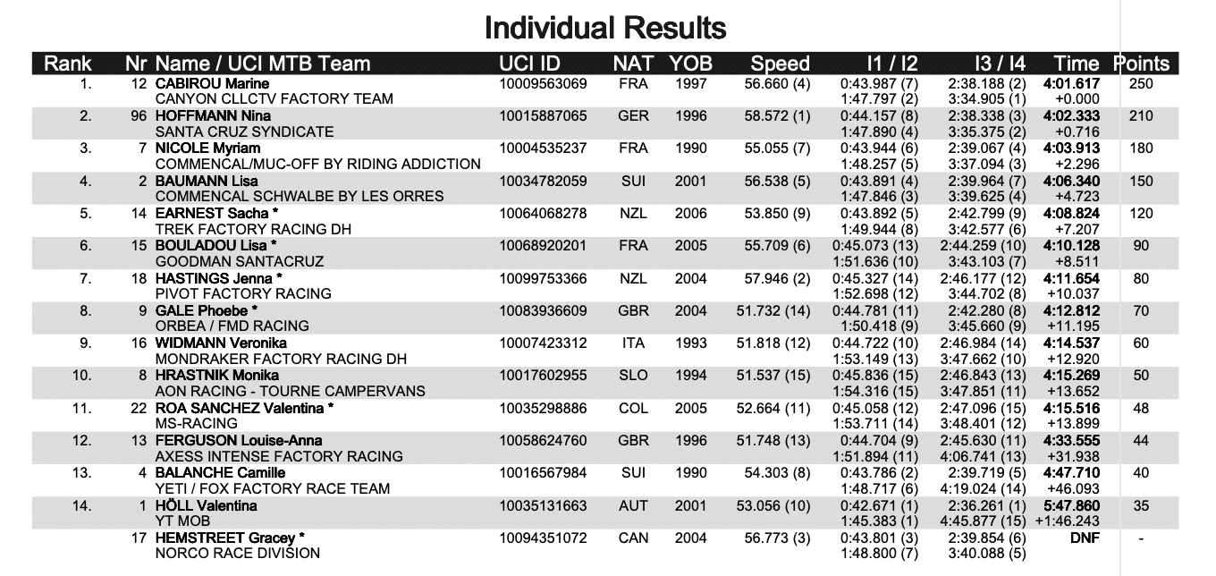 Nina Hoffmann (Santa Cruz Syndicate), victorieuse à La Thuile plus tôt dans la saison, a livré une descente solide et échoue à sept dixièmes, tandis que Myriam Nicole (Commencal/Muc-Off) complète le podium à 2,2 secondes, retrouvant des couleurs après une année en demi-teinte, et notamment une victoire en qualifications la veille.