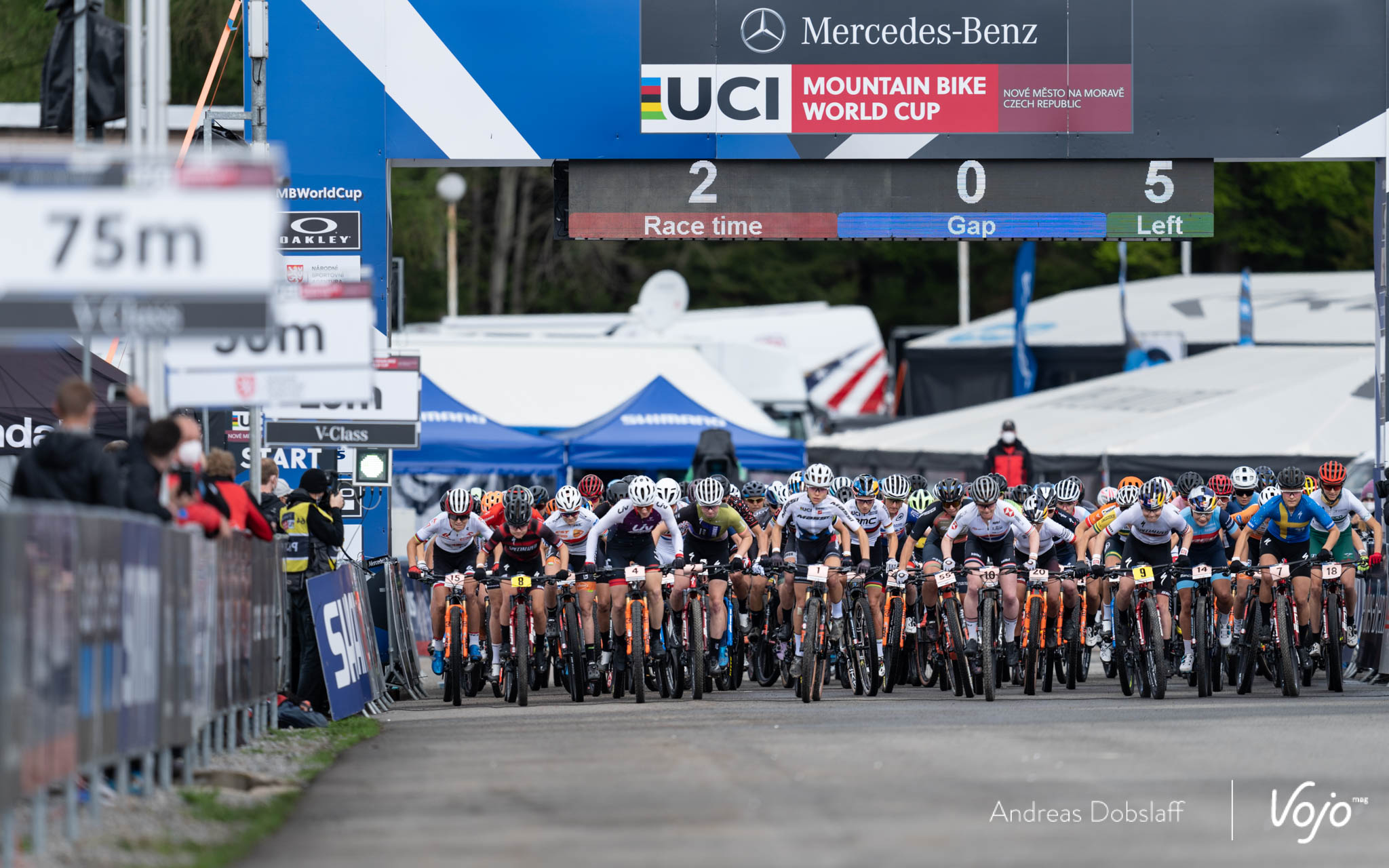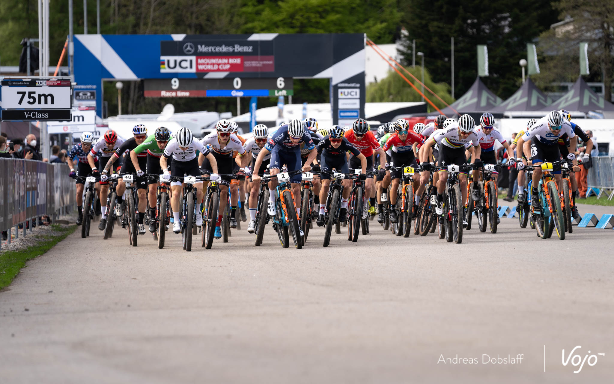 Avec le maillot de leader de la coupe du Monde sur les épaules, Victor Koretzky prend le meilleur départ. Il est suivi par Mathieu van der Poel et c’est d’ailleurs le Néerlandais qui prend les commandes dans la montée en goudron qui emmène les coureurs en direction des sous-bois.