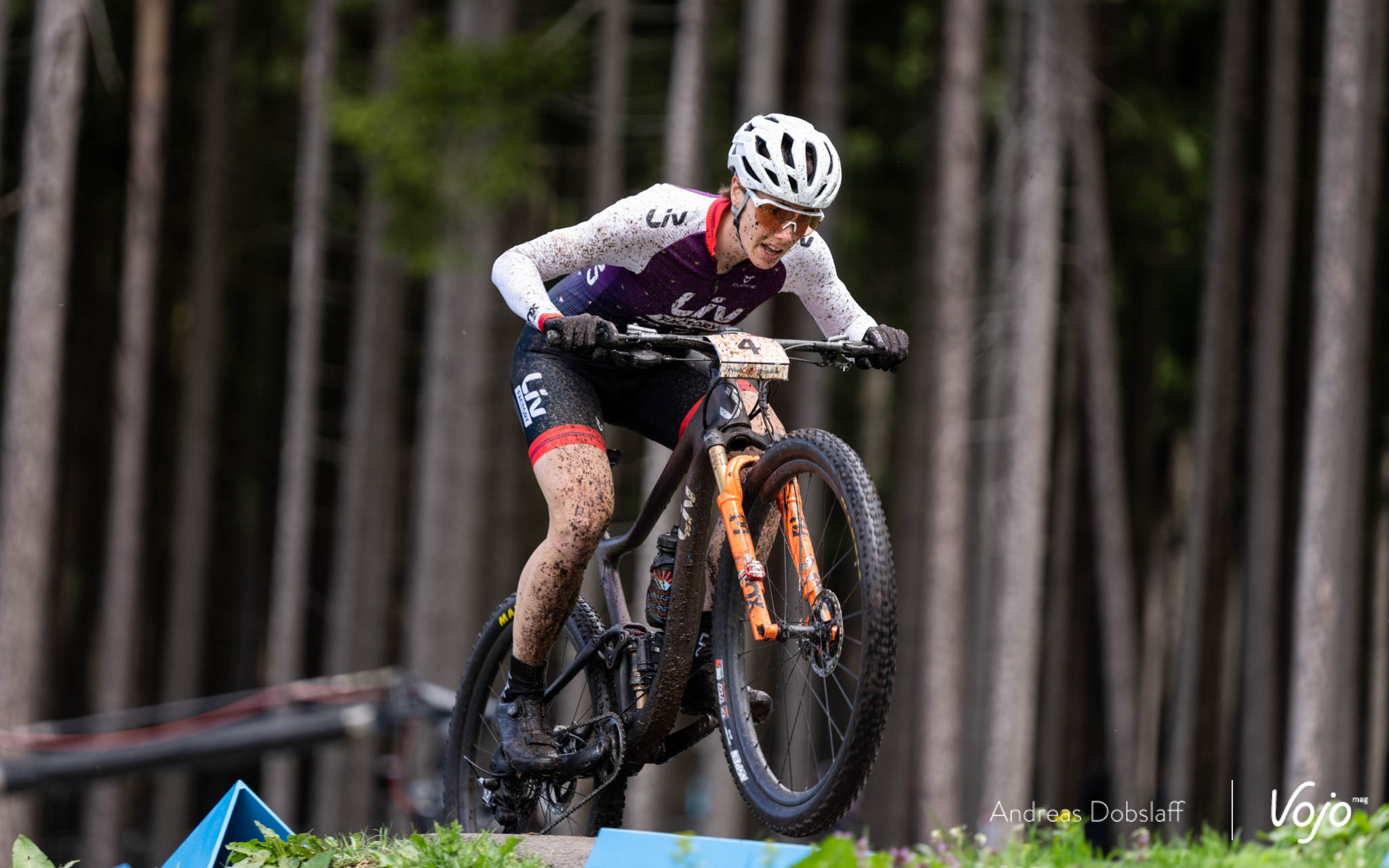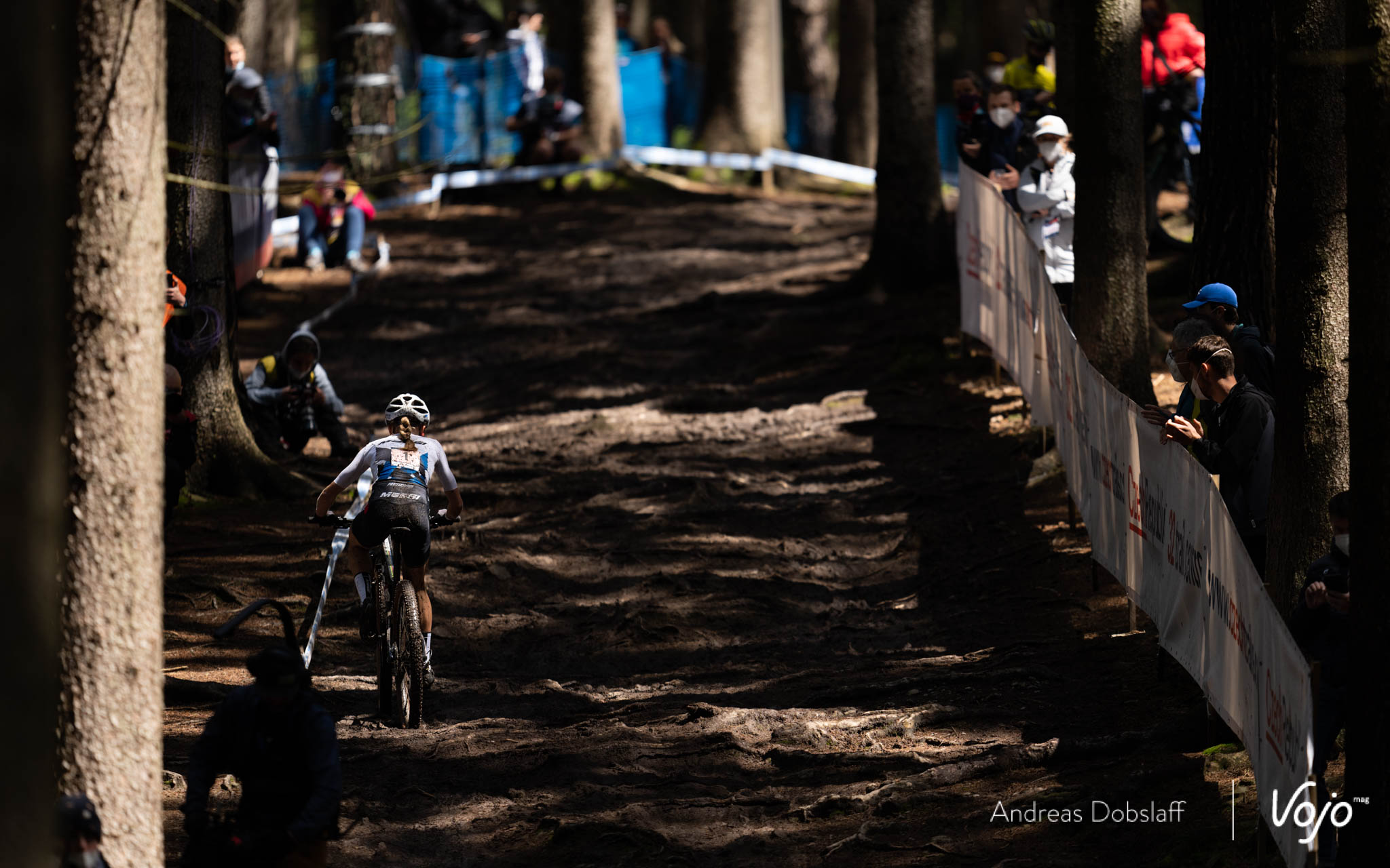 Une descente et une montée difficile dans les racines (où presque tout le monde doit passer à pieds) plus loin, Loana Lecomte a commencé à creuser un écart sur ses poursuivantes et seule Kate Courtney est en mesure de s’accrocher à sa roue. Cela fait à peine 5 minutes que la course est lancée !