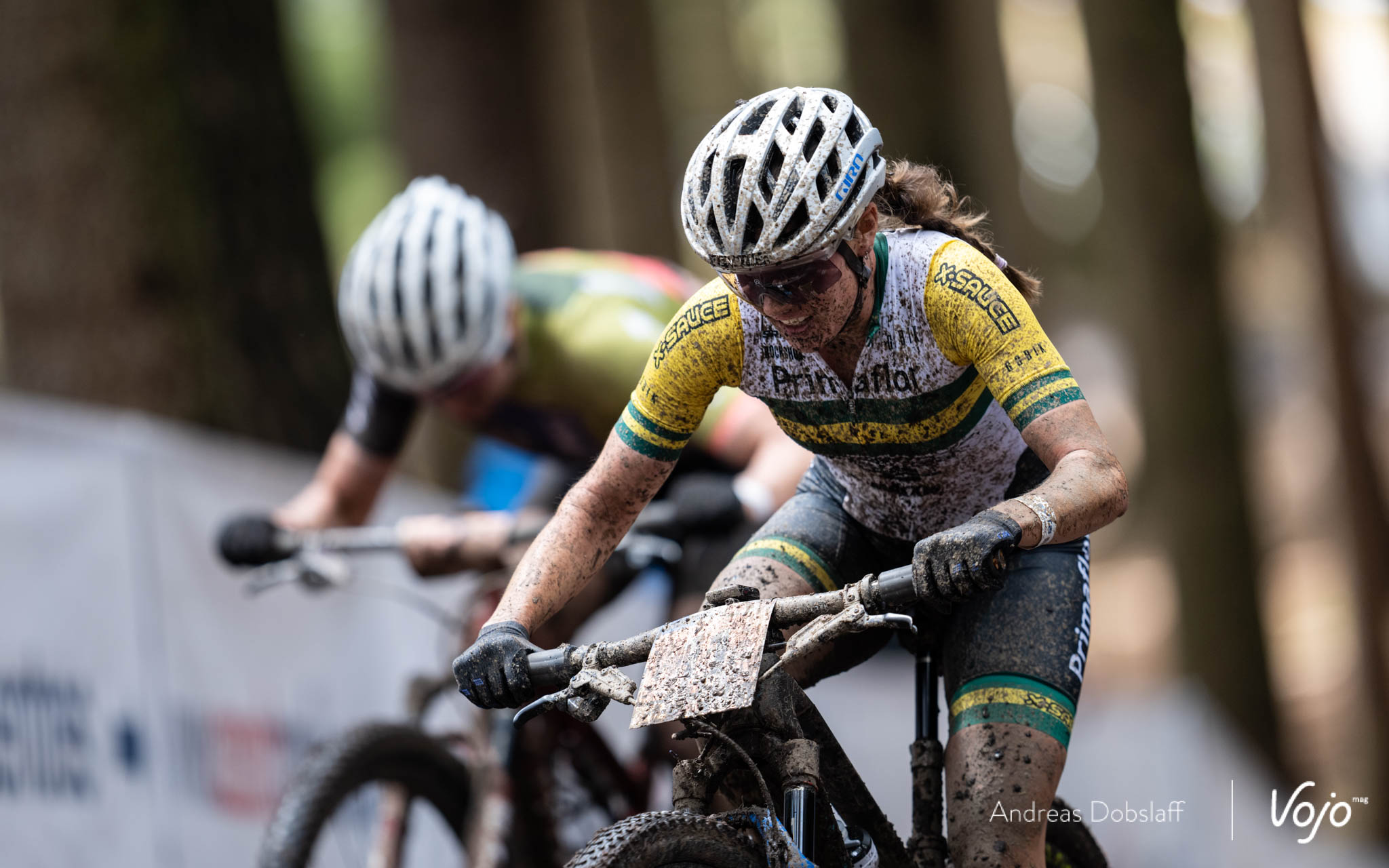 En quatrième position, on retrouve Pauline Ferrand-Prévot, à peine ralentie par sa chute du vendredi et sa crevaison, suivie par Evie Richards qui monte donc sur son premier podium Elites de XCO.