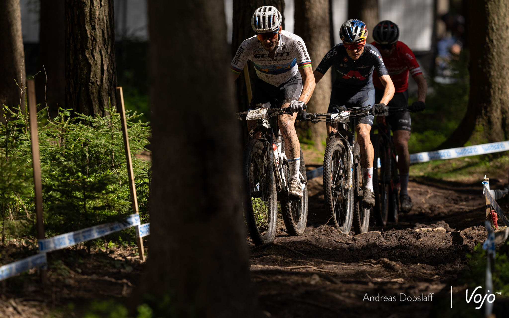 En XC, le rythme est généralement élevé après le départ, mais pas aussi violent, et l’allure imposée par Van der Poel fait son effet : à la fin de la start-loop, il n’a plus que Nino Schurter et Mathias Flückiger dans sa roue. Tom Pidcock est à 8 secondes, Ondrej Cink à 15 secondes et le gros du peloton, très étiré, arrive ensuite avec au moins 25 à 30 secondes de retard.