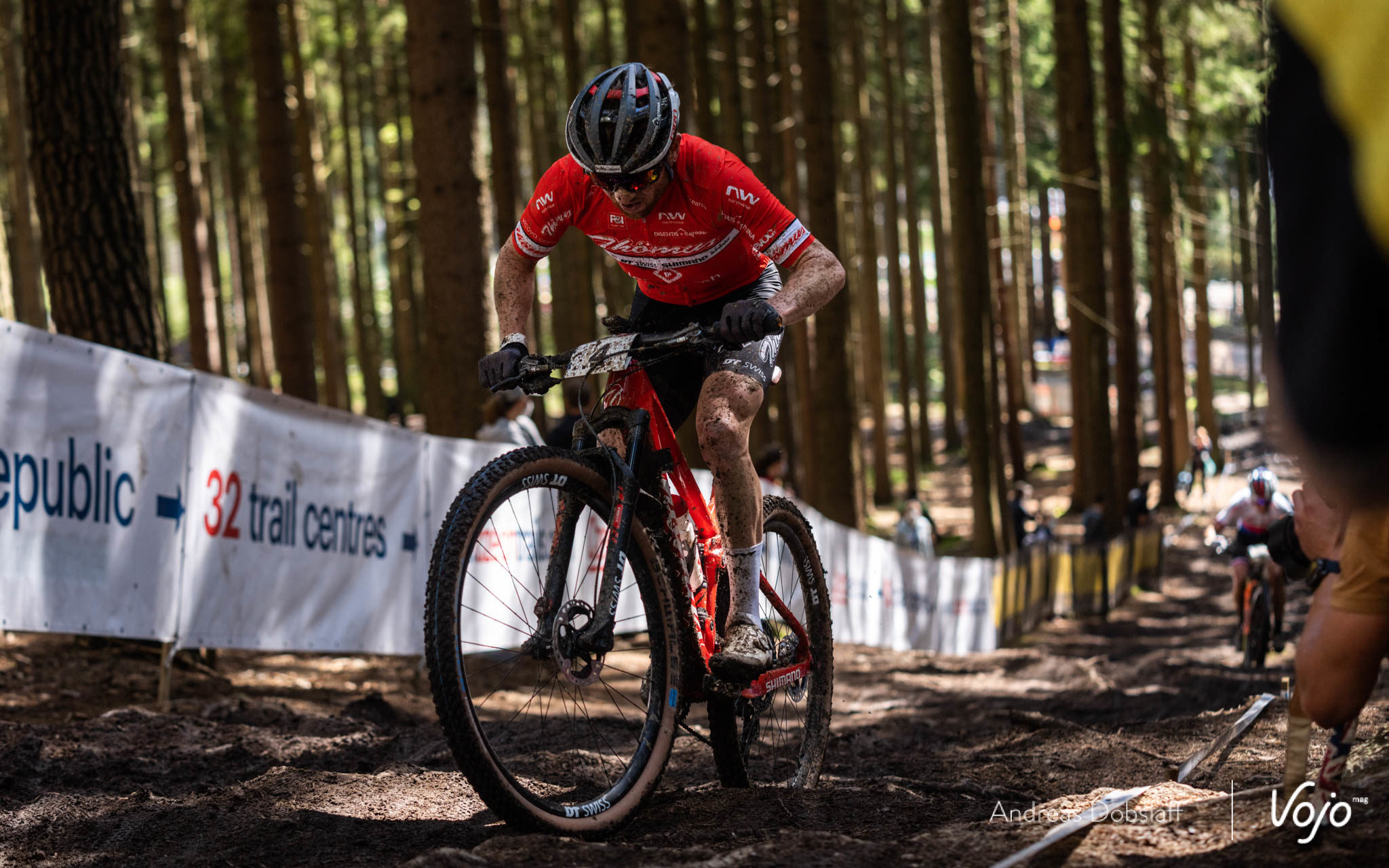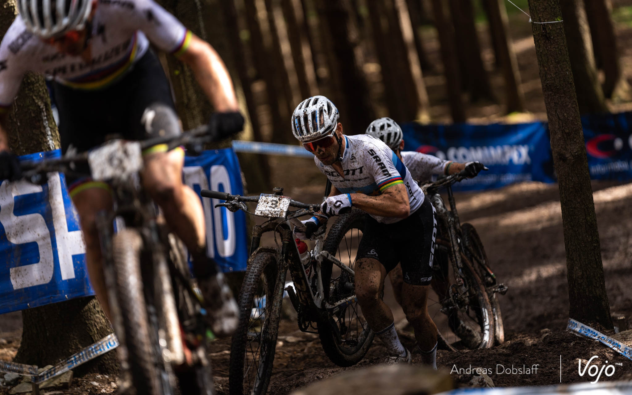 Au même endroit quelques dizaines de secondes plus tard, Nino Schurter perd la roue avant sur une racine et chute. Pas de bobo et aucun problème mécanique contrairement à sa coéquipière Kate Courtney plus tôt dans la journée, mais cela fait les affaires de Sarrou et Hatherly, qui se débarrassent ainsi d’un encombrant adversaire pour la 5e place.