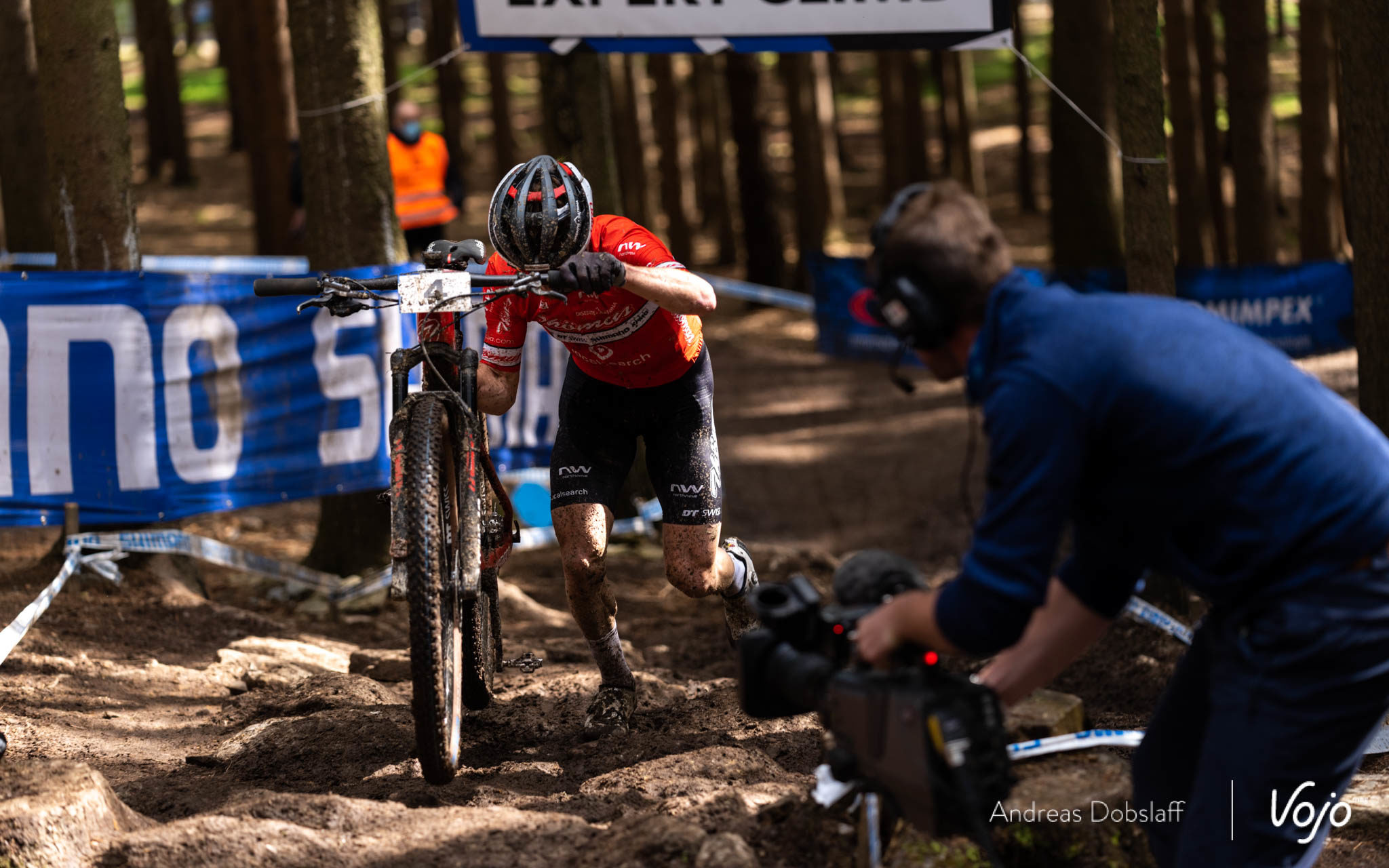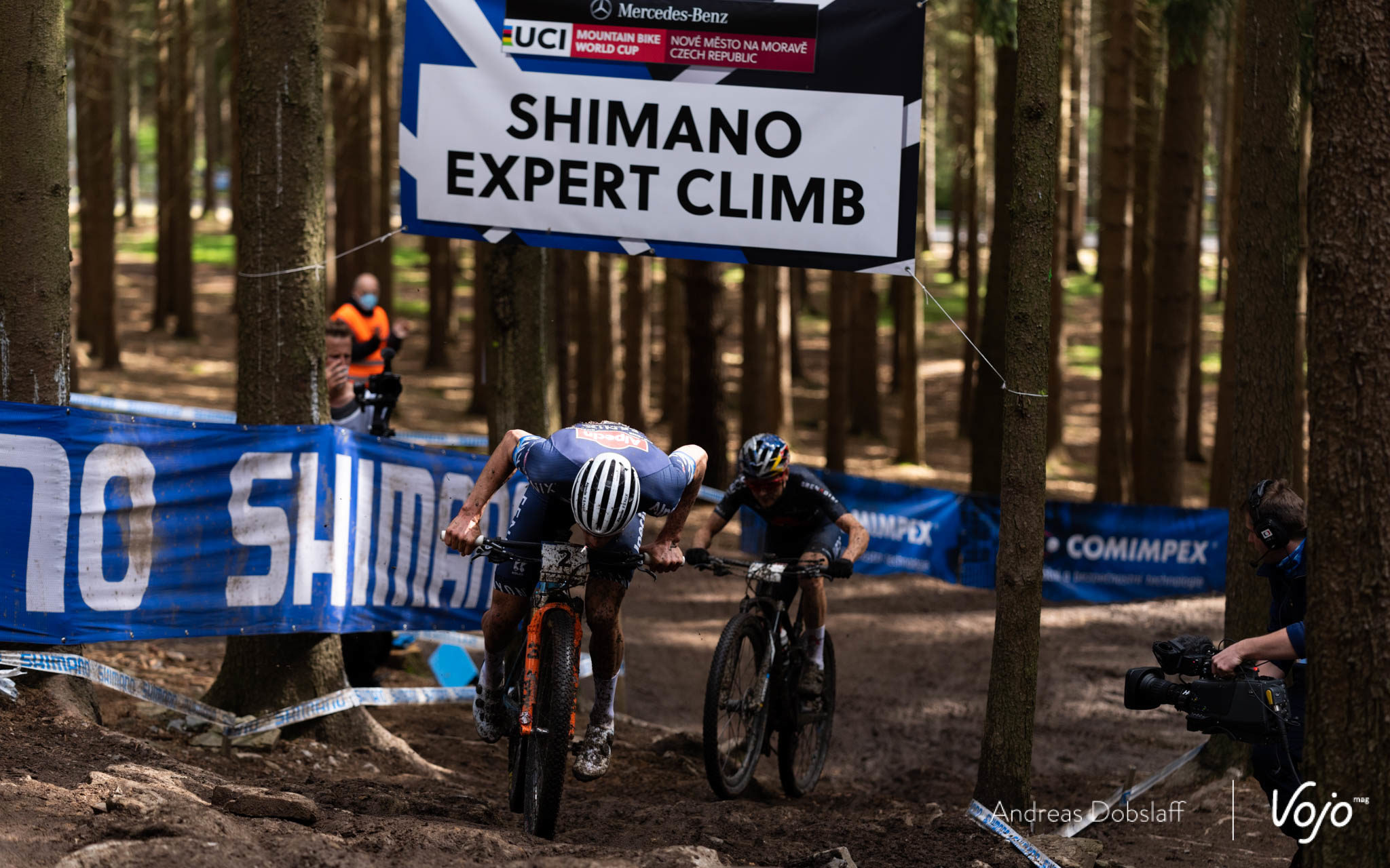 Lui aussi excellent crossman (2e des championnats du Monde 2020 derrière Van der Poel) Pidcock connaît bien la stratégie du Néerlandais et produit rapidement l’effort nécessaire pour revenir dans la roue du trio. Un peu plus loin, c’est au tour d’Ondrej Cink de faire la jonction à la faveur d’un passage sur le vélo de la redoutable montée « Shimano Expert Climb », où la plupart des pilotes étaient à pied ce dimanche.