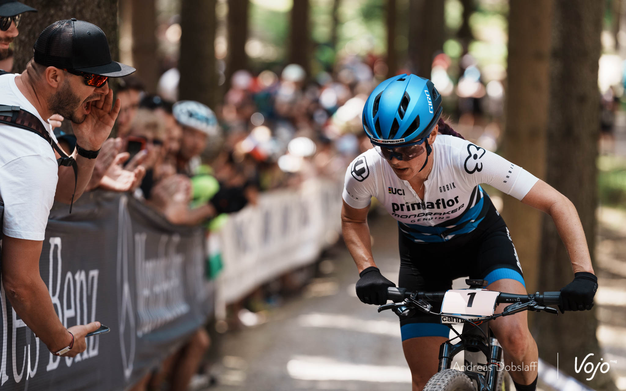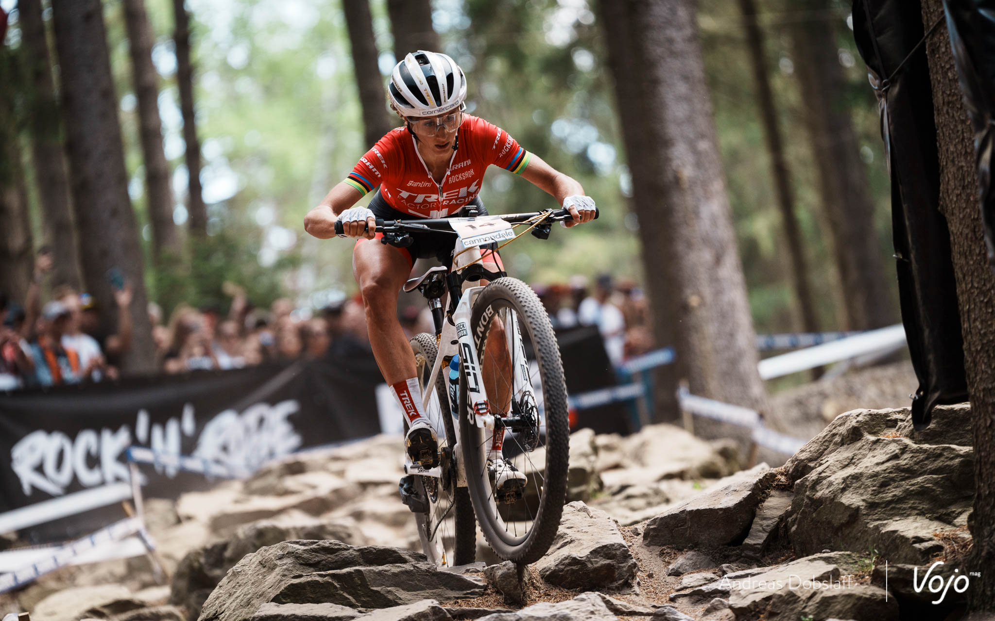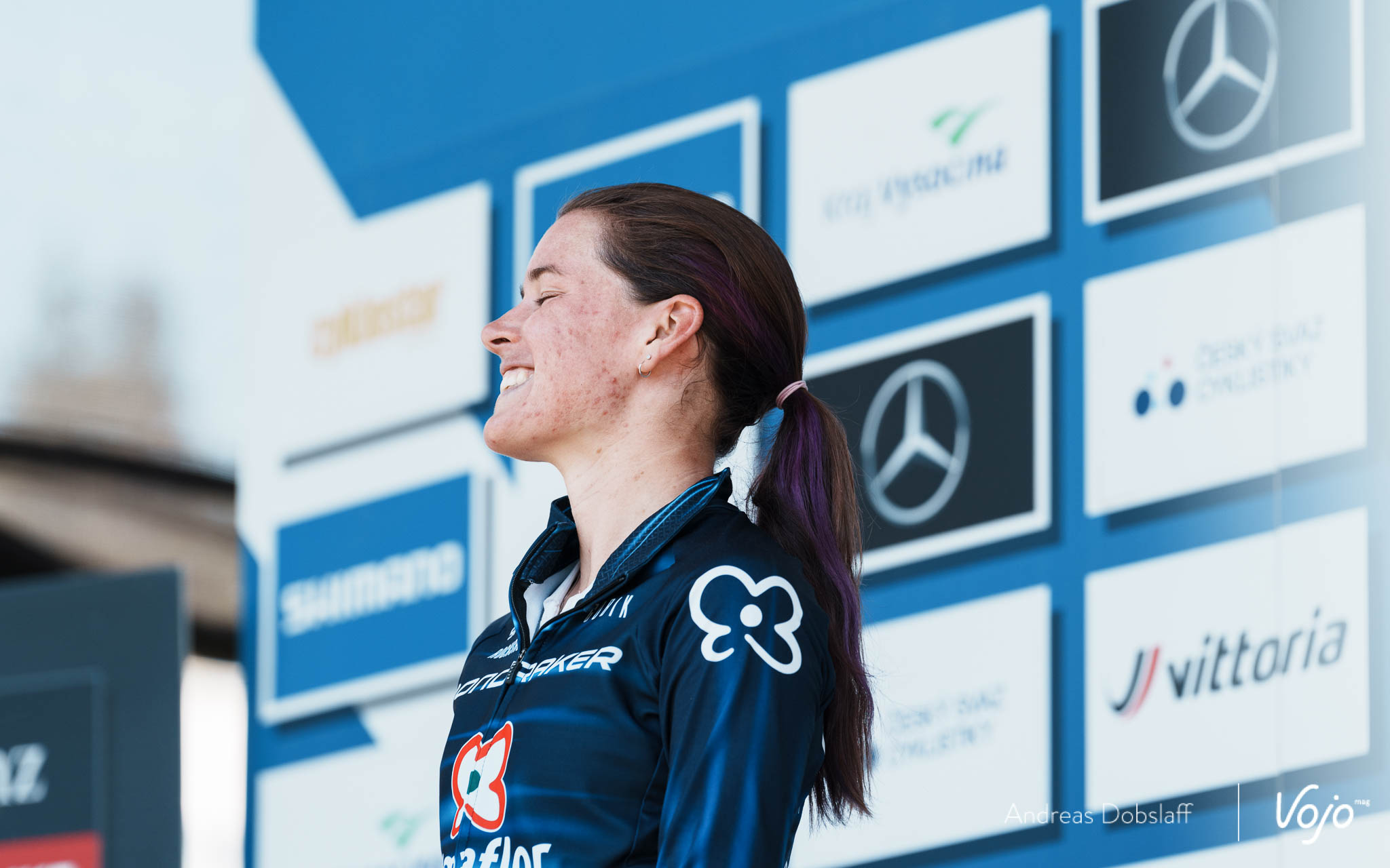 Loana Lecomte prend la deuxième place devant Jenny Rissveds. 3e au Brésil, 4e en Allemagne, 2e ici en République tchèque, la Française ne survole pas la concurrence comme l’an passé mais reste extrêmement régulière et ça paye, puisqu’elle remonte à la deuxième place au classement général. Même constat pour la Suédoise, qui semble en plus avoir trouvé cette année une certaine sérénité, peu importe le résultat ou le déroulé de la course.