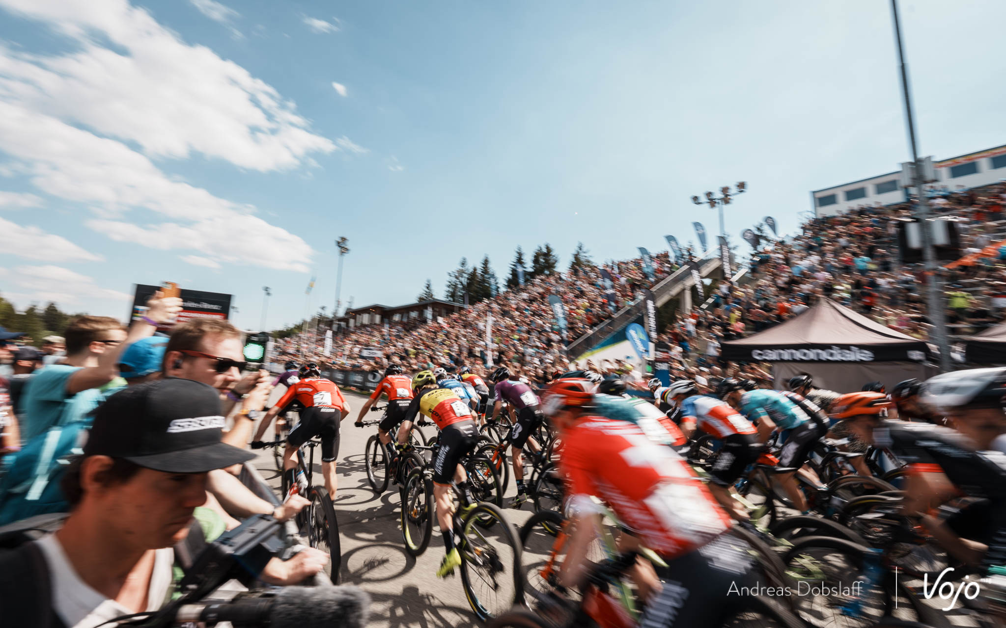 Le célèbre passage sur la pump-track de Nove Mesto, juste avant le retour sur la ligne d’arrivée. Nino Schurter, Titouan Carod ou Mathias Flückiger, choisissez votre style.