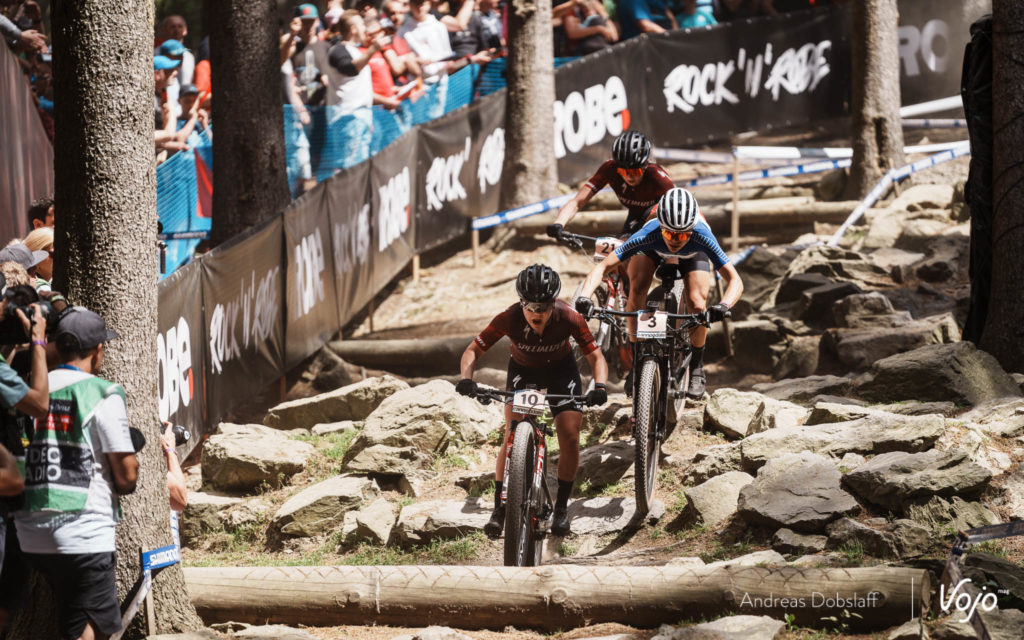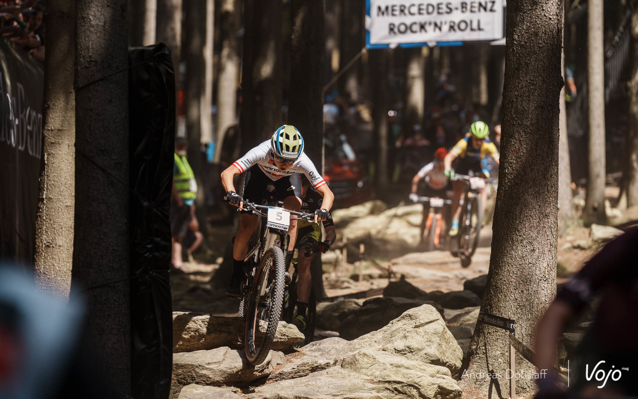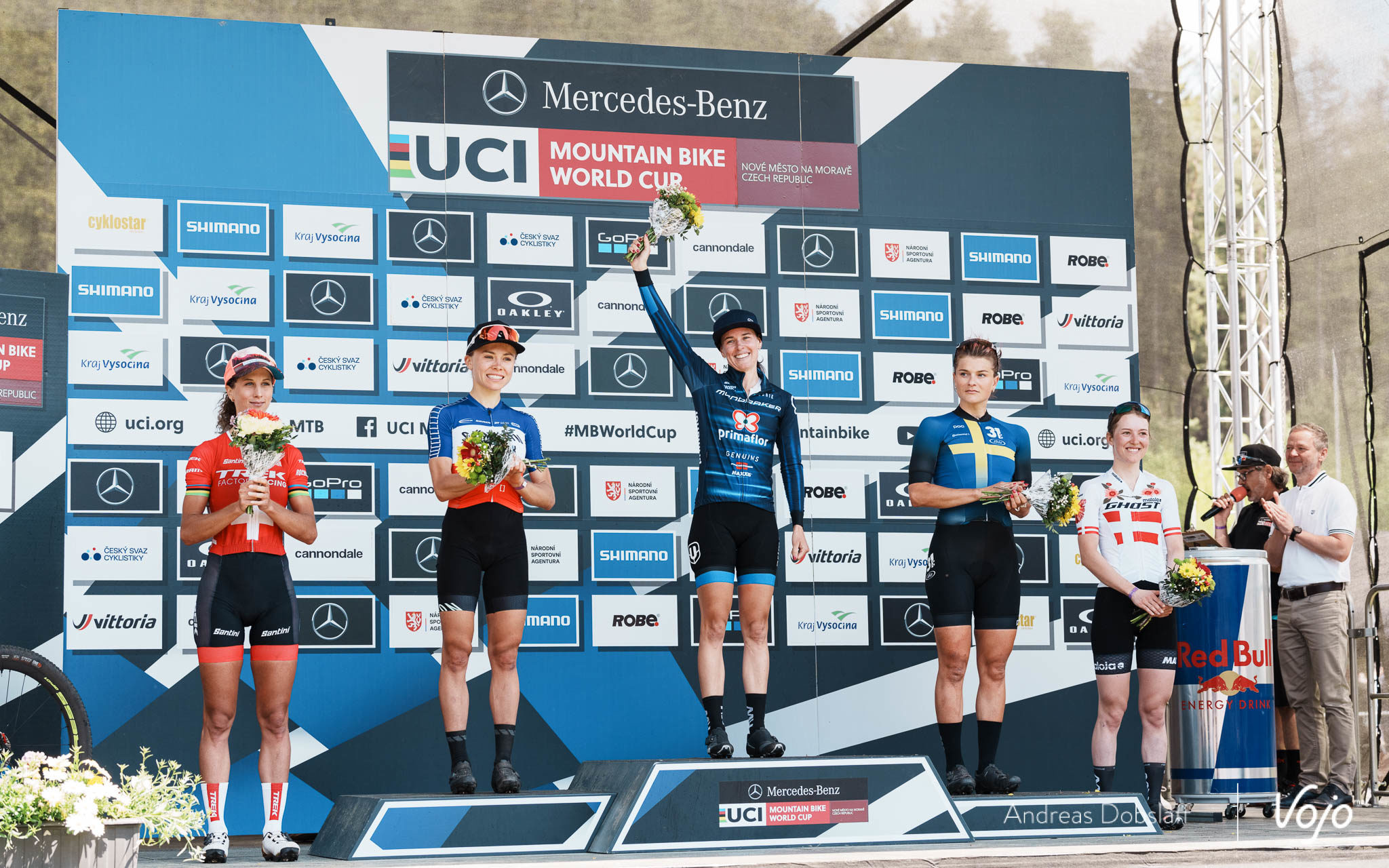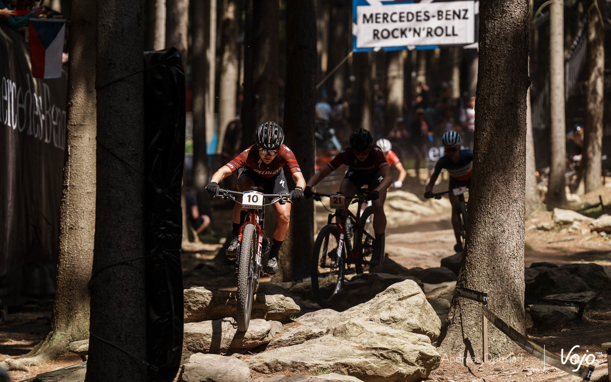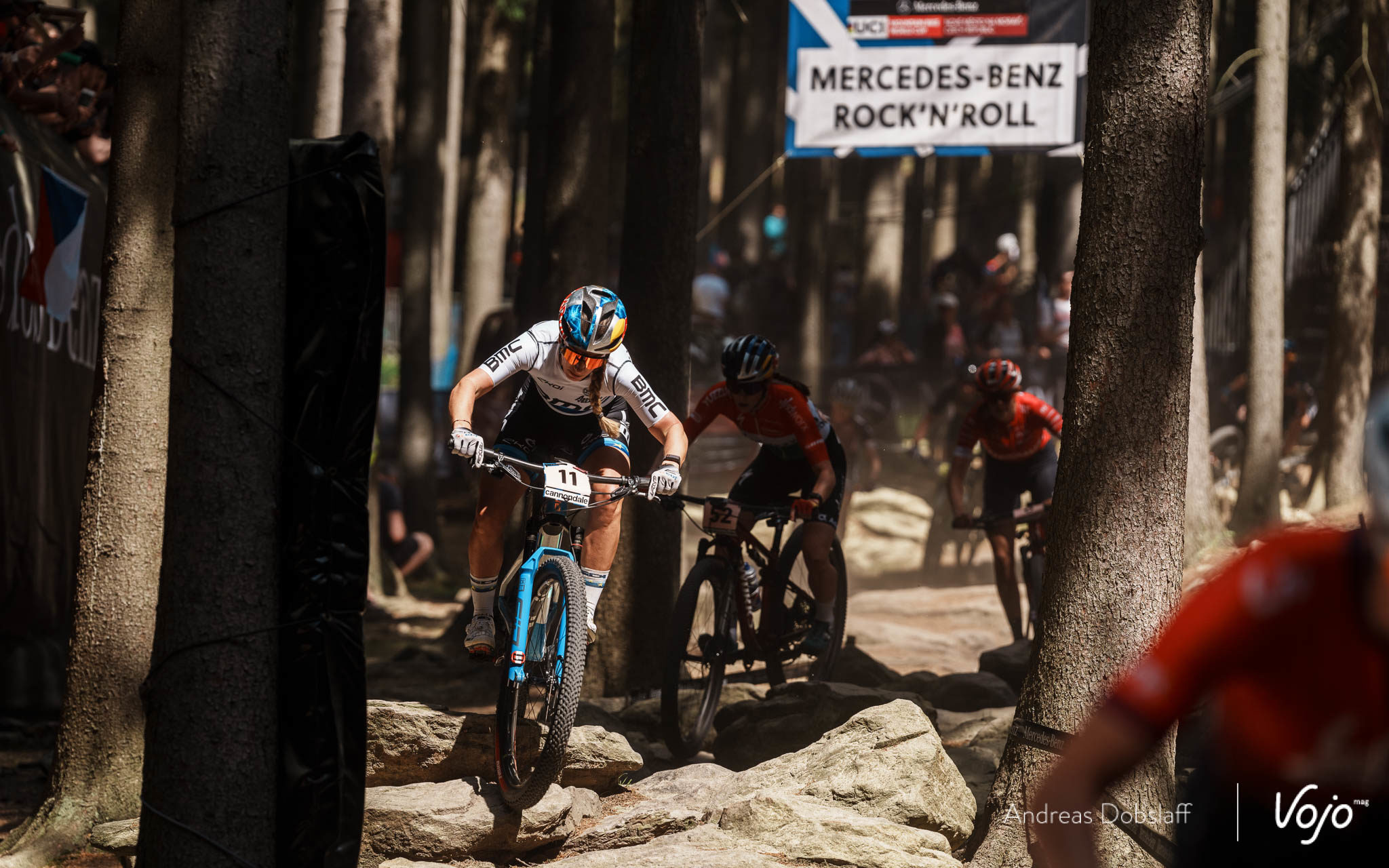 Loana Lecomte prend la deuxième place devant Jenny Rissveds. 3e au Brésil, 4e en Allemagne, 2e ici en République tchèque, la Française ne survole pas la concurrence comme l’an passé mais reste extrêmement régulière et ça paye, puisqu’elle remonte à la deuxième place au classement général. Même constat pour la Suédoise, qui semble en plus avoir trouvé cette année une certaine sérénité, peu importe le résultat ou le déroulé de la course.