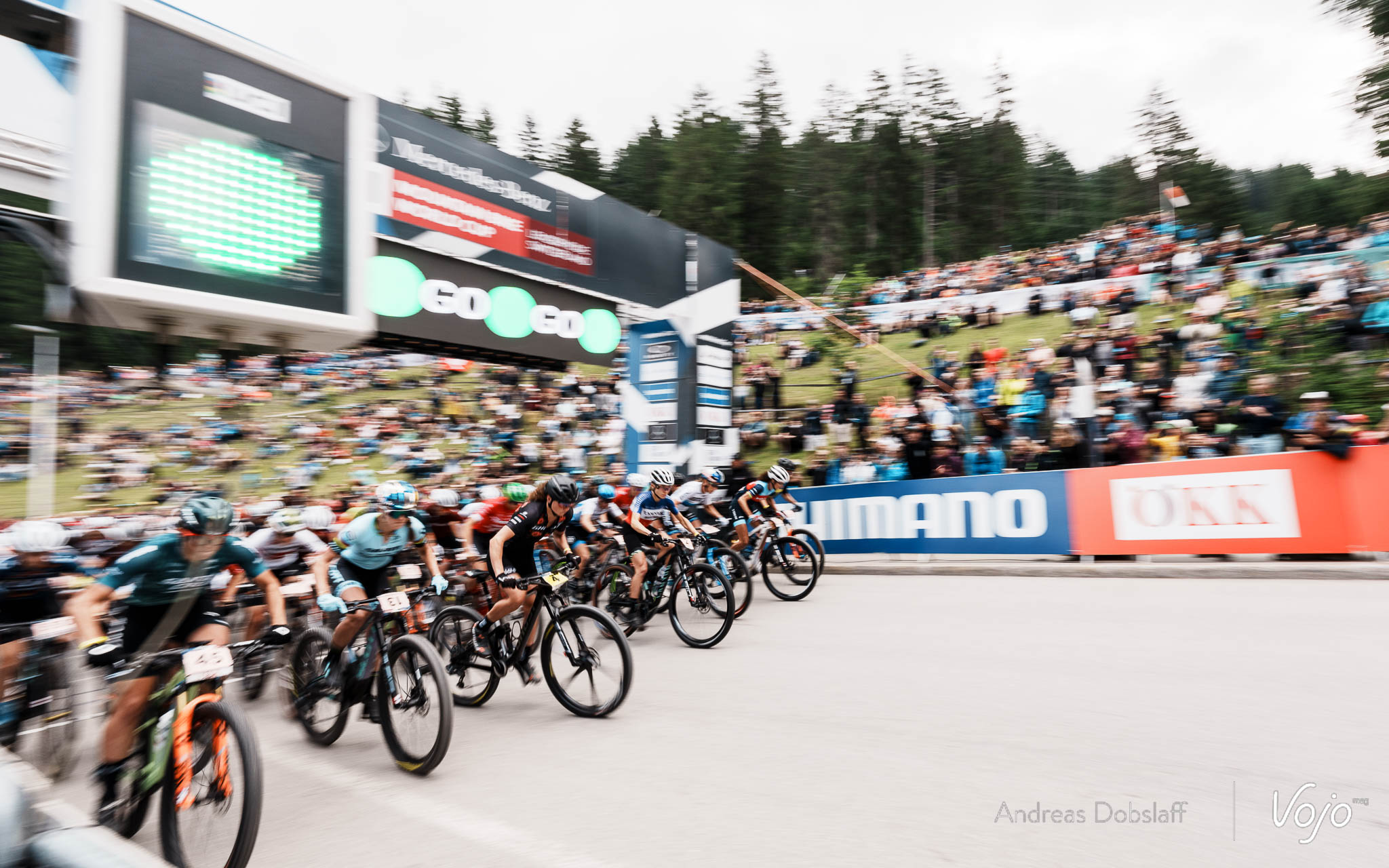 11h05 à Lenzerheide, c’est parti ! Tout à gauche de la ligne de départ, c’est Jenny Rissveds (ici masquée par Jolanda Neff) qui vire en tête et emmène le peloton dans la montée à l’issue de la première ligne droite. A ses côtés, Anne Terpstra et Jolanda Neff.