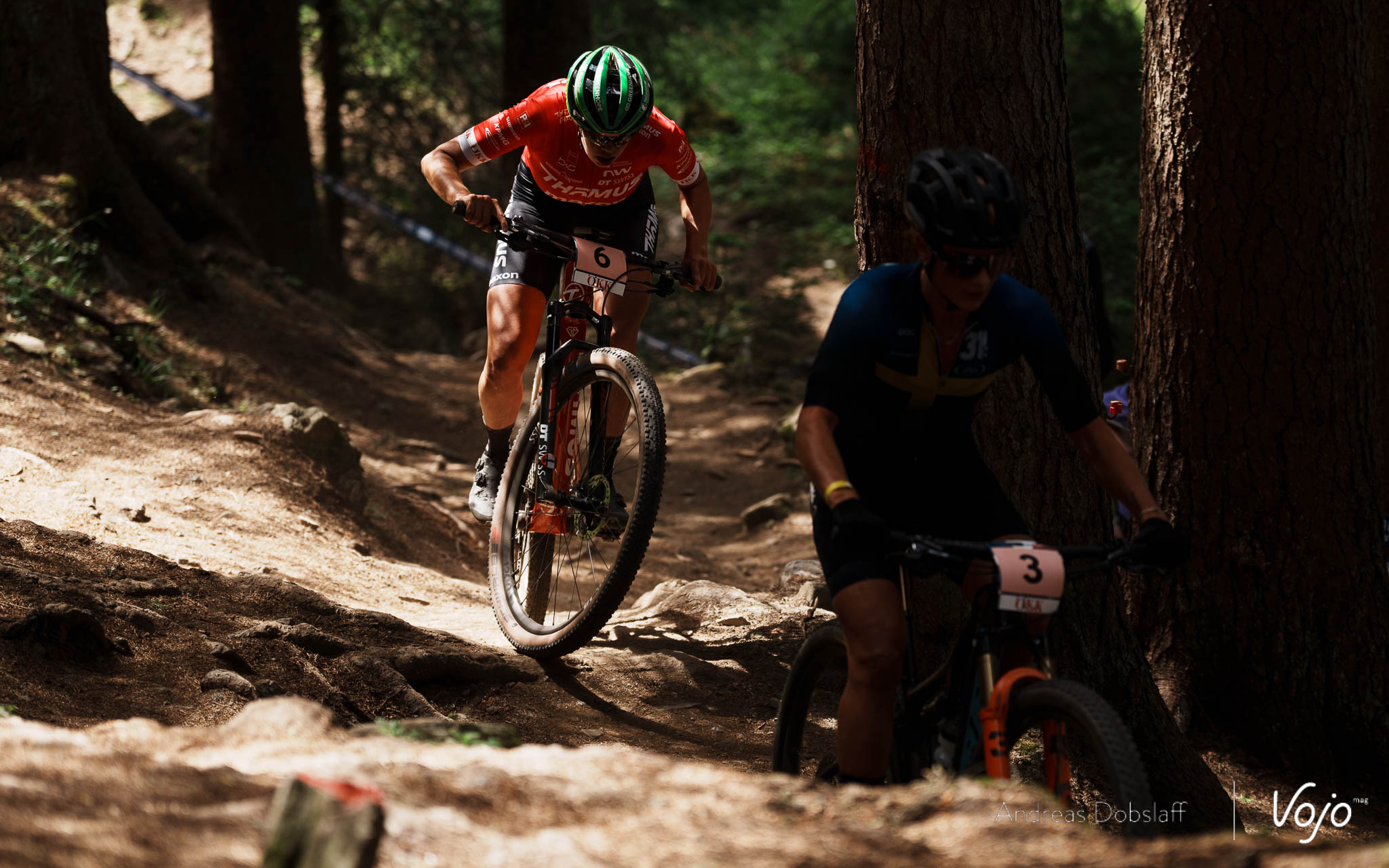 Ce changement de rythme semble difficile à avaler pour Alan Hatherly et Filippo Colombo, qui traînaient déjà en queue de groupe et commencent maintenant à faire l’élastique. Pour Schurter et Flückiger en revanche, cela va faire office de rampe de lancement. Flückiger parvient à dépasser Valero juste avant un passage étroit et accélère aussitôt pour creuser un écart. Nino Schurter a vu le danger mais doit attendre quelques mètres de plus avant de passer à son tour et de se lancer à sa poursuite. Le duel est lancé !