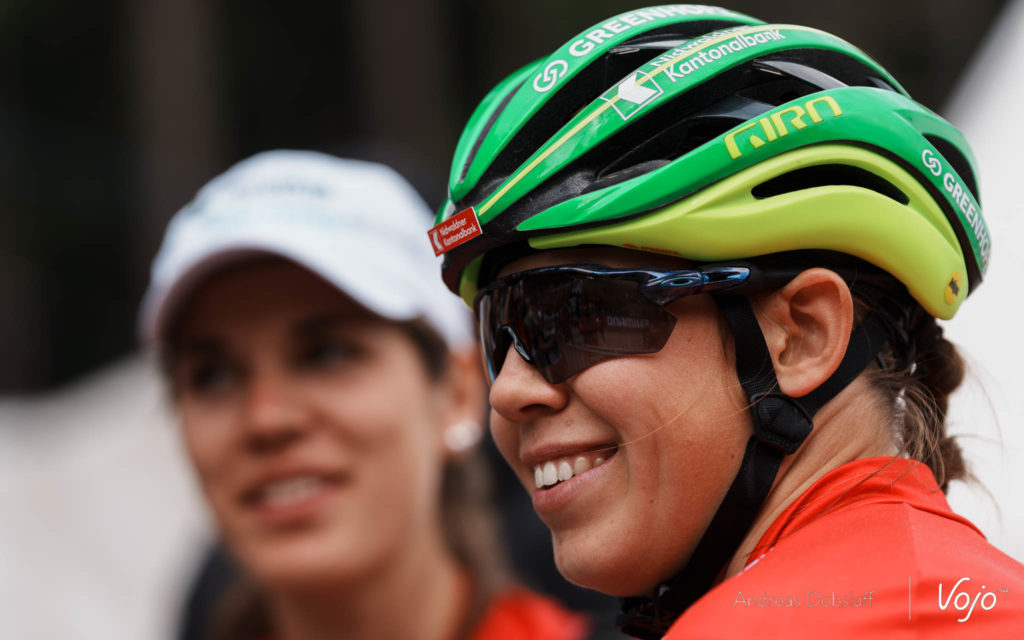 11h05 à Lenzerheide, c’est parti ! Tout à gauche de la ligne de départ, c’est Jenny Rissveds (ici masquée par Jolanda Neff) qui vire en tête et emmène le peloton dans la montée à l’issue de la première ligne droite. A ses côtés, Anne Terpstra et Jolanda Neff.