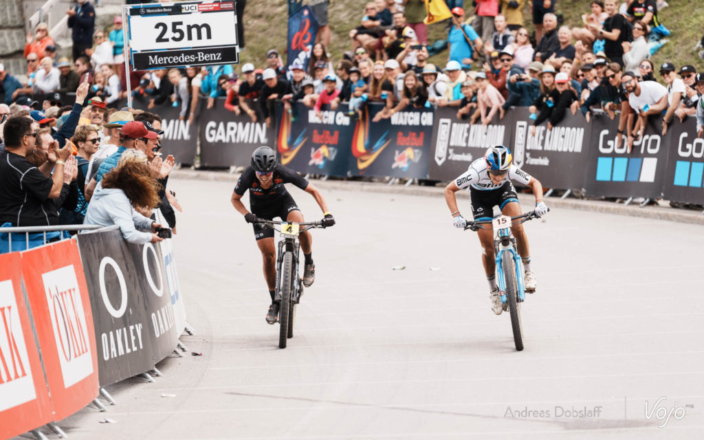 Mais surprise, ce sont Luca Braidot et Alan Hatherly qui ressortent les premiers, plusieurs mètres devant les Suisses ! Que s’est-il passé ? Pas le temps d’y réfléchir, Braidot et Hatherly arrivent déjà au sprint. Braidot lance de loin à l’intérieur mais Hatherly a montré à plusieurs reprises sur les XCC qu’il est un des meilleurs sprinteurs du peloton. Pourra-t-il dépasser l’Italien ?