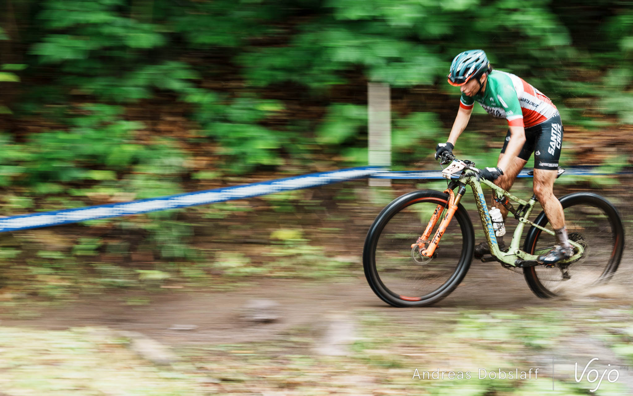 Derrière, loin derrière, Filippo Colombo a été rejoint et le groupe de chasse s’est reformé. C’est maintenant Nino Schurter qui fait l’allure et suivant les sections, ça devient tour à tour dur pour Luca Braidot et Pierre de Froidmont (dans les montées) ou David Valero (dans les descentes).