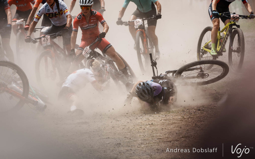 On aurait pu croire qu’avec moins de pilotes (seulement 35 au départ), le départ serait tranquille mais ce ne fut pas le cas. Avant même le premier virage, Emily Batty touche une roue ou s’accroche avec une autre concurrente et chute violemment. Tomber ce n’est jamais drôle, alors à domicile et avec le maillot de championne nationale sur les épaules… L’accident survient en milieu de peloton et si certaines y échappent de peu, telle Haley Batten (tout à gauche sur la première photo), d’autres comme Lucie Urruty ou Sidney McGill (plaque 64) ne peuvent l’éviter.
