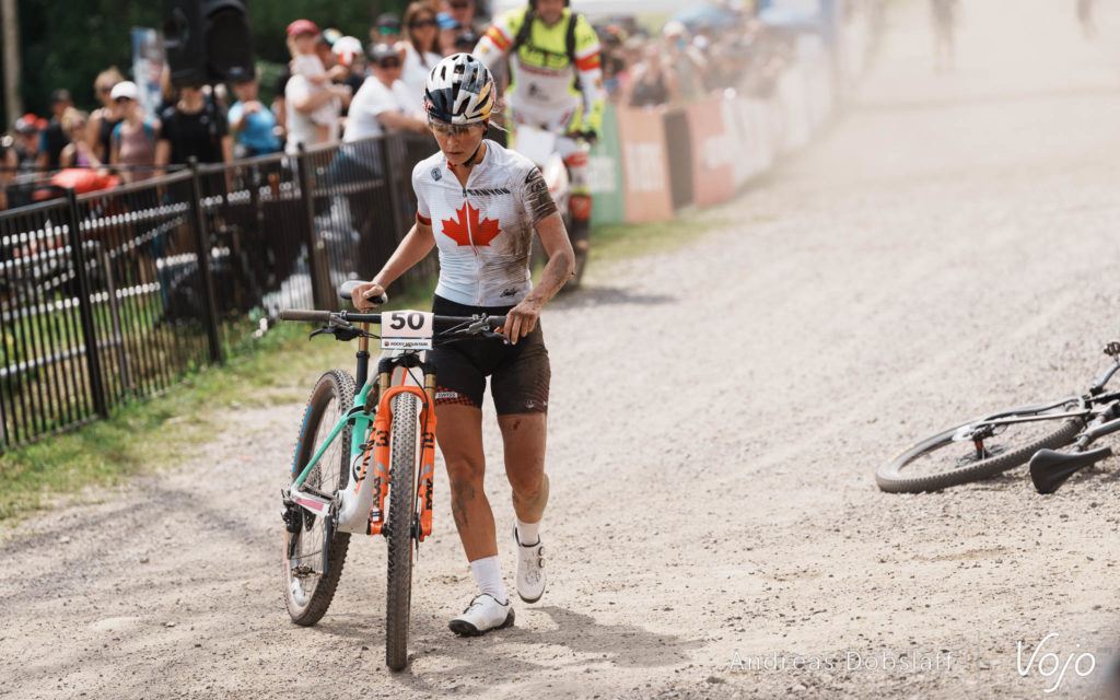 Tout le monde repartira mais pendant ce temps, la course ne s’est pas arrêtée. Au Mont-Sainte-Anne, la course compte cette année deux start-loops (le tracé du XCC, en l’occurence) et c’est Gwendalyn Gibson qui emmène le peloton dans la première.