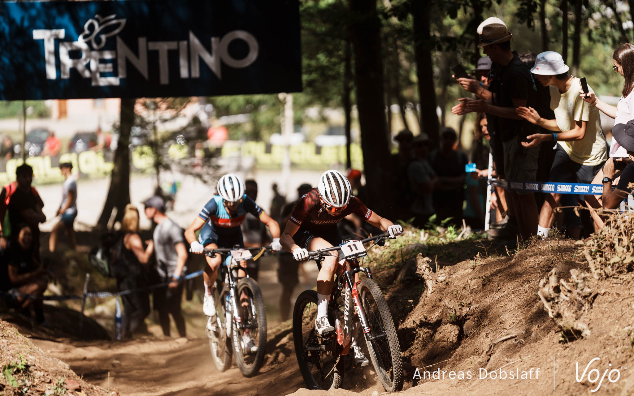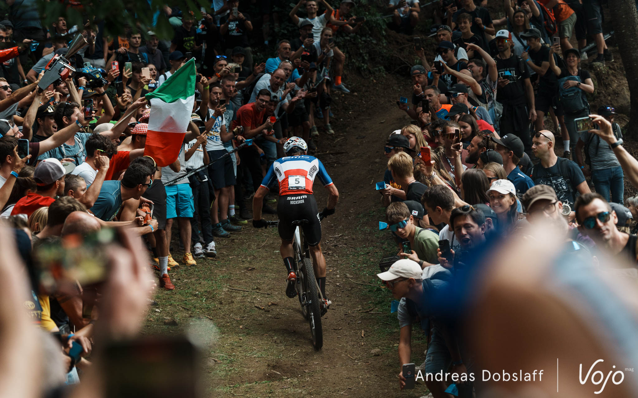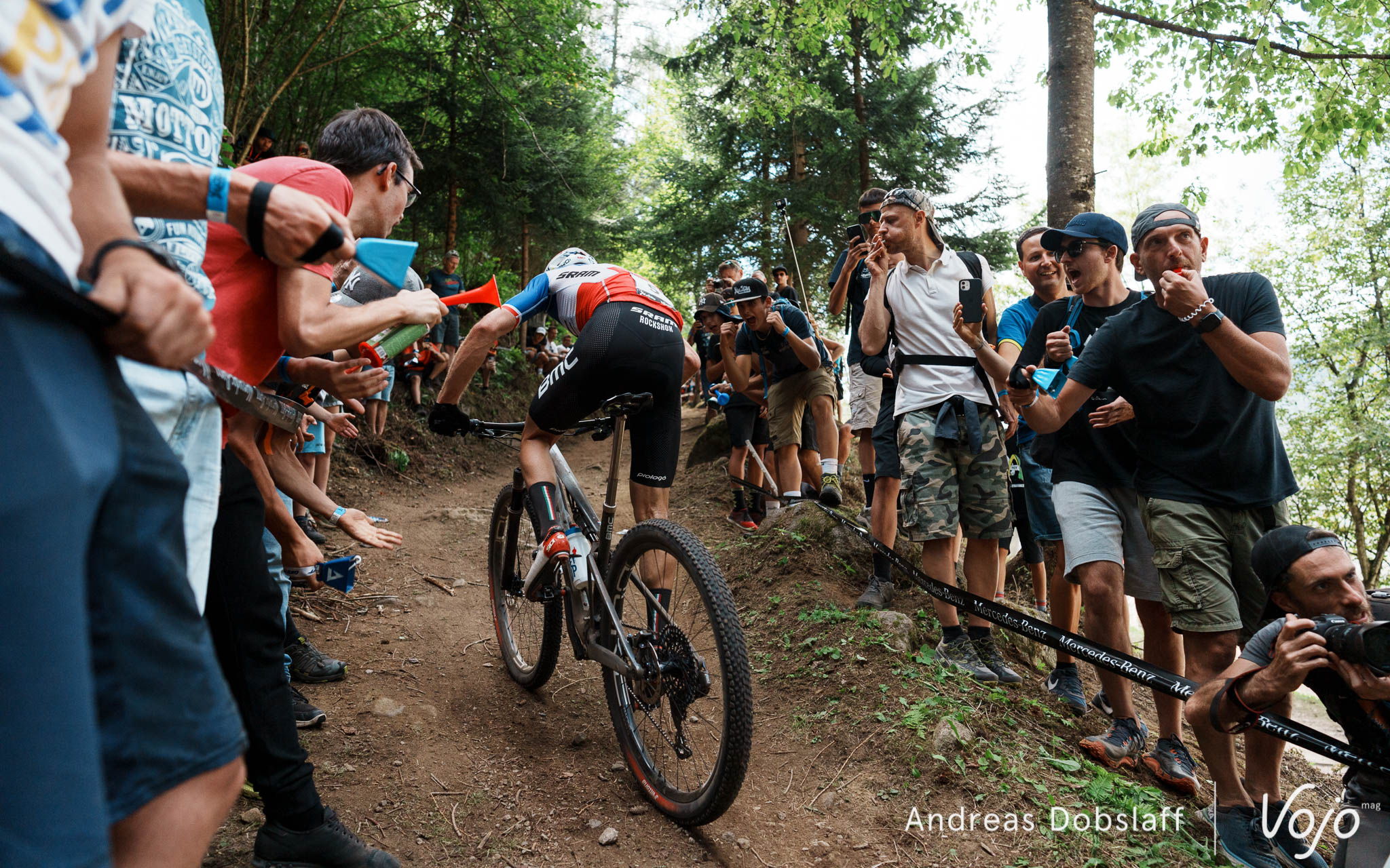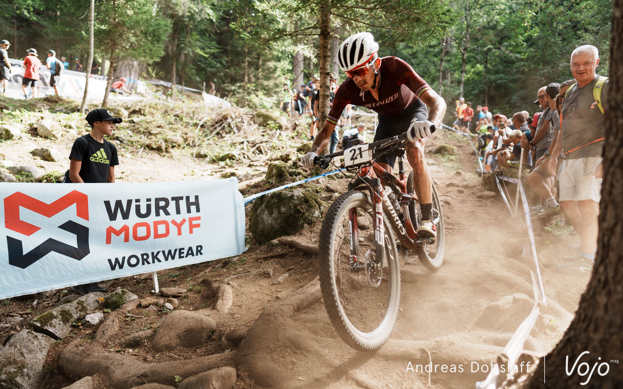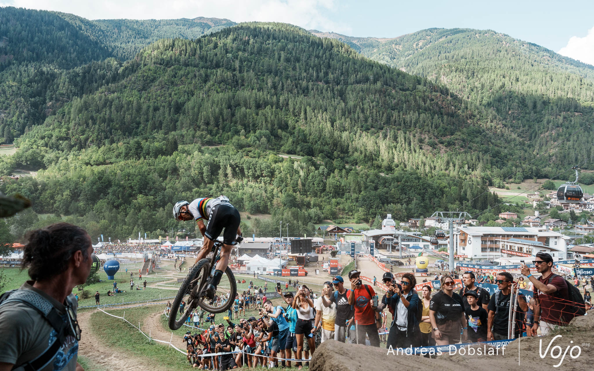 Il faut dire que le Suisse est particulièrement encouragé et les « Allez Nino » fusent depuis les bords du parcours : après tout, la Suisse et le canton des Grisons, autrement dit les terres de Schurter, sont à moins de 2 h de route. Si le public des Gets était du genre (très) bruyant et démonstratif, celui de Val di Sole n’a rien à lui envier !
