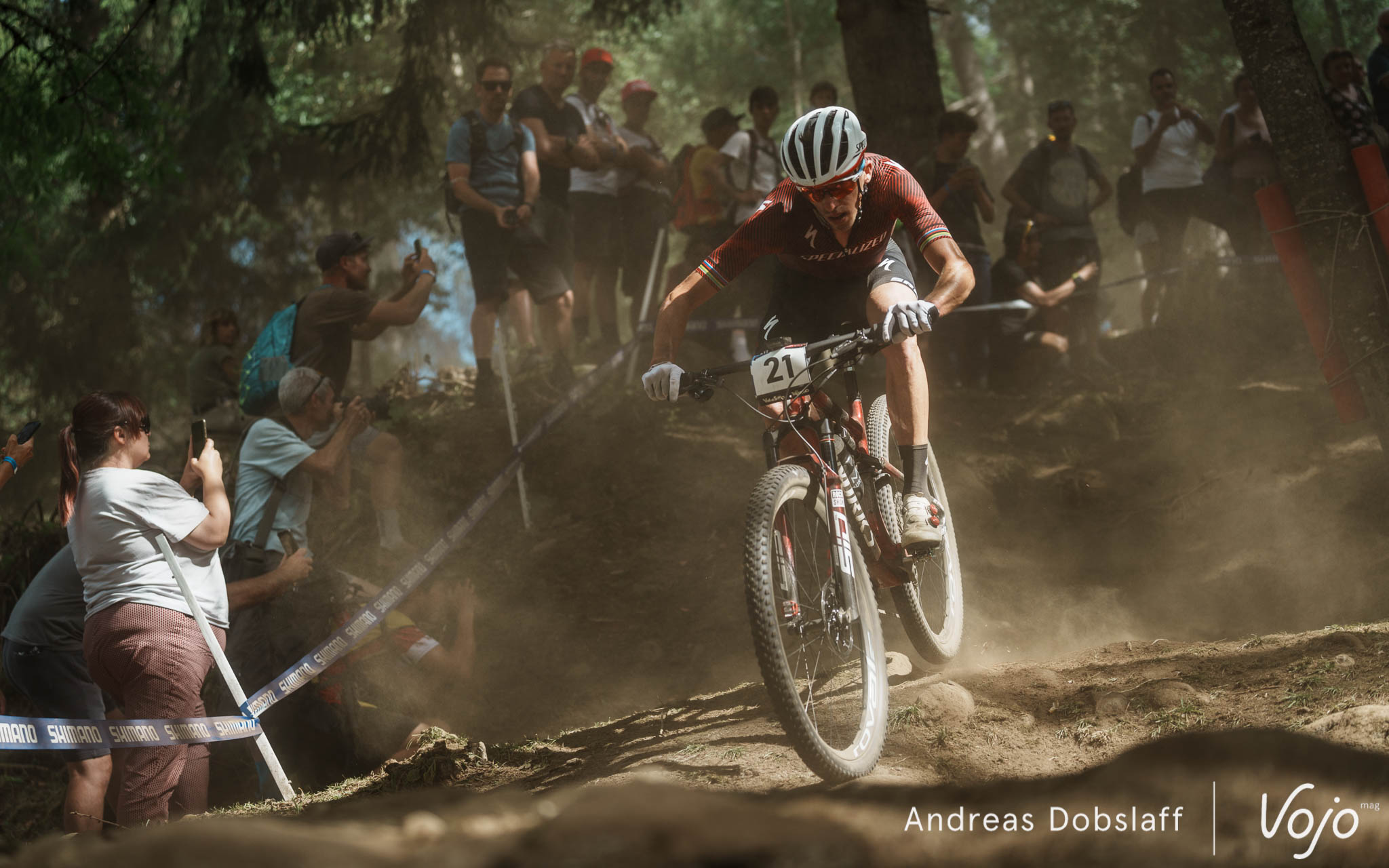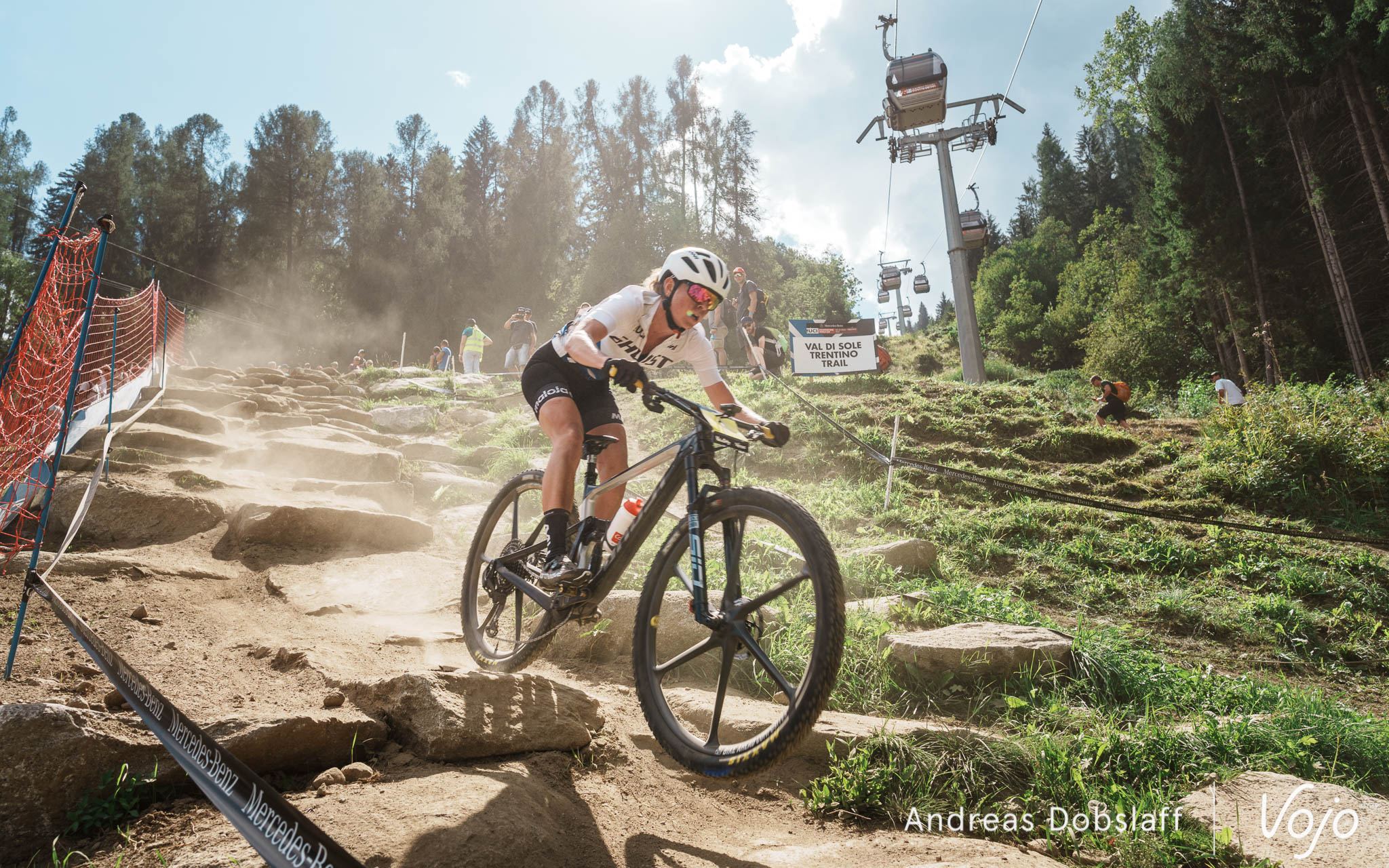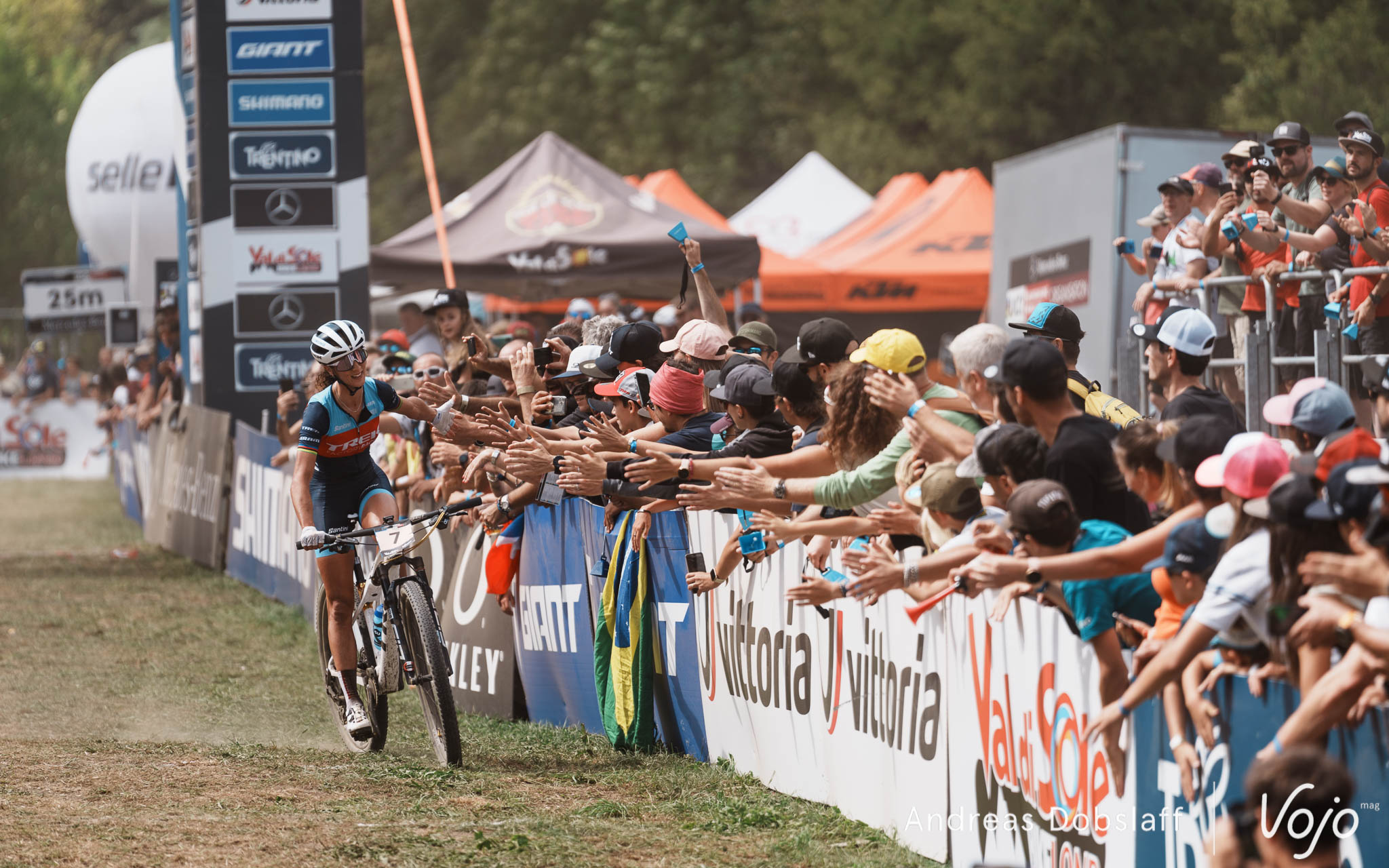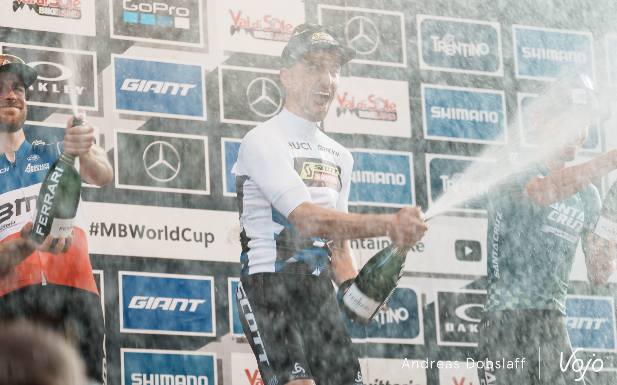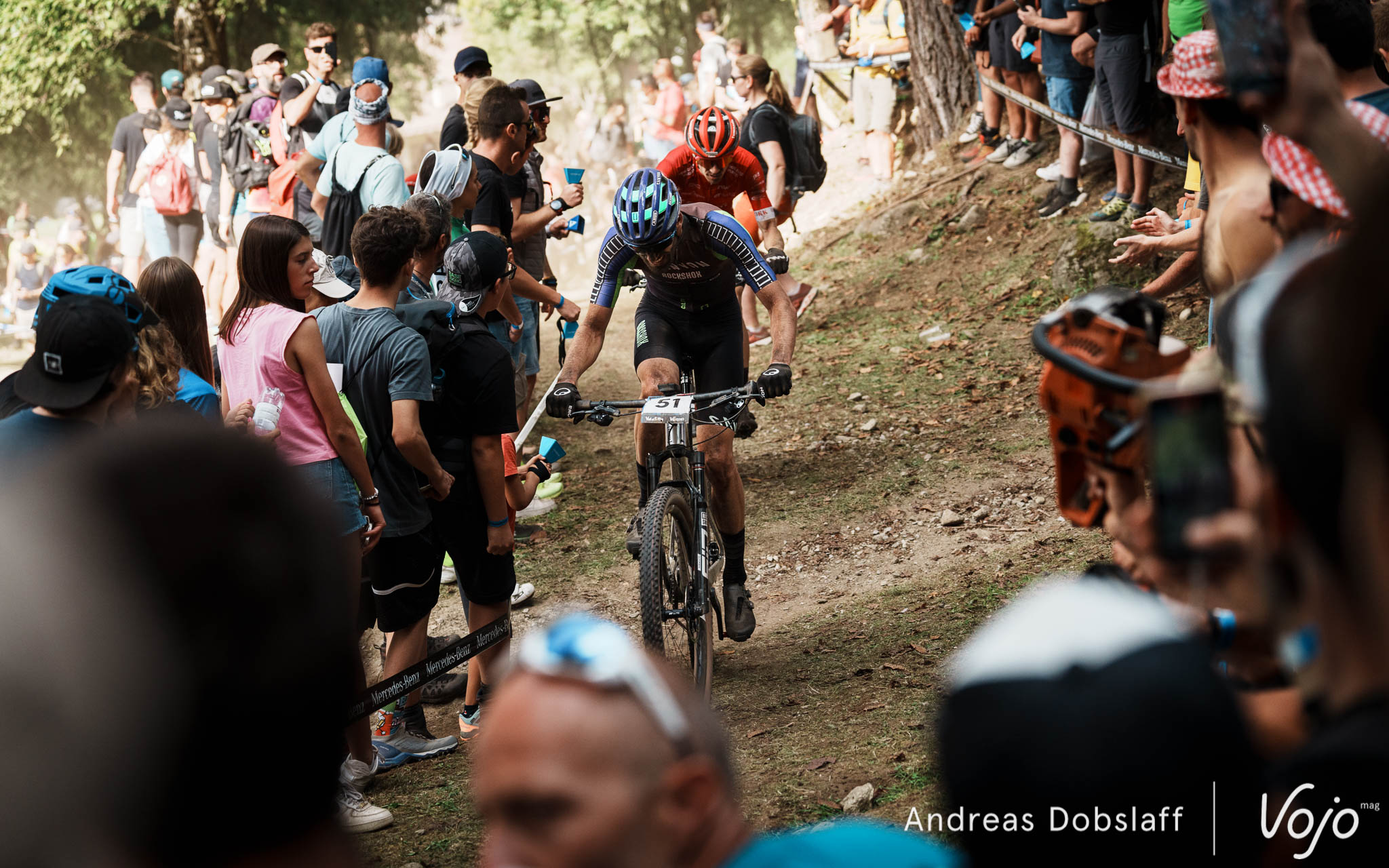 Il faut dire que le Suisse est particulièrement encouragé et les « Allez Nino » fusent depuis les bords du parcours : après tout, la Suisse et le canton des Grisons, autrement dit les terres de Schurter, sont à moins de 2 h de route. Si le public des Gets était du genre (très) bruyant et démonstratif, celui de Val di Sole n’a rien à lui envier !