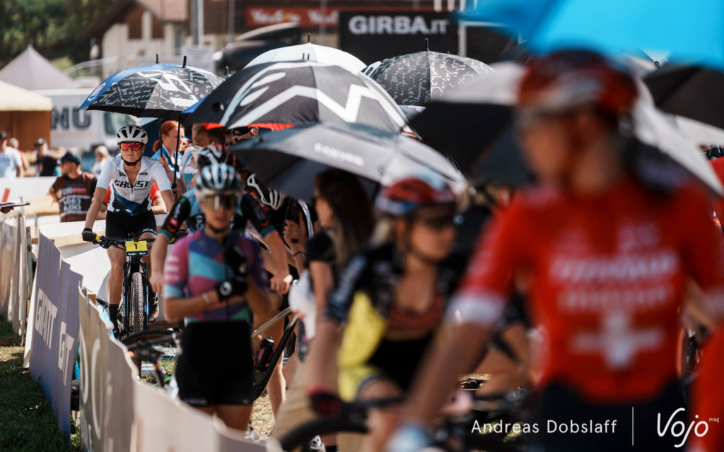 C’est parti ! (Presque) comme d’habitude, c’est Jolanda Neff qui prend le meilleur départ, cette fois suivie par Gwendalyn Gibson (à gauche de l’image, entre Savilia Blunk et Martina Berta). En revanche, Pauline Ferrand-Prévot a manqué son envol et se fait un peu enfermer.