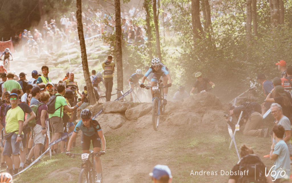 En attendant, la course continue et ses concurrentes ont d’autres plans. Au pied du podium sur « ses » championnats du monde, Loana Lecomte aimerait bien retrouver le chemin de la victoire et comme à son habitude, elle tente de s’échapper dès le début du premier tour. Néanmoins, ses adversaires savent qu’il ne faut pas lui laisser cette marge de manœuvre et Pauline Ferrand-Prévot veille au grain. Seulement 7e sur la ligne à la fin de la start-loop, elle fait rapidement l’effort pour revenir dans la roue de sa jeune compatriote avant les premiers passages techniques.