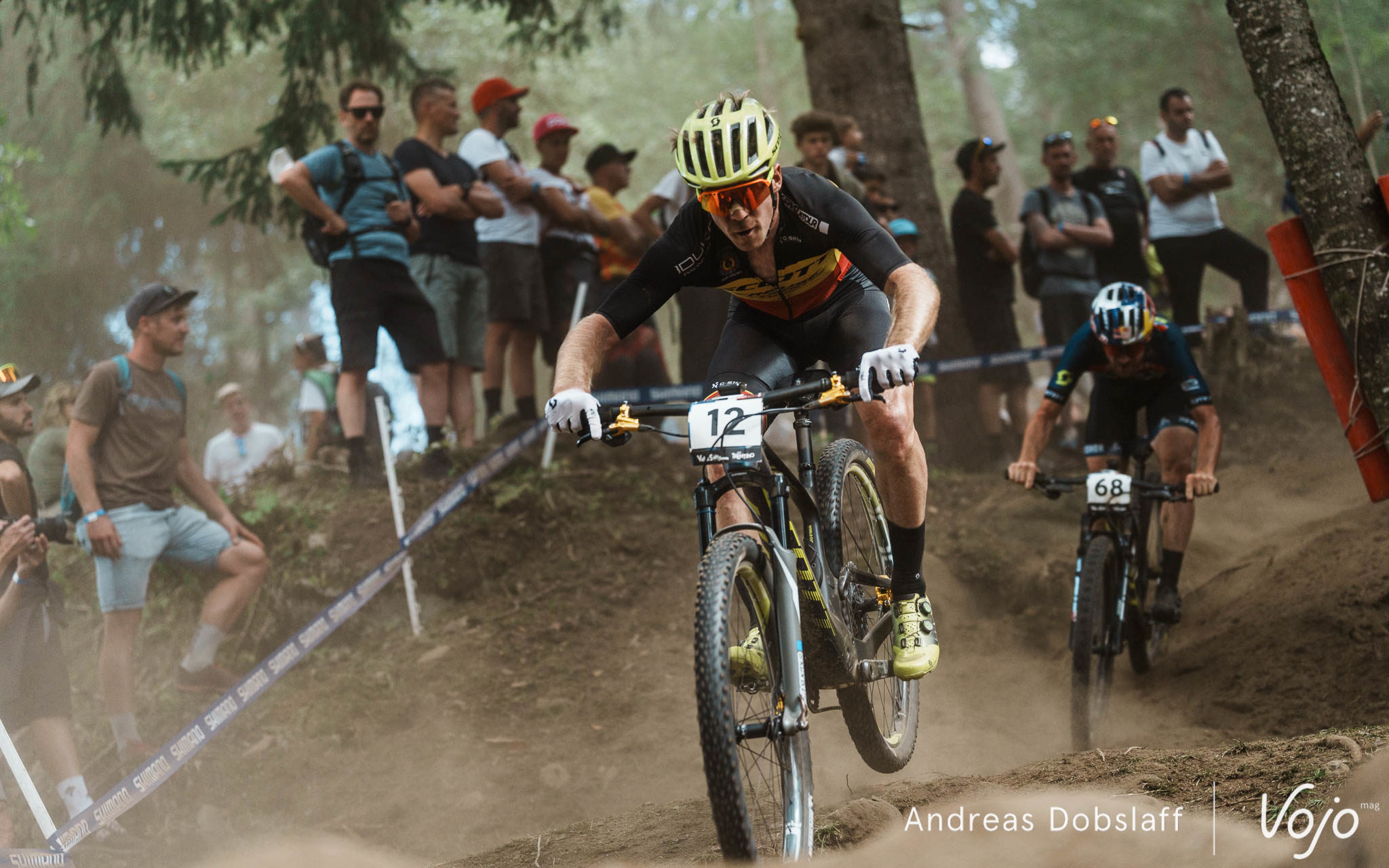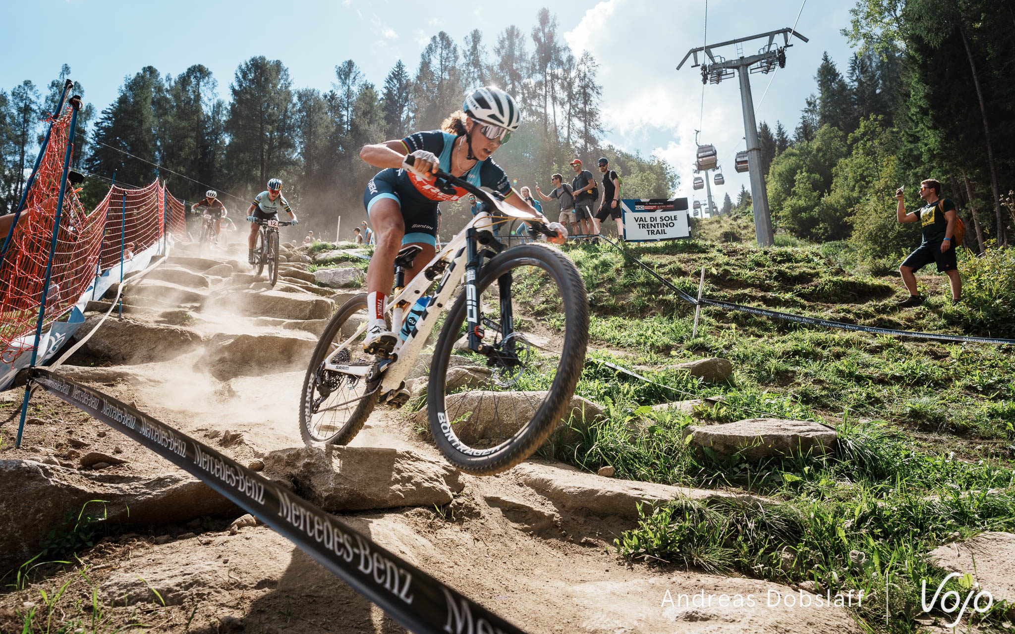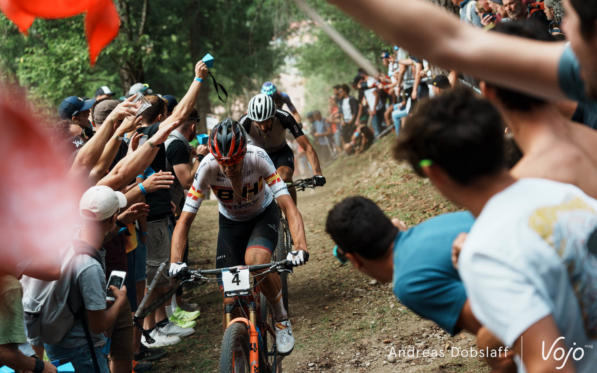Il faut dire que le Suisse est particulièrement encouragé et les « Allez Nino » fusent depuis les bords du parcours : après tout, la Suisse et le canton des Grisons, autrement dit les terres de Schurter, sont à moins de 2 h de route. Si le public des Gets était du genre (très) bruyant et démonstratif, celui de Val di Sole n’a rien à lui envier !
