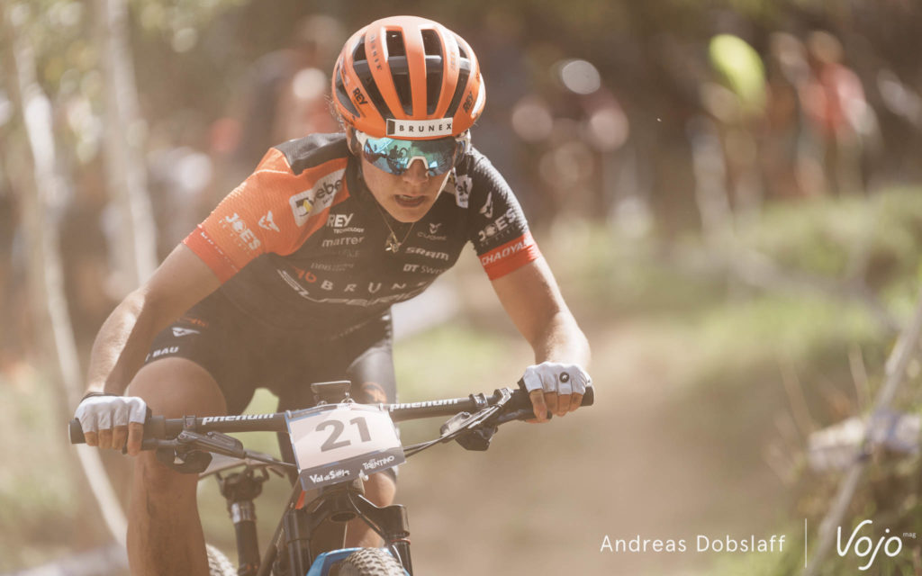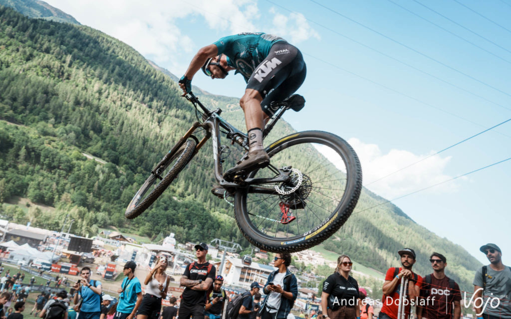 Retour aux avant-postes, où les choses ont bougé ! Titouan Carod a fini par faire craquer Alan Hatherly et Jordan Sarrou dans le deuxième tour et fait depuis cavalier seul avec une avance qui augmente doucement mais sûrement. Pourra-t-il tenir jusqu’au bout ? Son raid solitaire du Mont-Sainte-Anne est encore dans les mémoires mais le circuit de Val di Sole n’a pas exactement la même physionomie et aujourd’hui on roule dans la poussière, pas dans la boue.