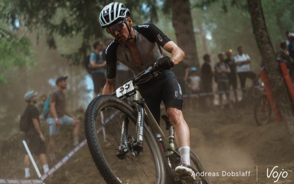 Derrière, ça défile vite, très vite. Luca Schwarzbauer, Henrique Avancini, Thomas Litscher, Vlad Dascalu, Nino Schurter, Victor Koretzky, Joshua Dubau, Luca Braidot… Après avoir raté sa pédale au départ et être descendu autour de la 15e position, Nino Schurter profite des sections larges et rapides de la start-loop pour remonter dans le peloton avant les premiers passages techniques.