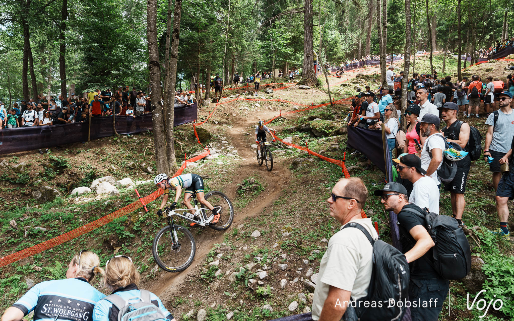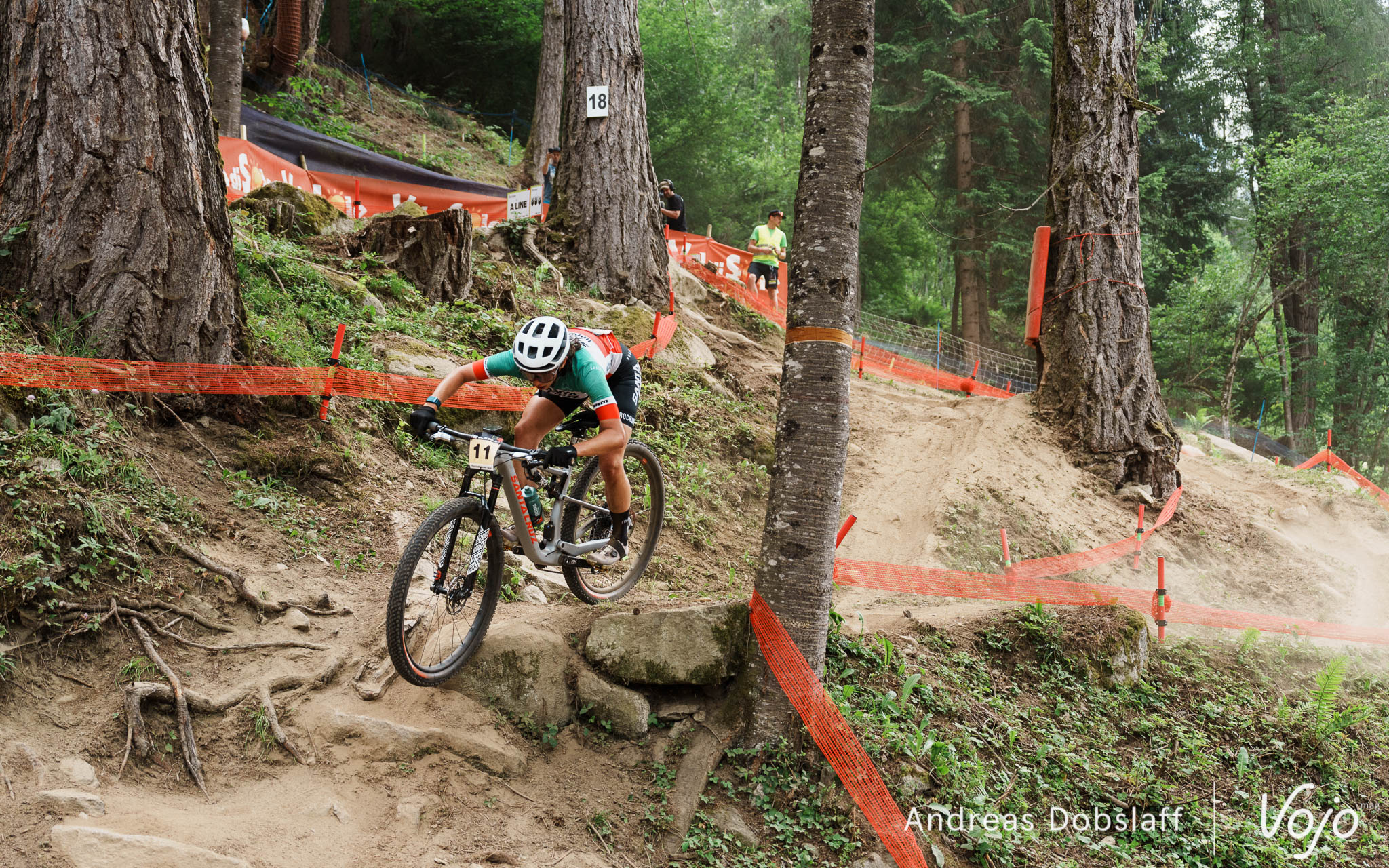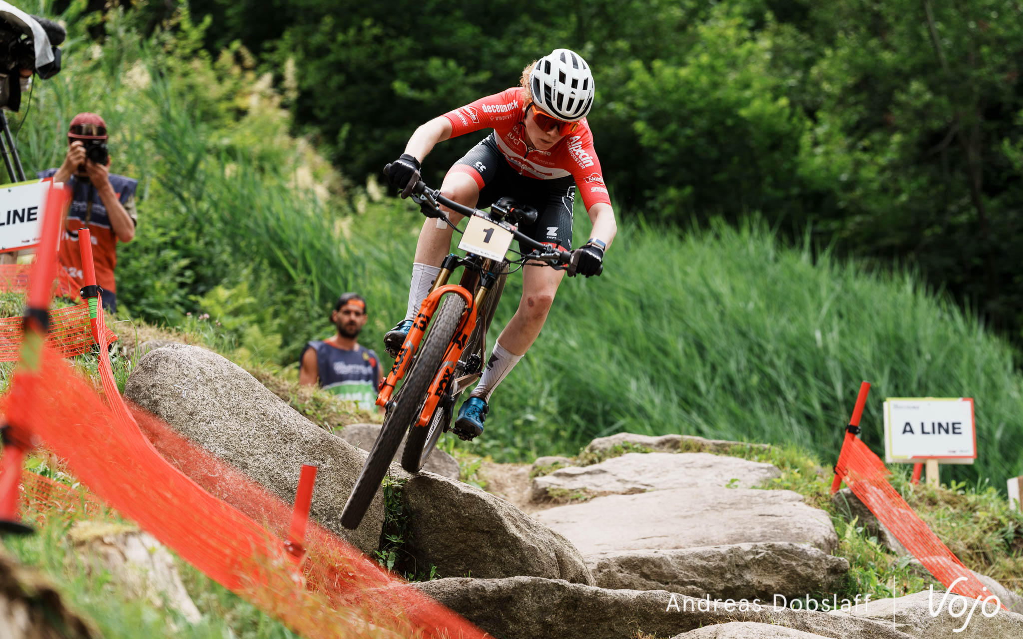 C’est dans un nuage de poussière que les femmes se sont élancées pour les cinq tours de cette épreuve olympique de Val di Sole, avec un super départ de Jolanda Neff et Laura Stigger. La première portion de ce circuit italien est assez large avec peu de dénivelé, ce qui permet aux pilotes parties en deuxième ligne de se replacer facilement.