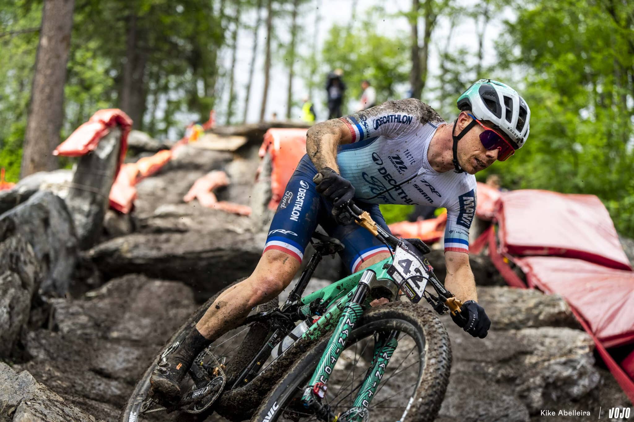 Les chutes vont s’enchaîner sur ce terrain piégeur, avec coup sur coup Tom Pidcock et Lars Forster. Si le pilote Ineos Grenadier ne semble pas affecté, Lars Forster semble lui plus marqué et se fait doubler par plusieurs pilotes dont Jordan Sarrou (7e à ce stade).