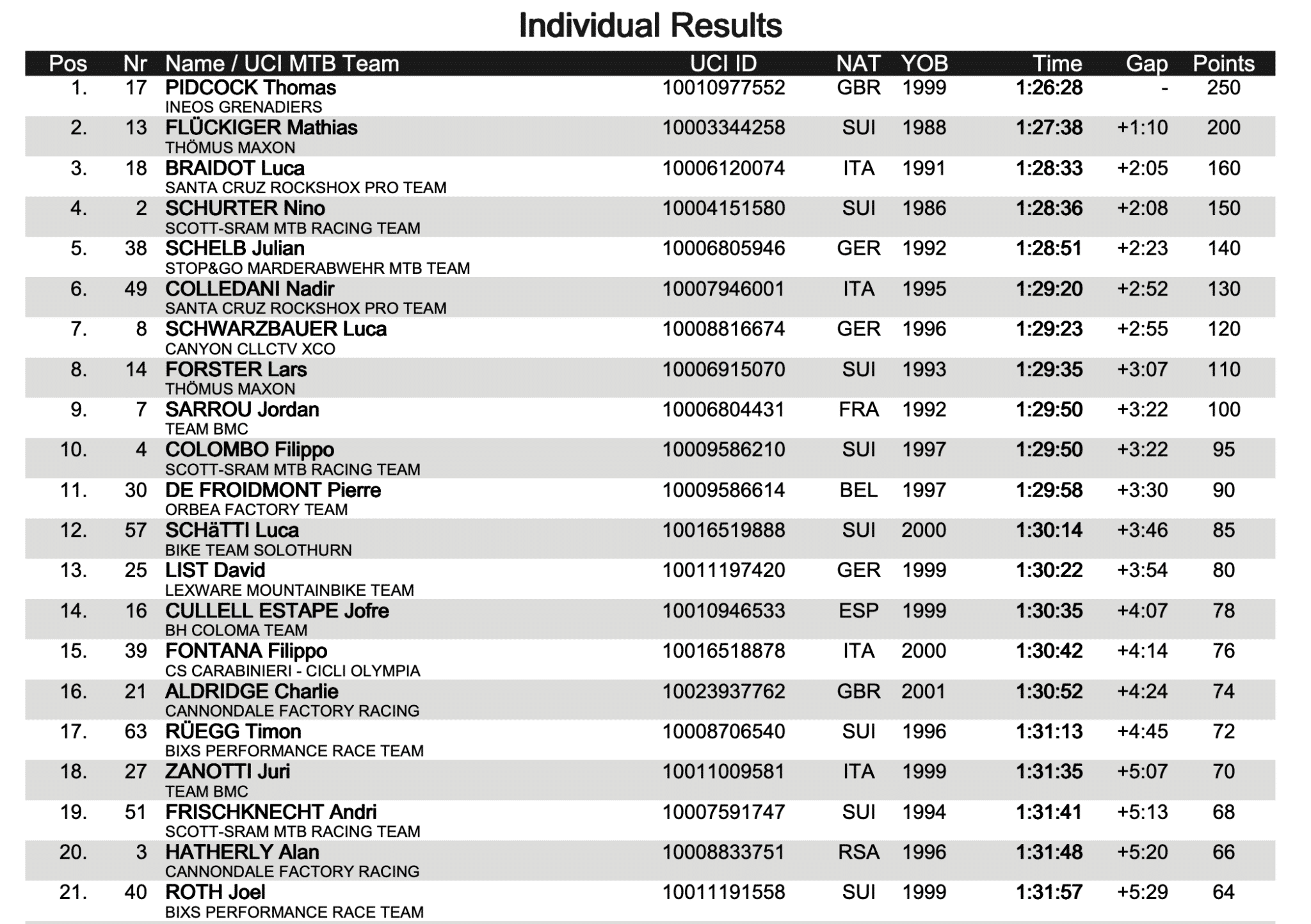 C’est à un duel entre Luca Braidot et Nino Schurter que l’on assiste pour la troisième place. L’Italien parviendra finalement à prendre l’ascendant sur le Suisse au sprint. Sans pouvoir rivaliser dans le dernier tour, Julian Schelb se classe 5e au terme d’une très belle course. Notons que la sélection allemande pour les JO s’effectuait sur cette course, jolie opération de la part du pilote du team Stop&Go MTB.
