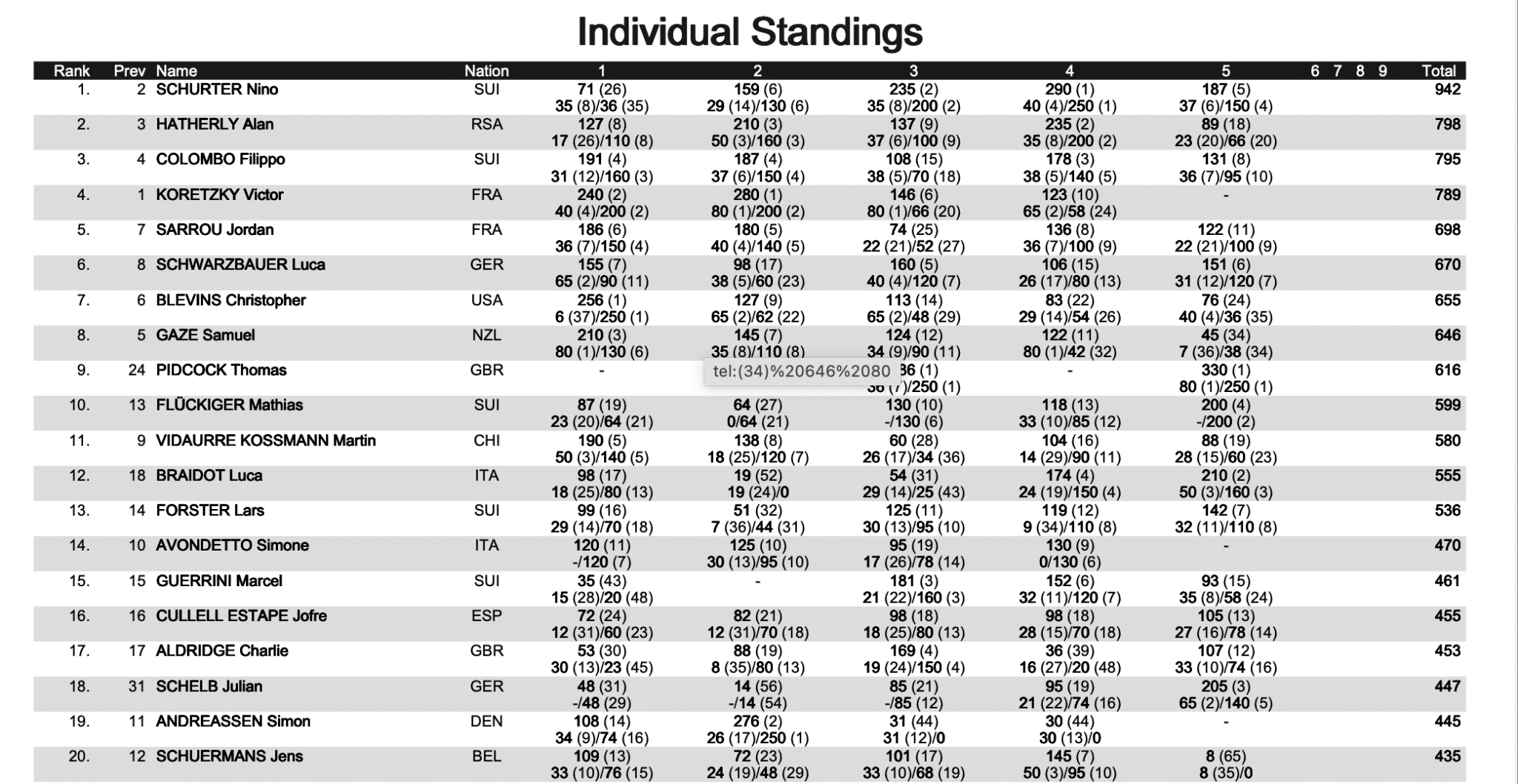 Le top 10 est complété par Nadir Colledani (6e), Luca Schwarzbauer (7e), Lars Forster (8e), Jordan Sarrou (9e) et Filippo Colombo. Le Belge Pierre de Froidmont termine aux portes du top 10 (11e).