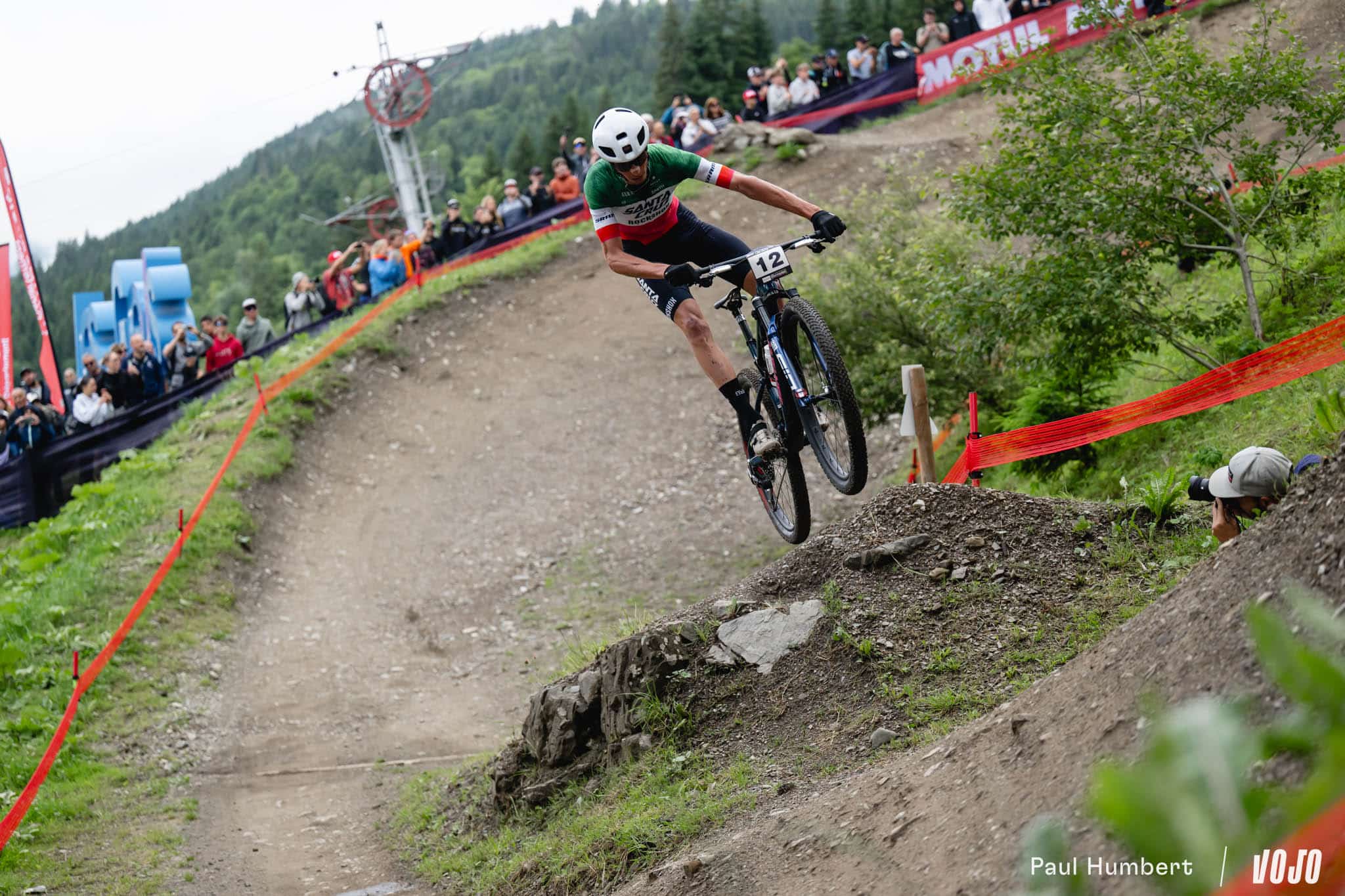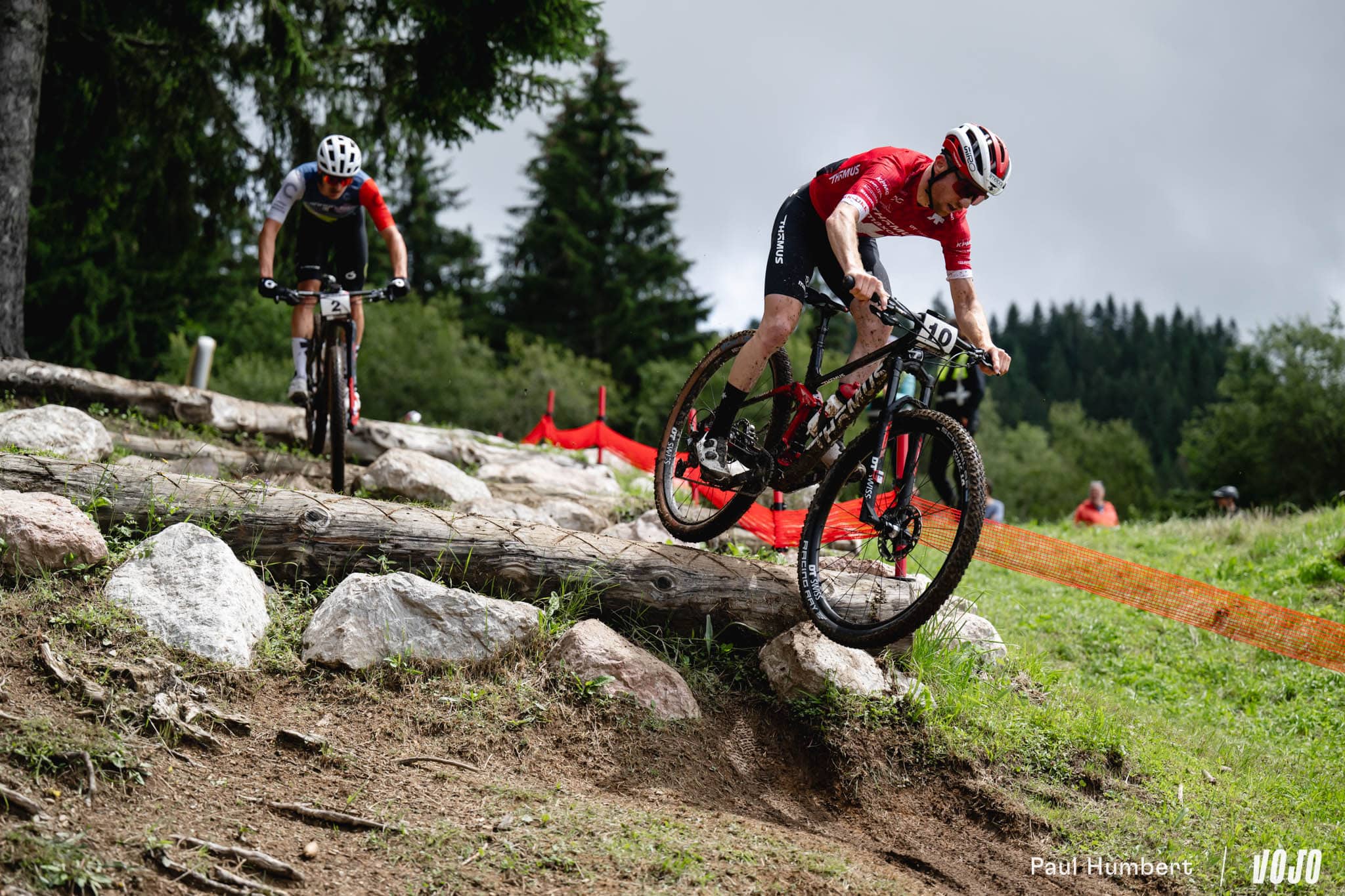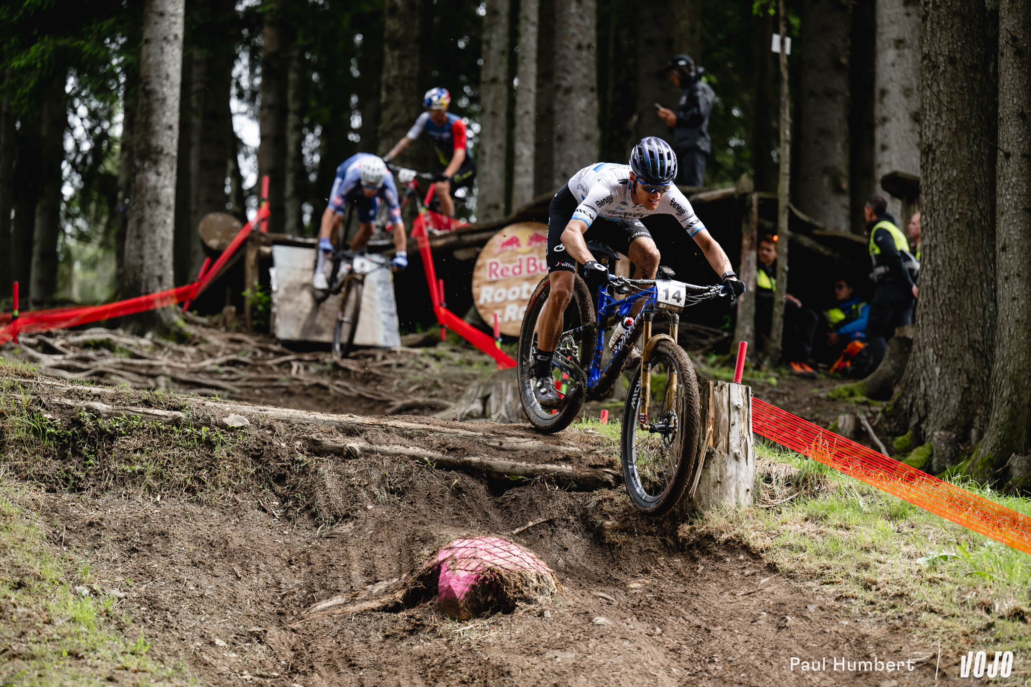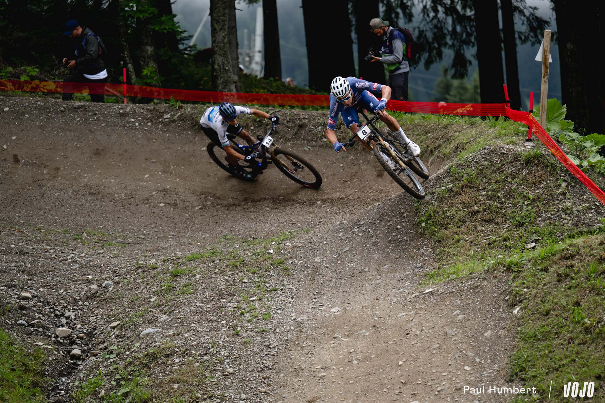 Si Puck Pieterse faisait figure de grande favorite chez les femmes quelques heures plus tôt (lire XCO Femmes : Pieterse survole l’épreuve), la course apparaissait plus ouverte chez les hommes en l’absence, là aussi, de quelques uns des meilleurs pilotes du plateau (Jordan Sarrou et Victor Koretzky, Nino Schurter, Tom Pidcock…). Pour Luca Braidot, c’était visiblement une occasion en or : dès le deuxième tour, le champion d’Italie attaque et tente sa chance en solitaire.