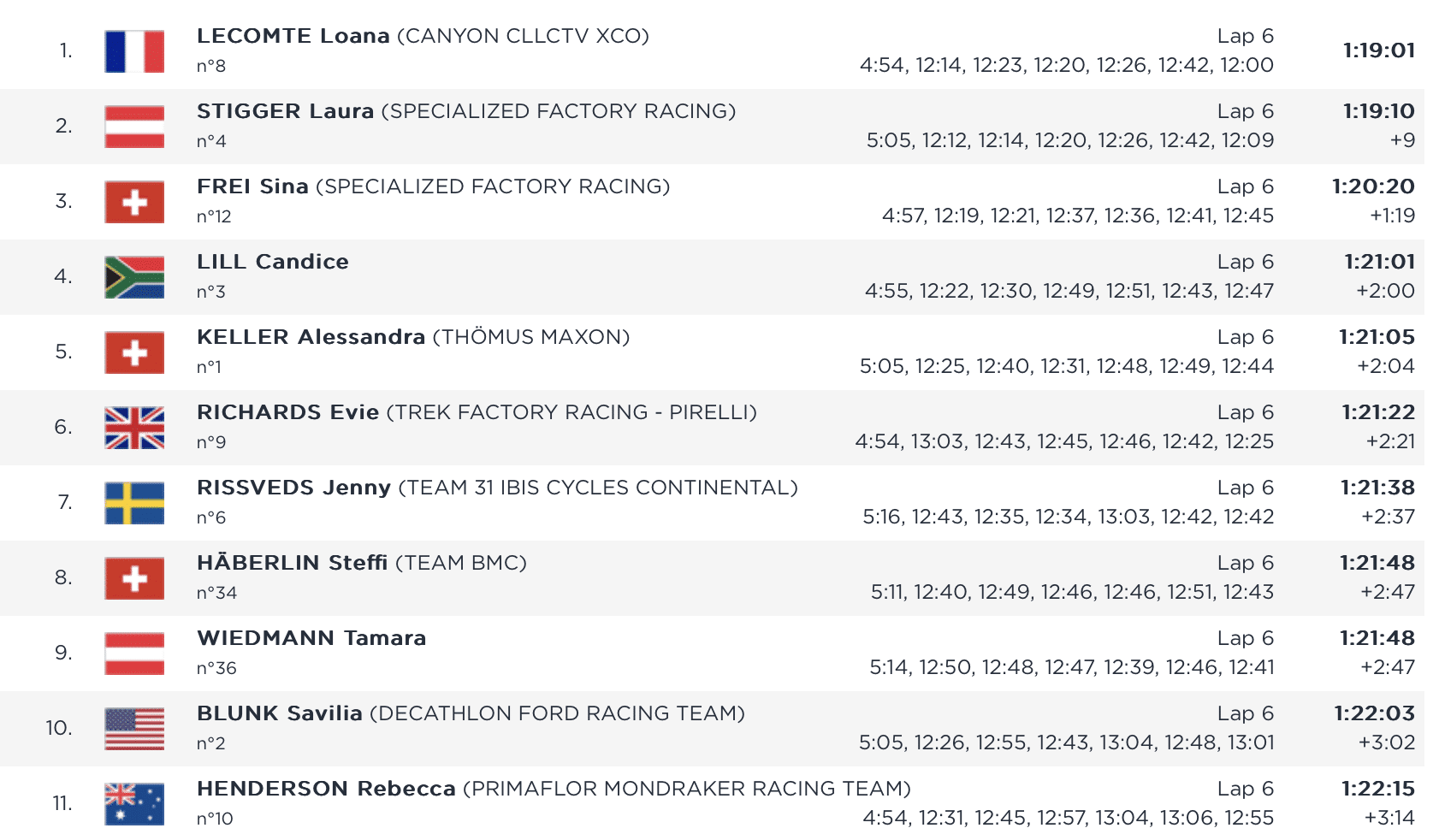 Derrière, la quatrième place a été disputée jusqu’au bout entre Candice Lill et la gagnante du classement général Alessandra Keller, mais la Sud-Africaine aura été plus forte. Auteure d’un gros retour après sa crevaison, Evie Richards se classe 6e, devant Jenny Rissveds. La Française Léna Gérault termine 20e.