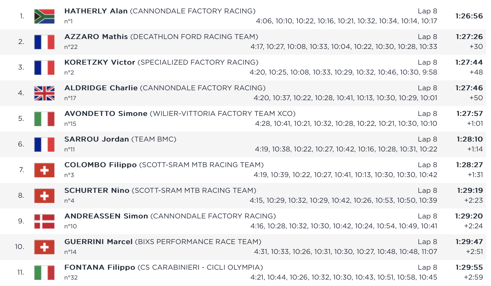Le top 10 est complété par Filippo Colombo, Nino Schurter, Simon Andreassen, Marcel Guerrini et Filippo Fontana. Côté francophone, on notera la 13e place de Joshua Dubau, la 34e place de Pierre de Froidmont, la 38e place de Antoine Philipp, la 42e place de Maxime Marotte, la 45e place de Loan Cheneval et la 49e place de Jens Schuermans.