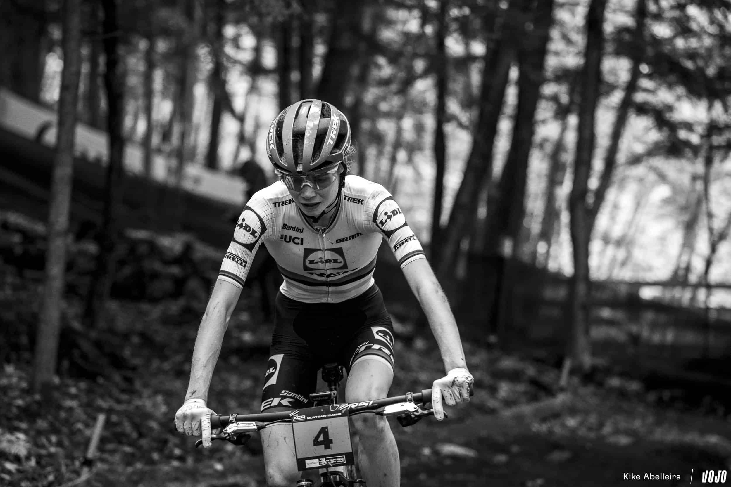Journée noire pour la championne du monde XCO U23, Isabella Holmgren… Après avoir dominé toutes les courses sur lesquelles elle s’est alignée cette saison, la Canadienne semblait avoir décidé de terminer en beauté à domicile. Partie seule très tôt dans la course, la pilote de 19 ans affichait une avance de plus d’une minute avant d’être victime d’une chute qui l’obligera à abandonner.