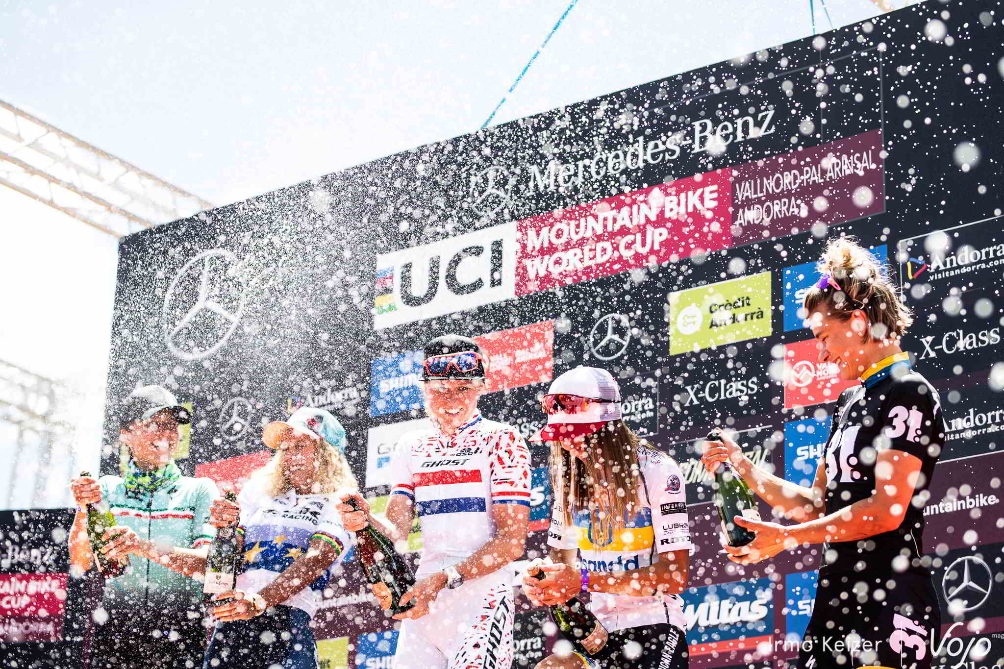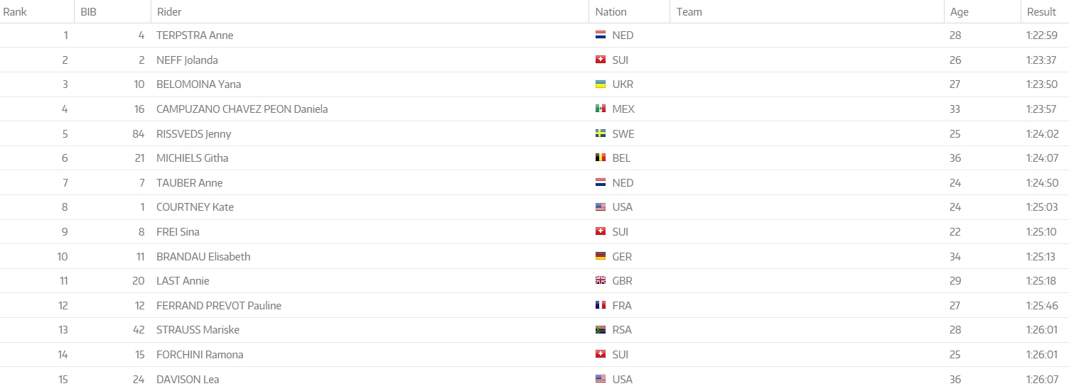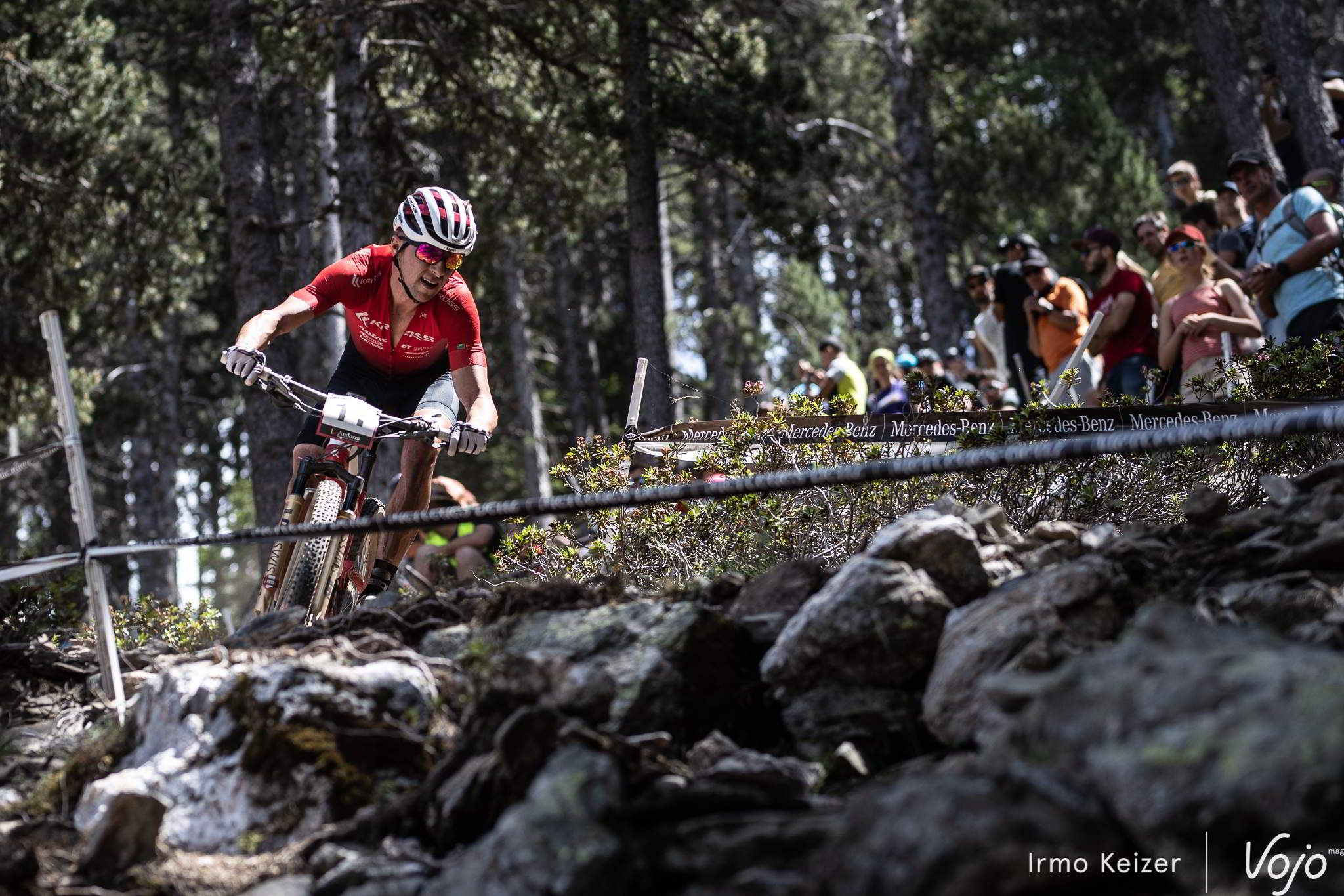 La Belge Githa Michiels est 6ème, devant Anne Tauber. Pour PFP, qui a chuté sans gravité entre temps, c’est une 12ème place probablement frustrante, mais les conditions atmosphériques et l’altitude n’ont pas vraiment réussi non plus à Kate Courtney, « seulement » 8ème en Andorre.