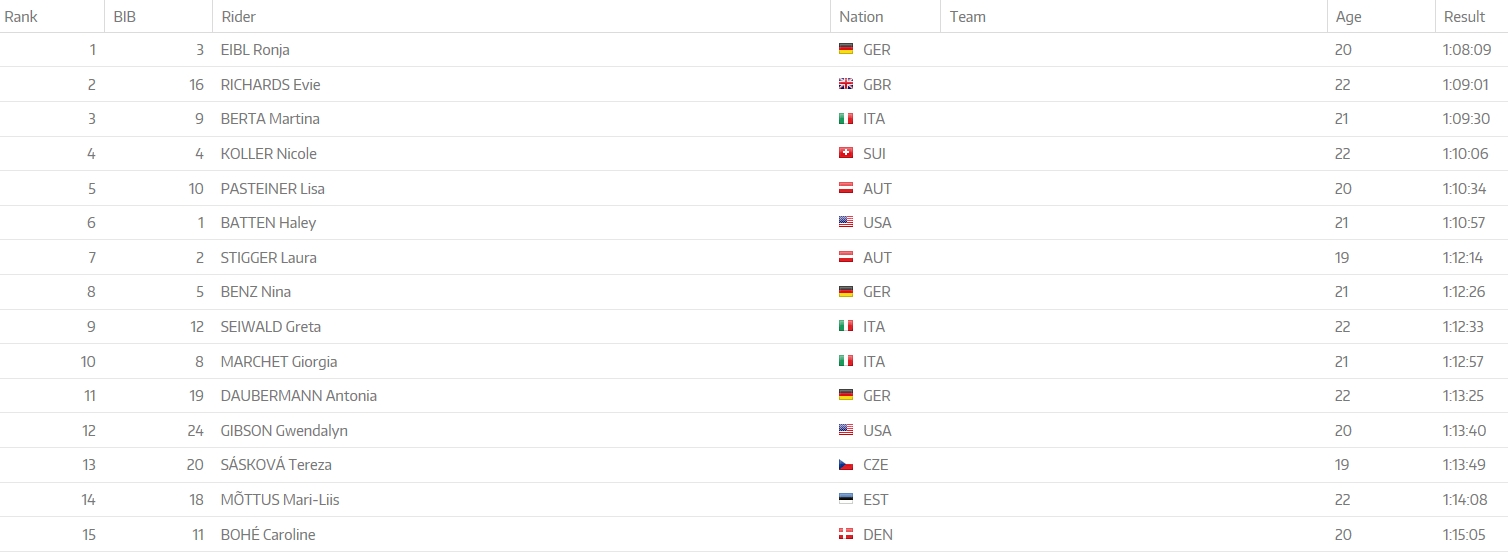 L’Allemande Ronja Eibl s’impose en U23, avec une belle avance sur Evie Richards et Martina Berta. La première Française, Hélène Clauzel, est 16ème. La Belge Emeline Detilleux est 23ème.
