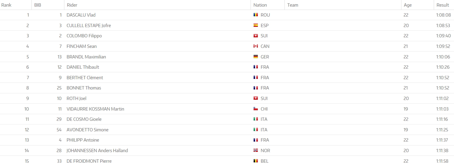 Chez les garçons, Vlad Dascalu s’impose devant Jofre Cullell Estape et Filippo Colombo. De la 6ème à la 8ème place, 3 Français : Thibaut Daniel, Clément Berthet et Thomas Bonnet. Le Belge Pierre de Froidmont est 15ème.