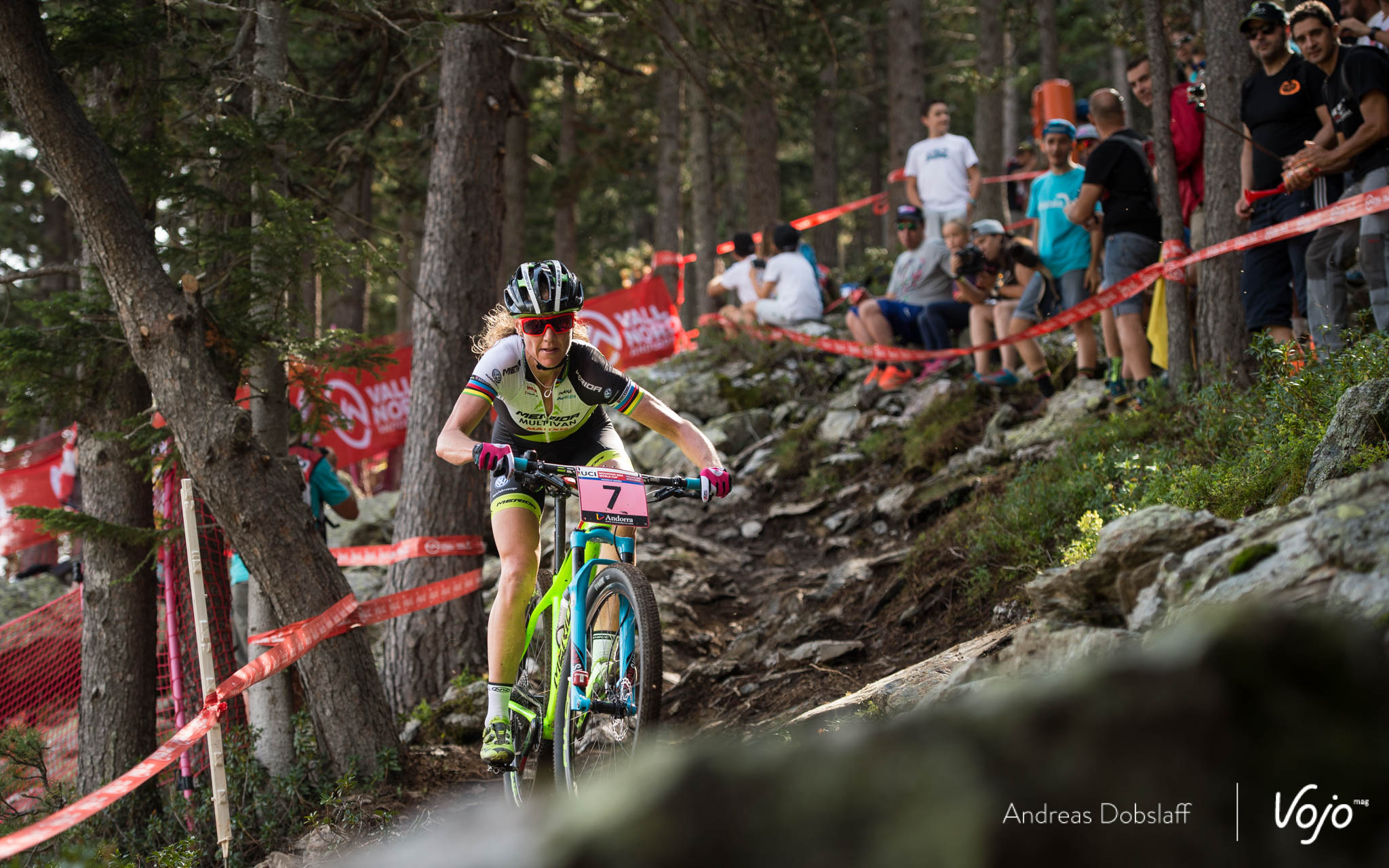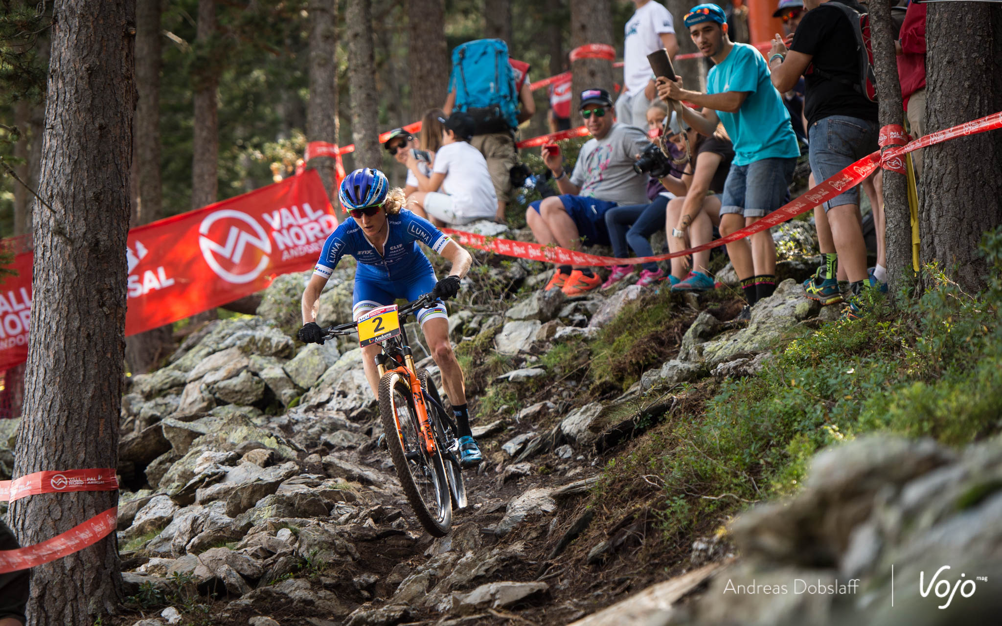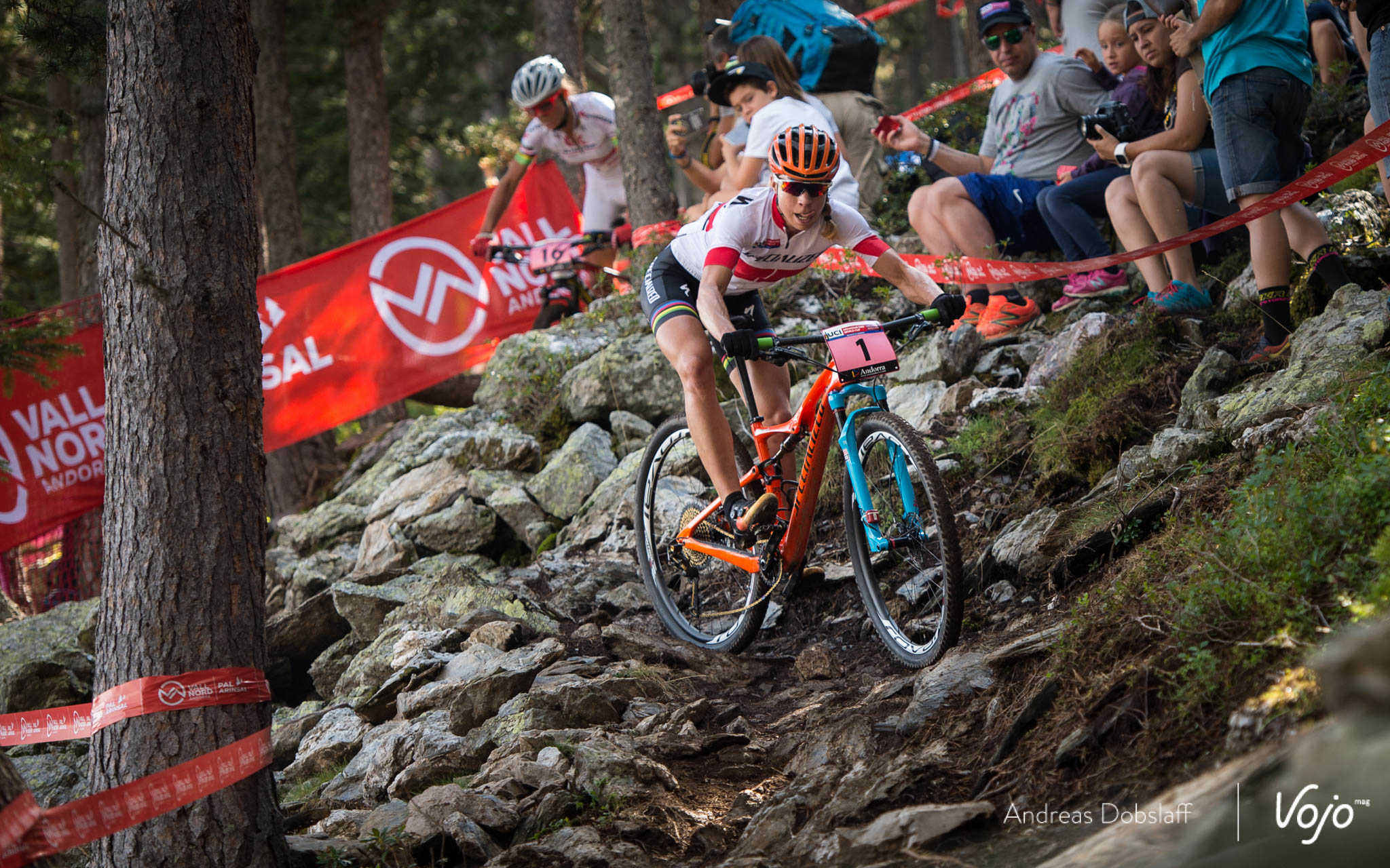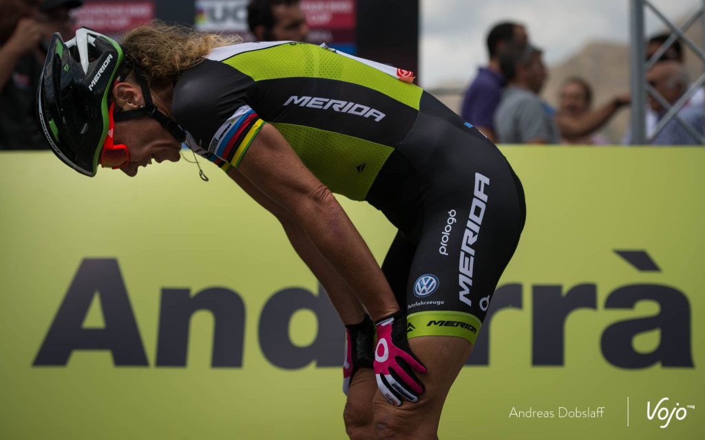 Car, elle ne le sait pas encore, mais derrière elle, Annika Langvad galère. Peu à l’aise sur les rochers parfois glissants du parcours d’Andorre, elle vole au tapis et se fait peur.