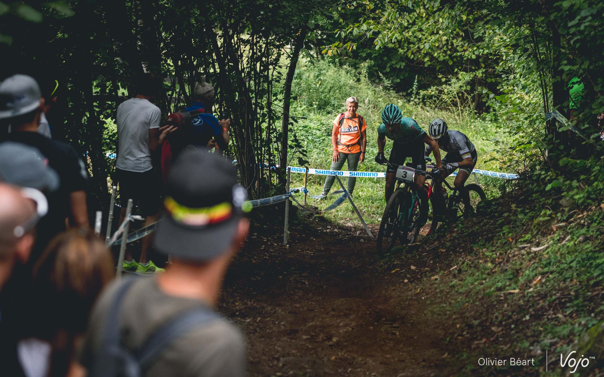 Au passage sur la ligne, au moment d’entamer le premier tour complet, on constate néanmoins que les écarts sont très faibles. Nino Schurter contrôle, Manuel Fumic est revenu (mais il va bientôt devoir reculer à cause d’un ennui mécanique) et le reste de la troupe n’est pas loin. « En fait, j’ai juste voulu bien me placer au départ, mais j’ai senti assez vite que je n’avais pas des jambes extraordinaires et que je ne pourrais pas tenir longtemps sans calmer le jeu », nous confirmera Titouan Carod à l’arrivée. Un peu plus loin, Jordan Sarrou semble bien, comme Maxime Marotte qui sauve encore les apparences à ce moment-là. Quant à Stéphane Tempier, il n’a pas spécialement pris un bon départ… et pourtant !