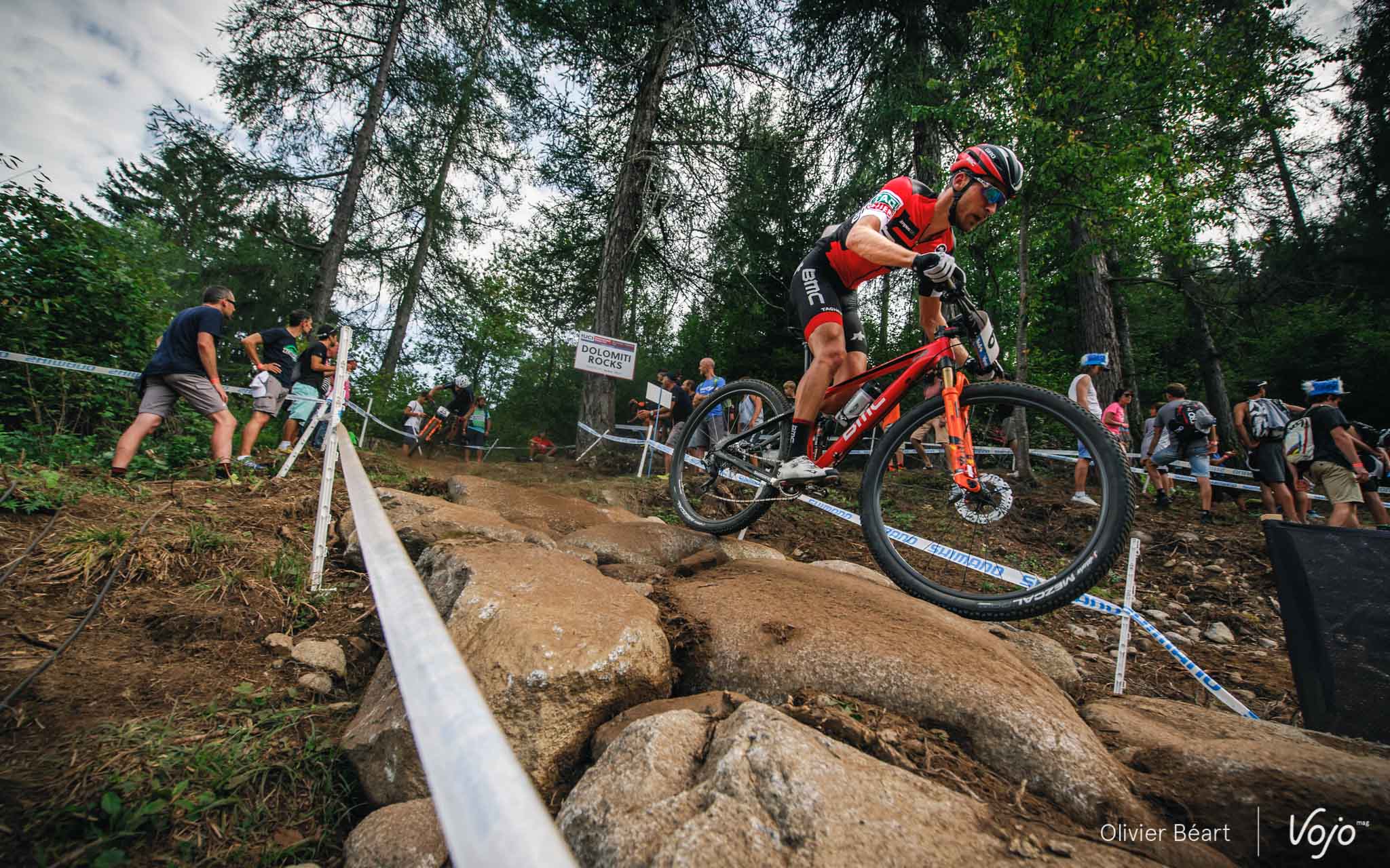 … dans les portions techniques et les descentes : Stéphane Tempier y va sans complexe. Par moments on sent que Nino Schurter doit puiser dans ses ressources pour rester au contact.