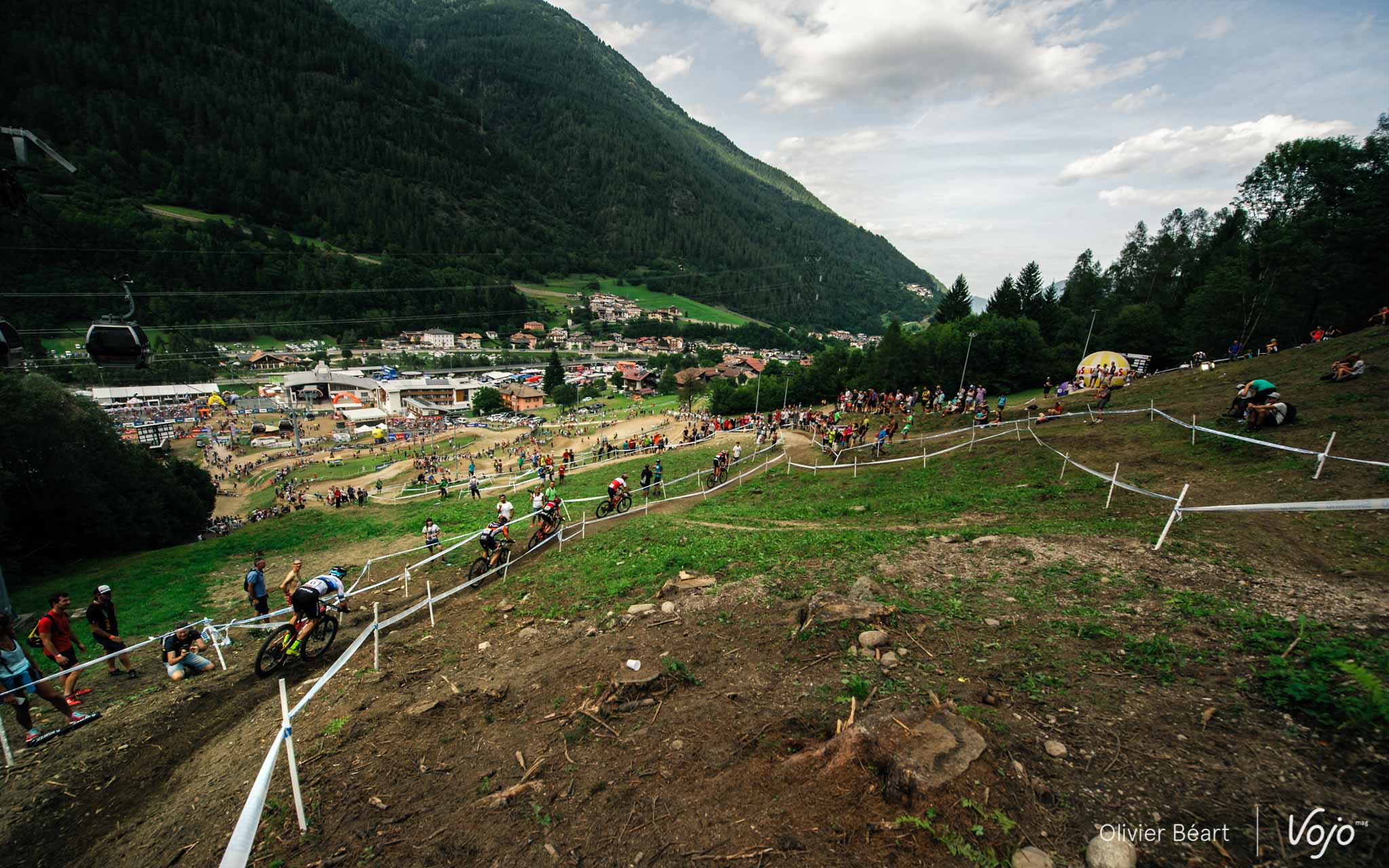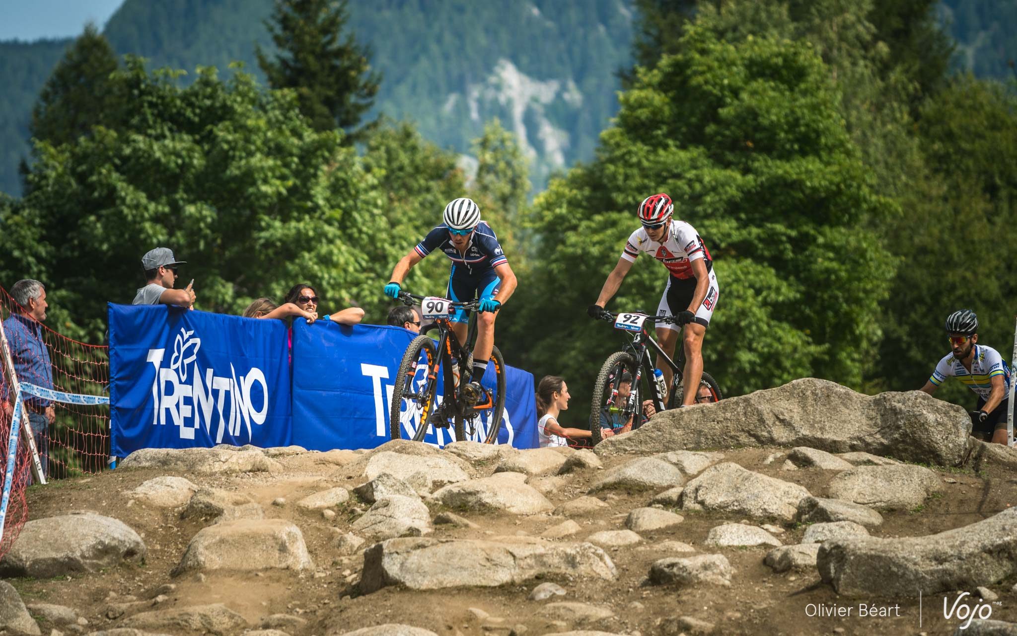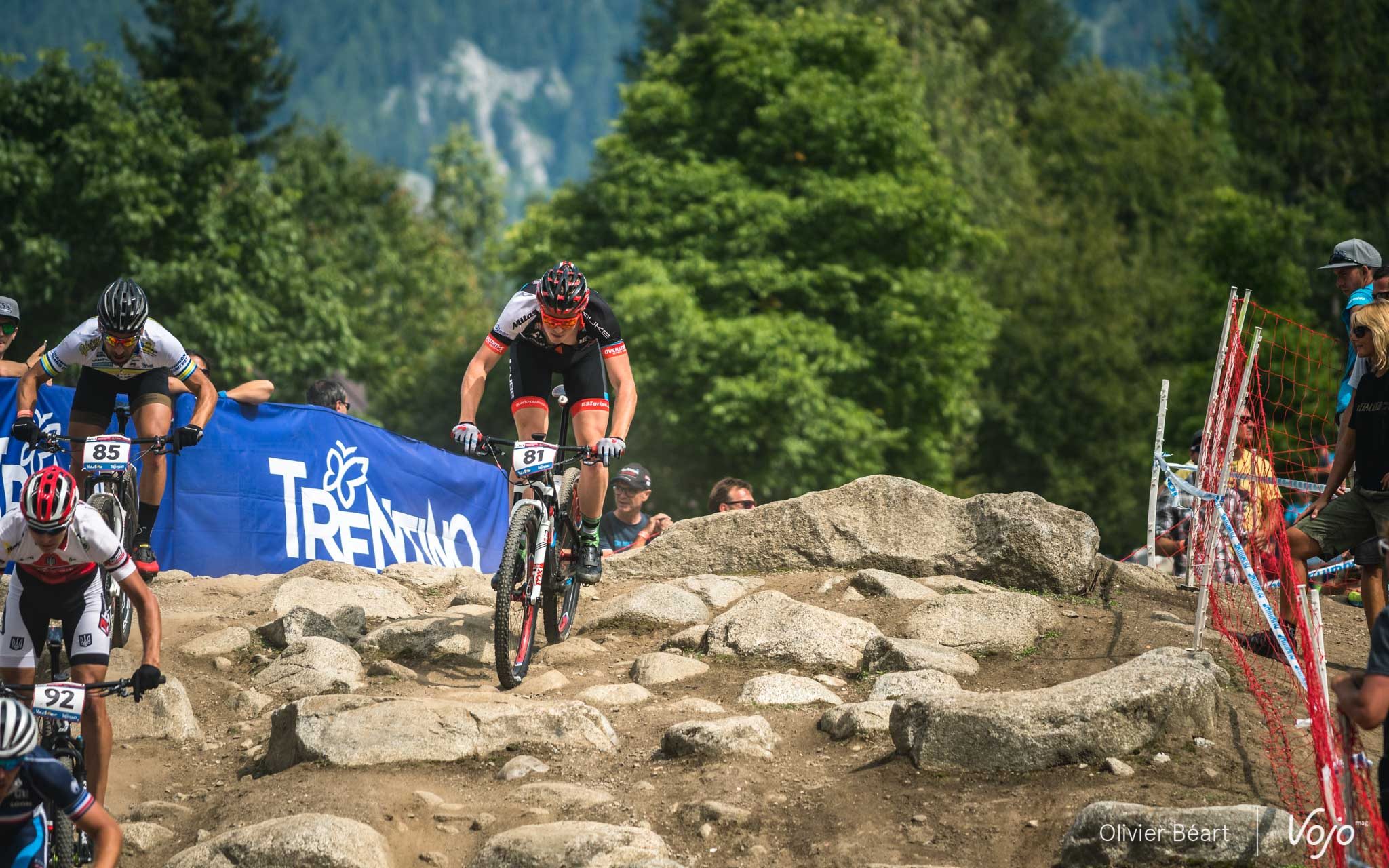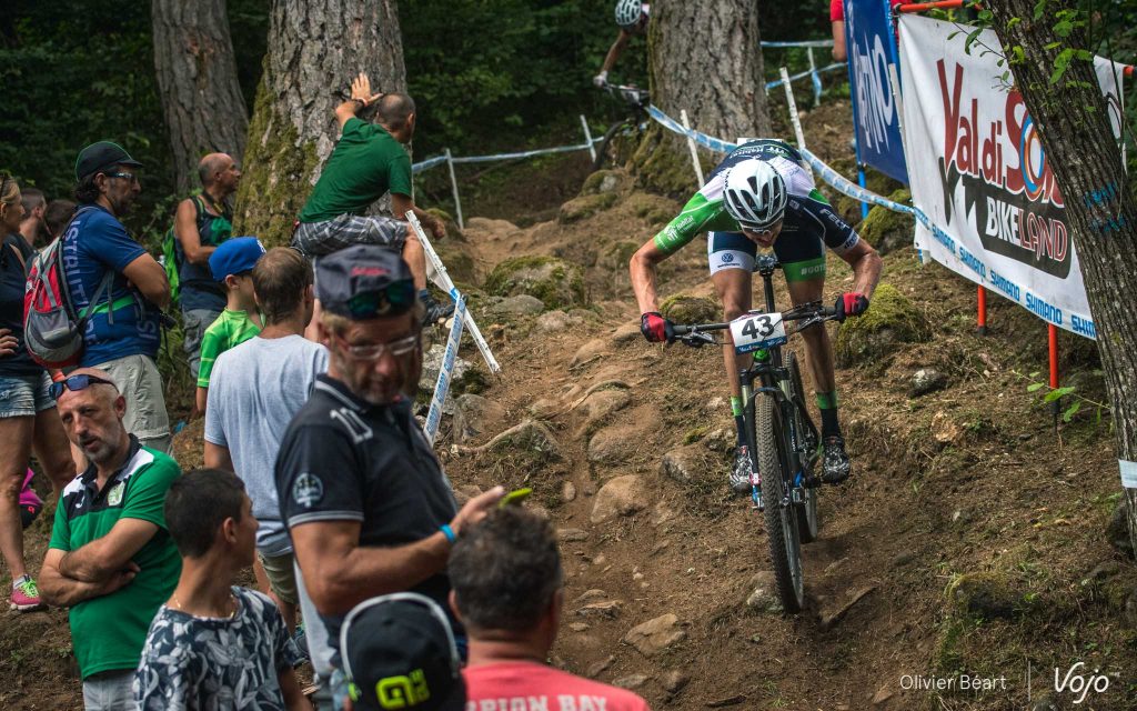 Au même moment, Julien Absalon se débat encore dans le trafic. Mais il ne s’est pas retrouvé complètement bloqué comme à Mont-Ste-Anne et la piste de Val di Sole offre plus de possibilités de dépassement. Avec son coéquipier Lars Forster, ils vont doucement remonter vers les premières places.