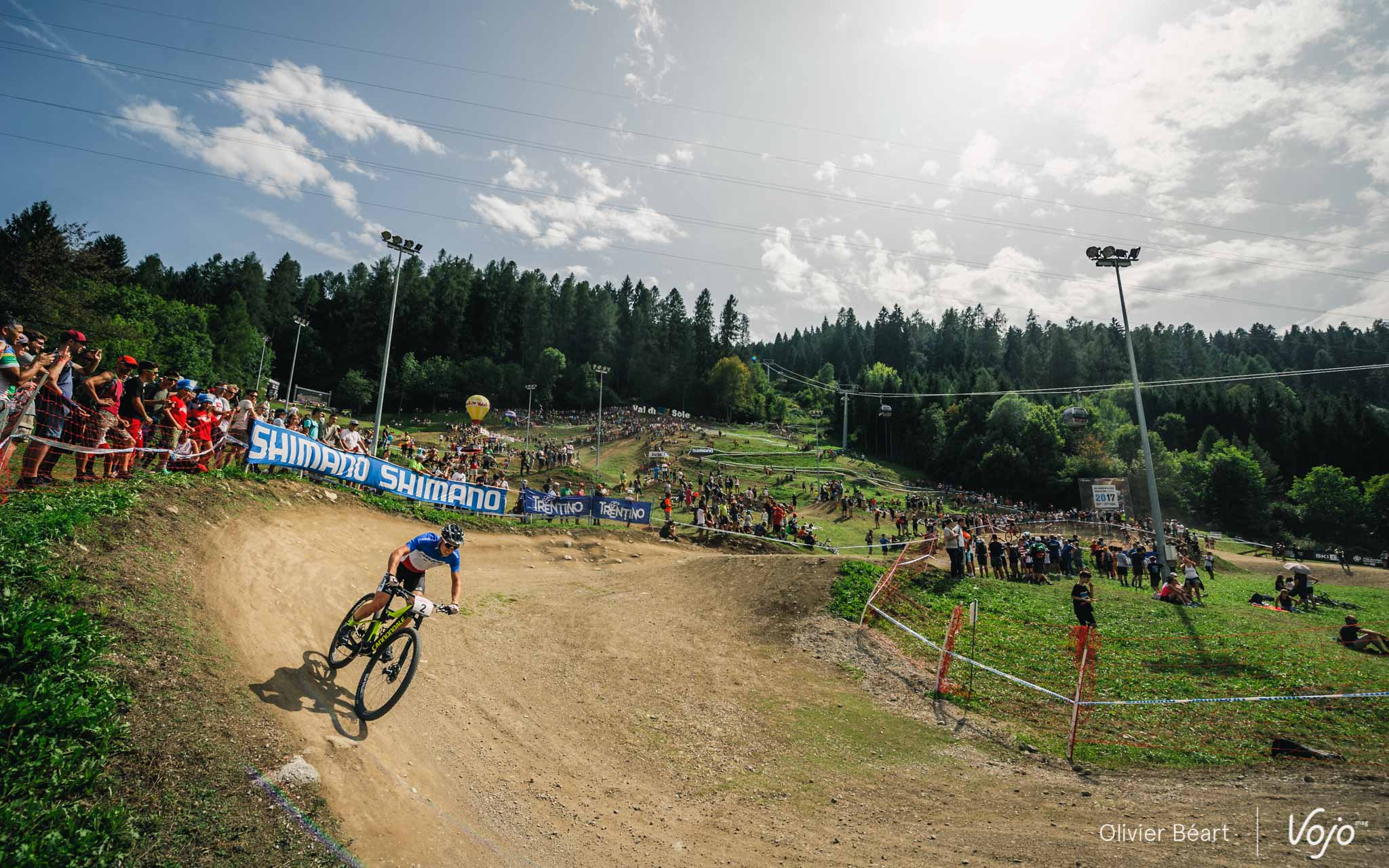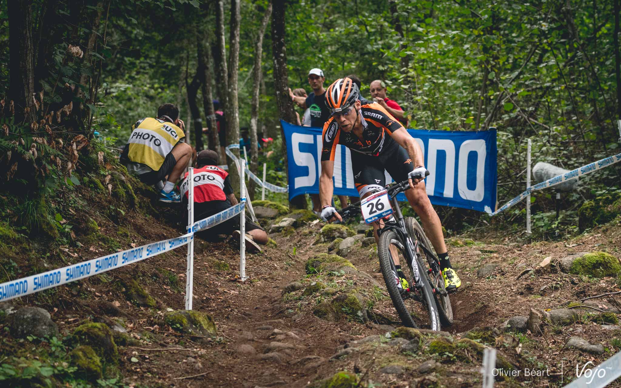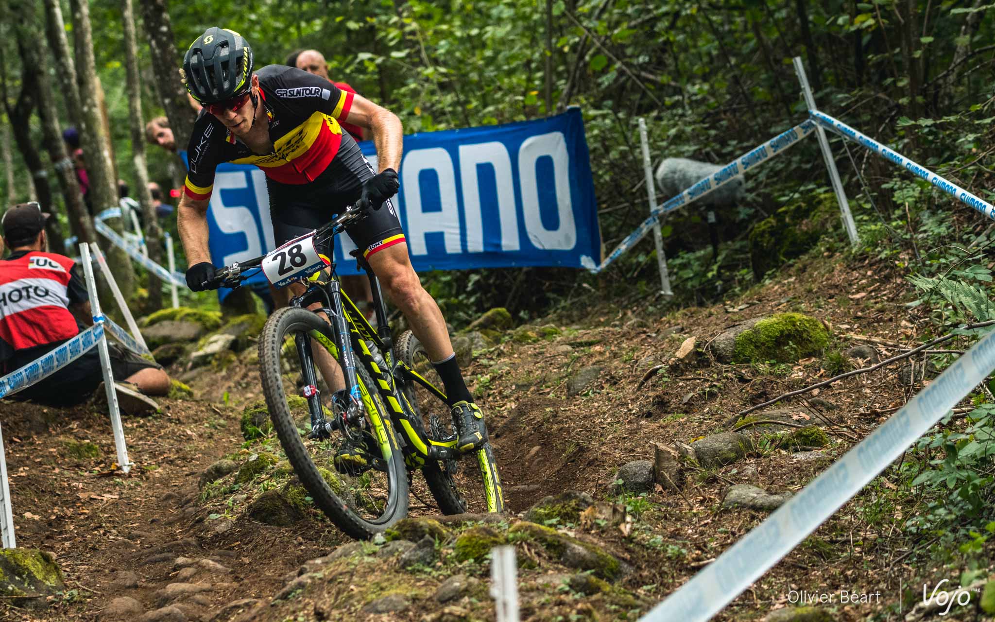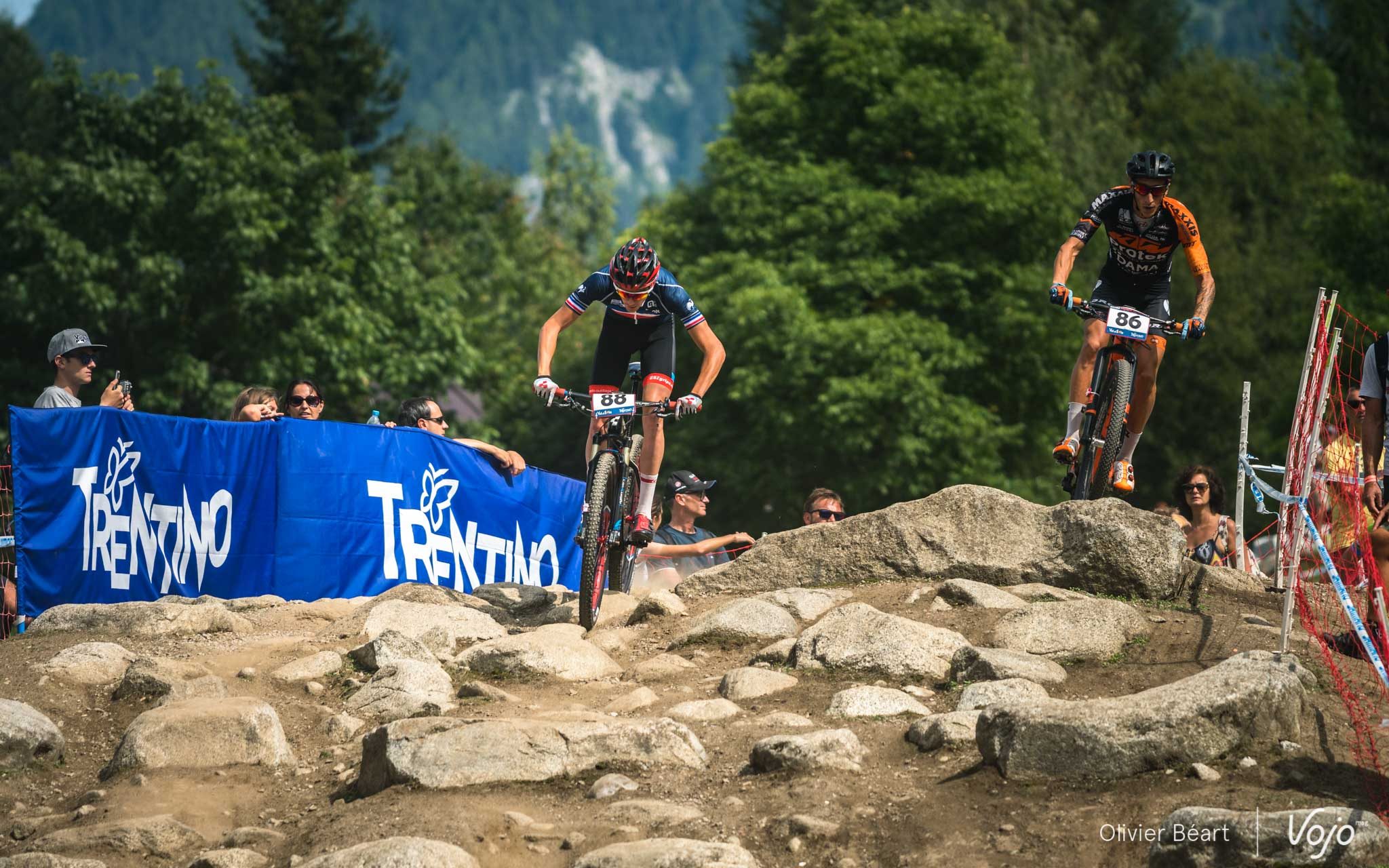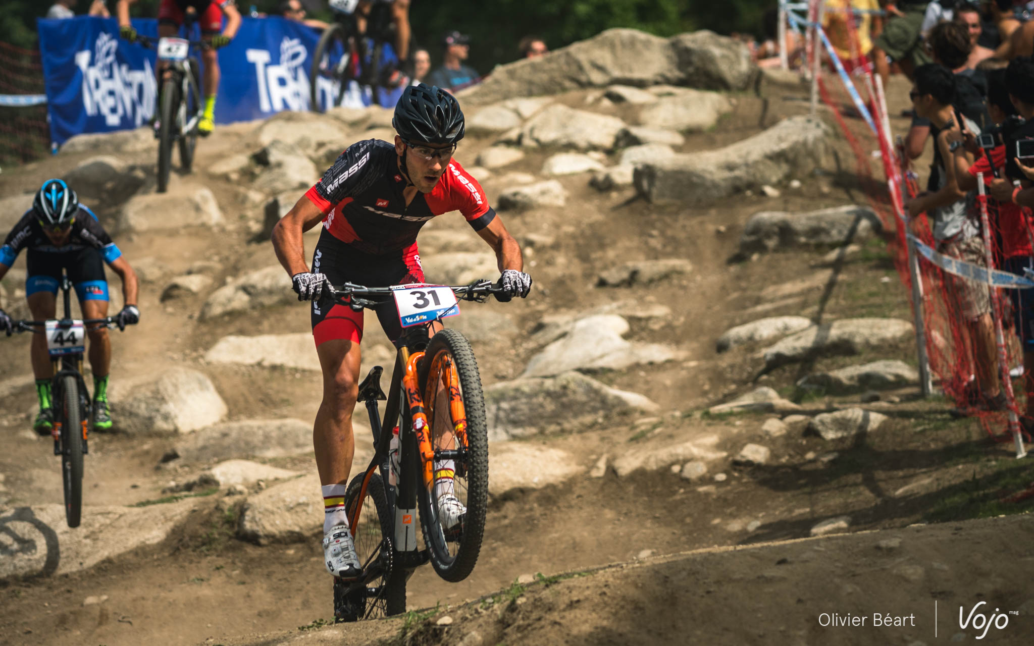 Au même moment, Julien Absalon se débat encore dans le trafic. Mais il ne s’est pas retrouvé complètement bloqué comme à Mont-Ste-Anne et la piste de Val di Sole offre plus de possibilités de dépassement. Avec son coéquipier Lars Forster, ils vont doucement remonter vers les premières places.