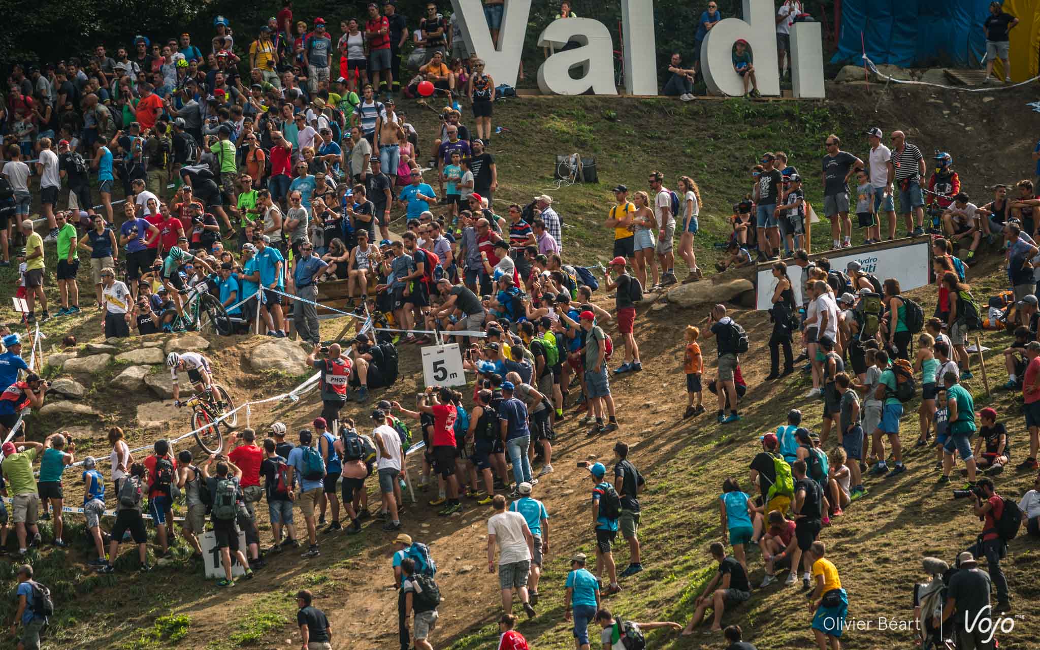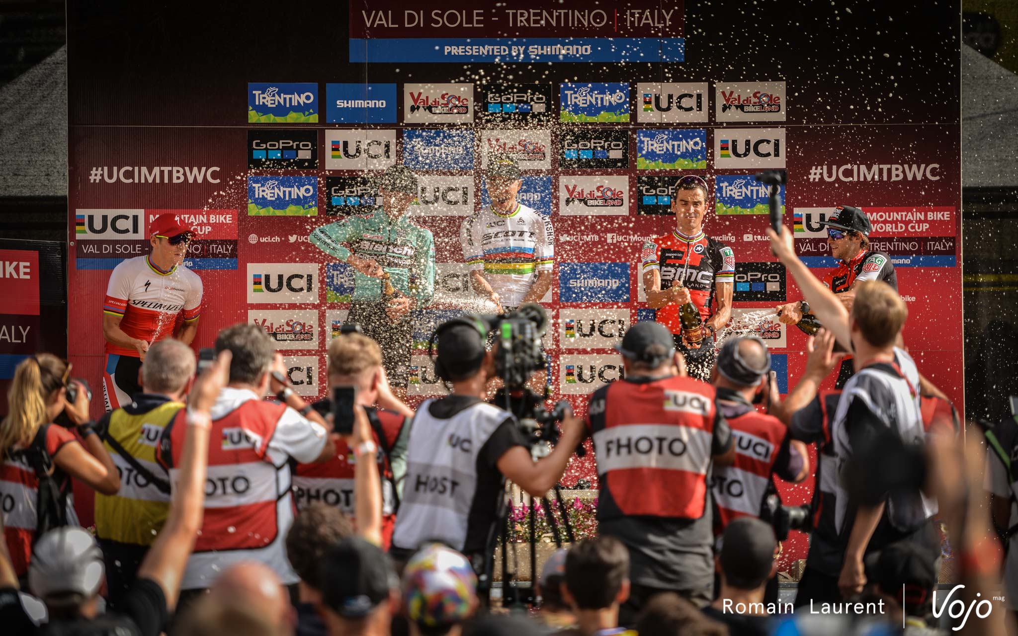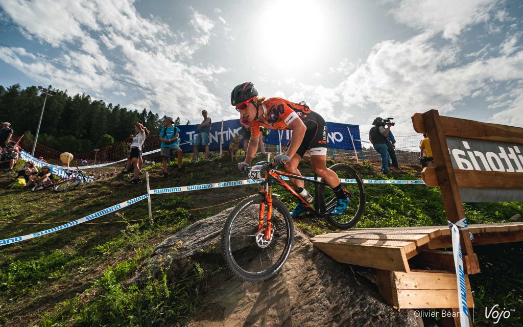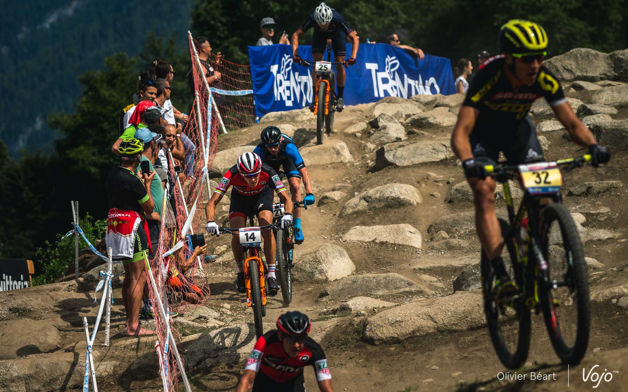 Au même moment, Julien Absalon se débat encore dans le trafic. Mais il ne s’est pas retrouvé complètement bloqué comme à Mont-Ste-Anne et la piste de Val di Sole offre plus de possibilités de dépassement. Avec son coéquipier Lars Forster, ils vont doucement remonter vers les premières places.