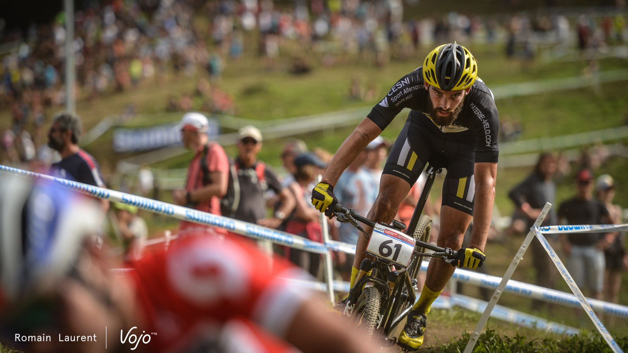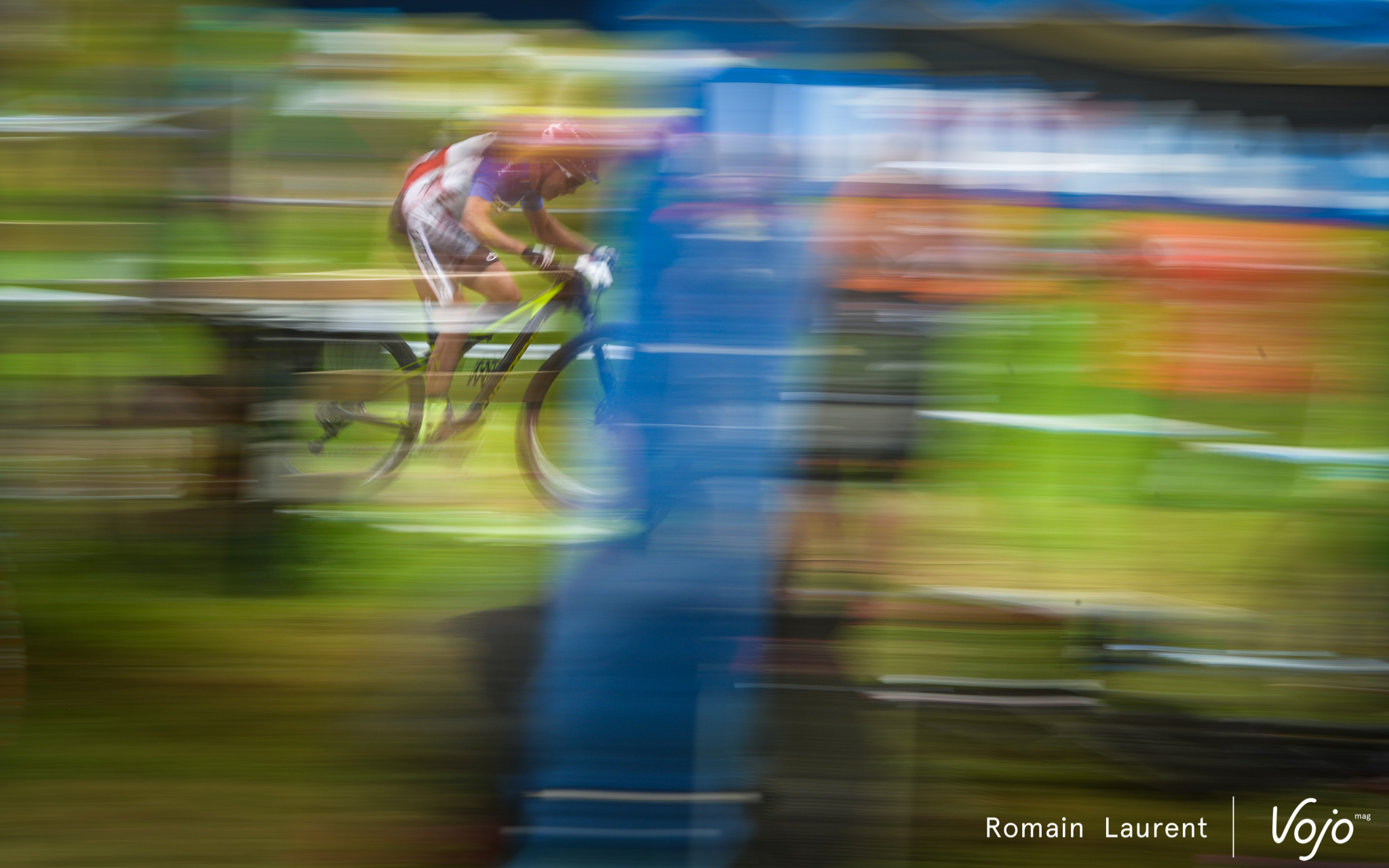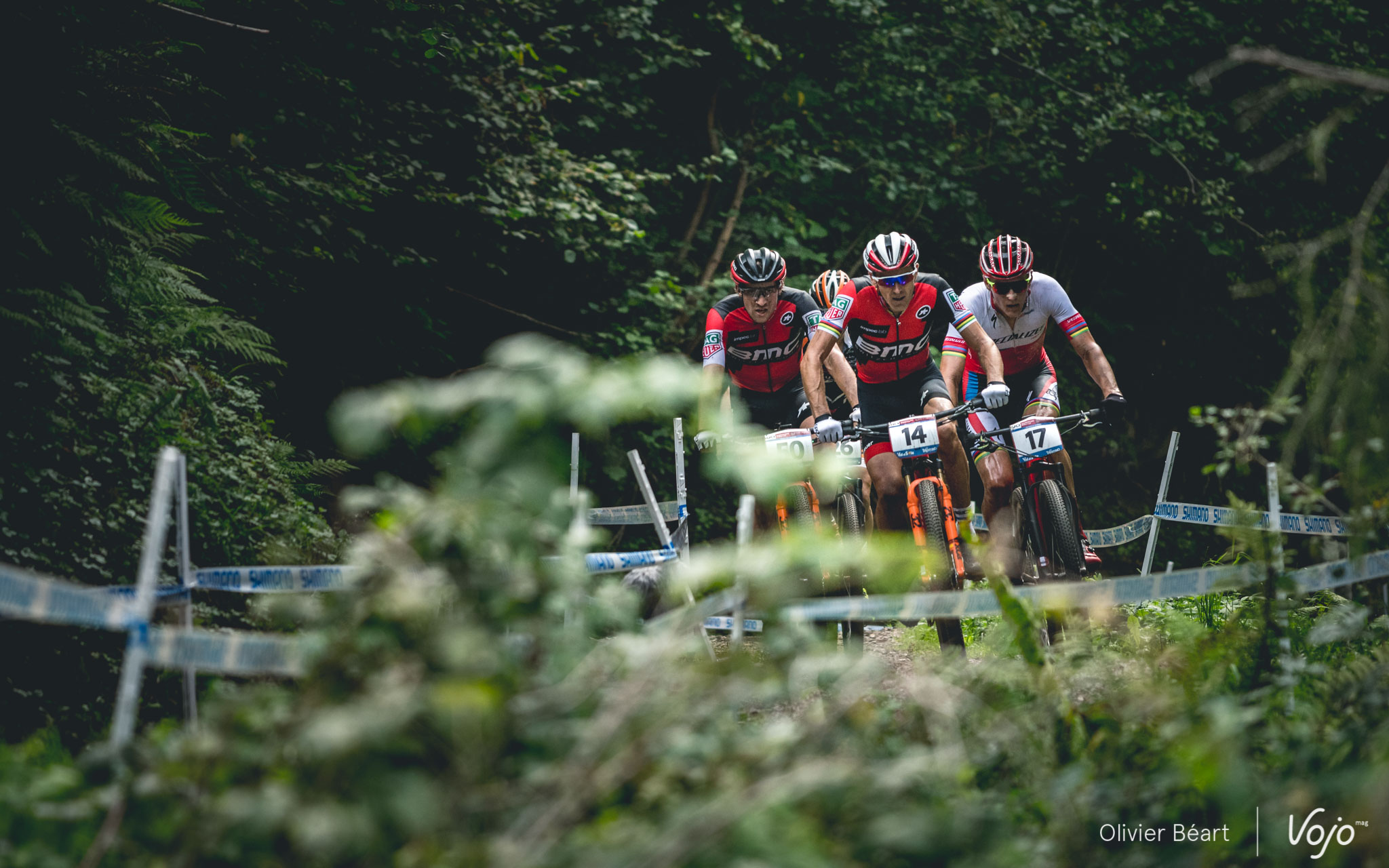 Au passage sur la ligne, au moment d’entamer le premier tour complet, on constate néanmoins que les écarts sont très faibles. Nino Schurter contrôle, Manuel Fumic est revenu (mais il va bientôt devoir reculer à cause d’un ennui mécanique) et le reste de la troupe n’est pas loin. « En fait, j’ai juste voulu bien me placer au départ, mais j’ai senti assez vite que je n’avais pas des jambes extraordinaires et que je ne pourrais pas tenir longtemps sans calmer le jeu », nous confirmera Titouan Carod à l’arrivée. Un peu plus loin, Jordan Sarrou semble bien, comme Maxime Marotte qui sauve encore les apparences à ce moment-là. Quant à Stéphane Tempier, il n’a pas spécialement pris un bon départ… et pourtant !