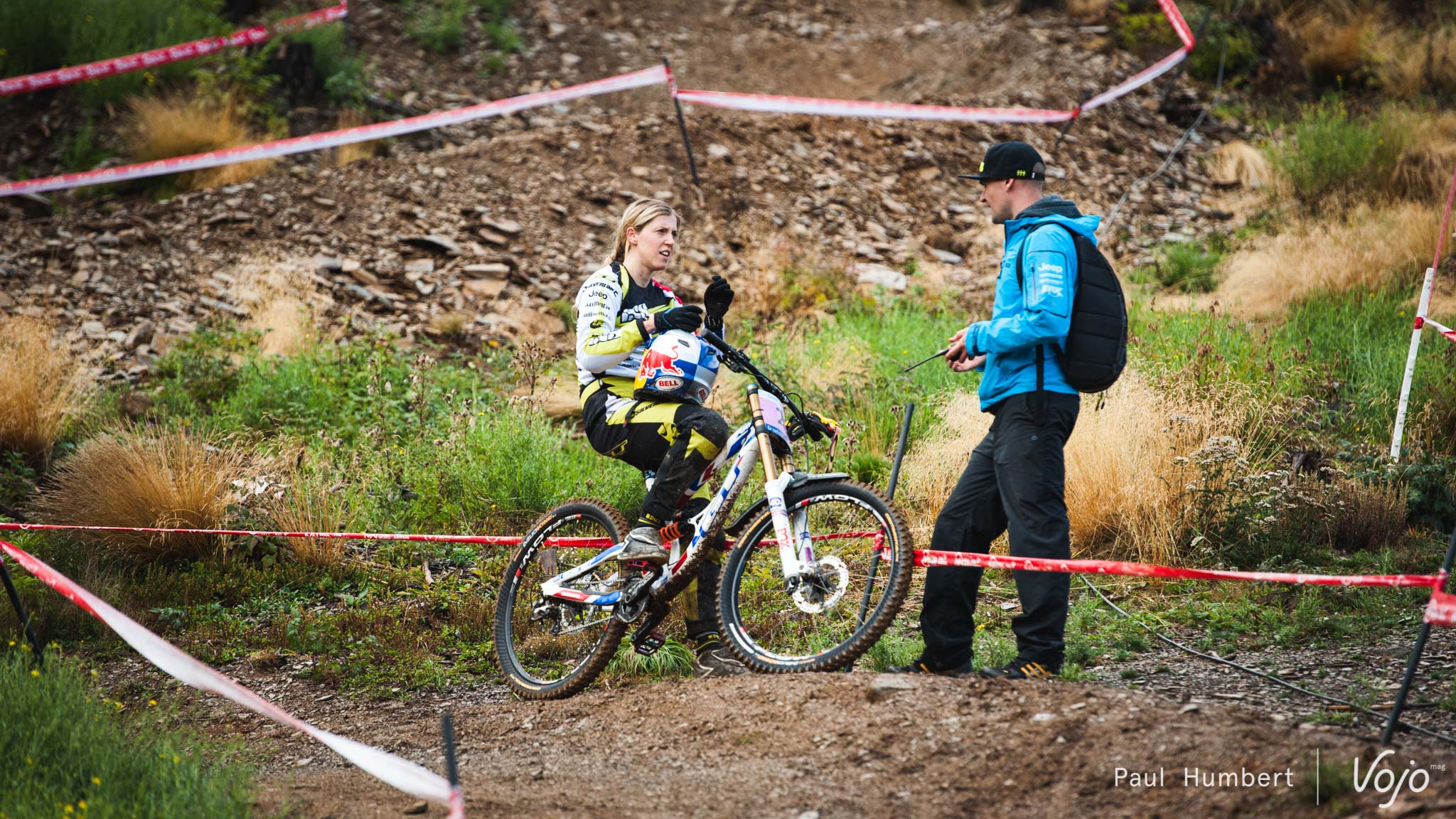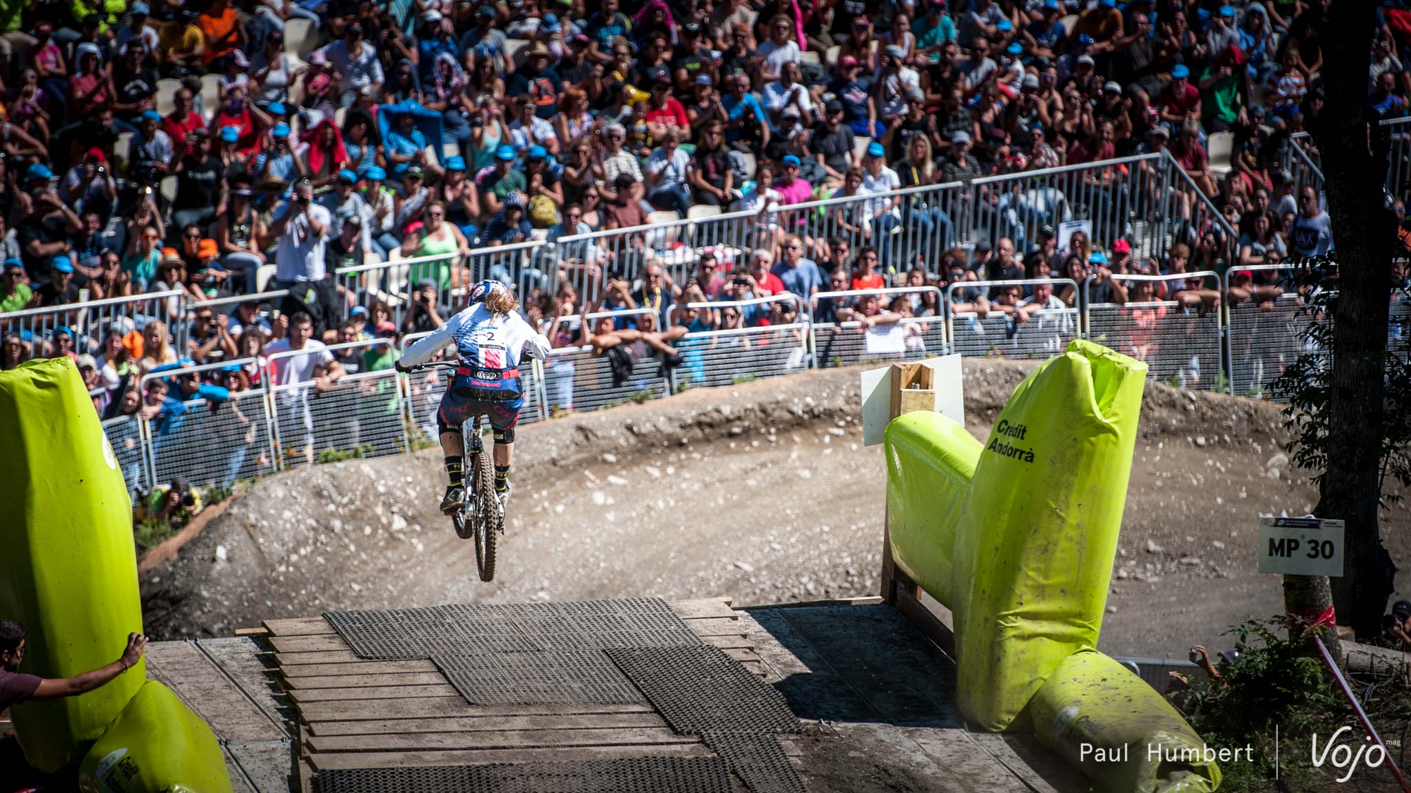 Privée de son maillot de championne du Monde en 2014, Rachel Atherton est partie à la reconquête de ce dernier. Après avoir largement dominé la saison de coupe du Monde, l’Anglaise était annoncée comme grande favorite sur le tracé andorran. Les plus fins observateurs ont tout de même pu constater la montée en puissance de Myriam Nicole lors des dernières manches de coupe du Monde. La Française était en Andorre comme chez elle et ses premiers tours de roues sur la piste laissaient présager un beau duel. Une chute de la Française anéantira les espoirs de l’équipe Commencal mais le clan tricolore a pu constater le retour au premier plan de Morgane Charre, elle termine 4ème.