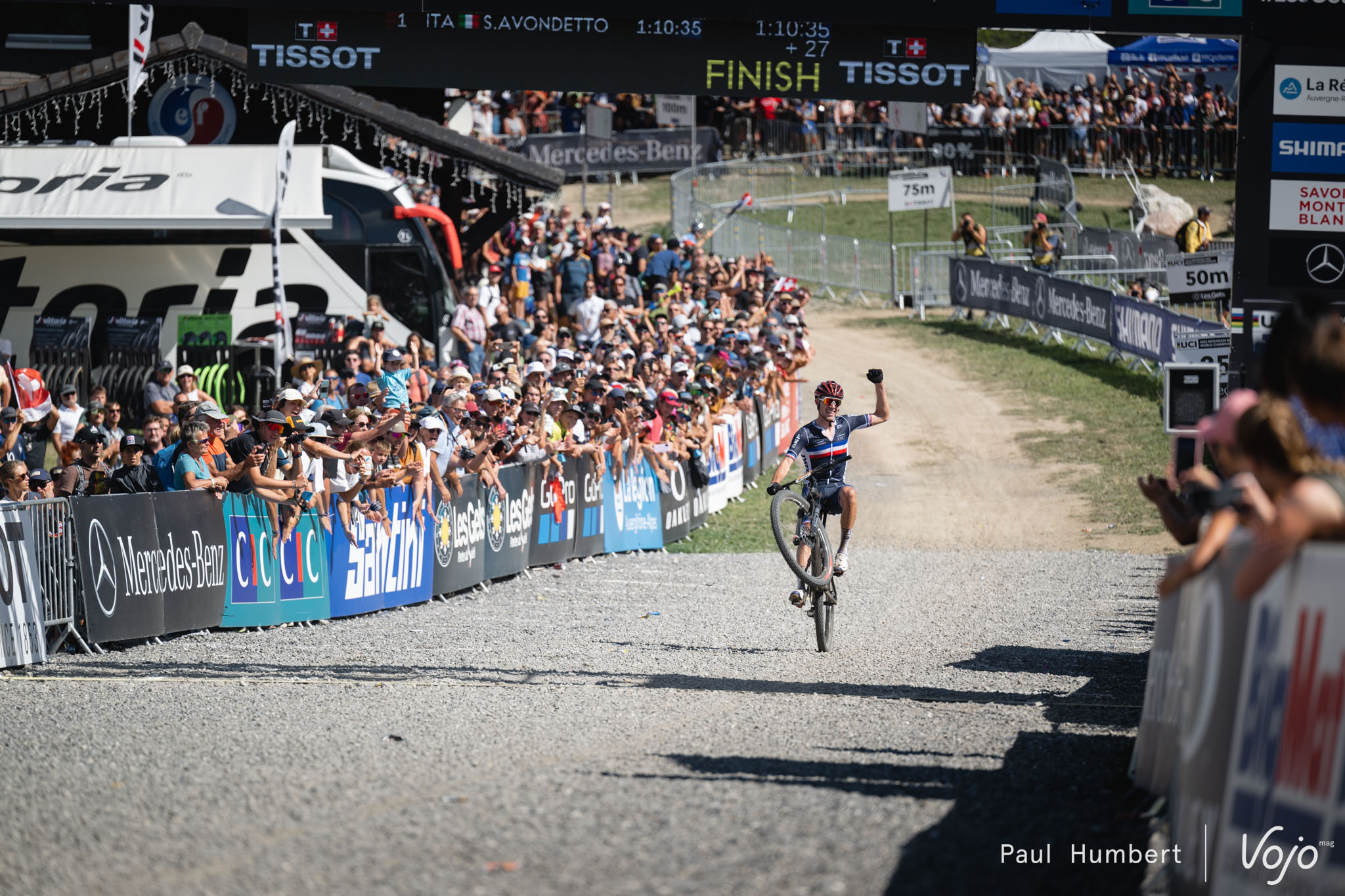 La France, et plus particulièrement Les Gets, sont littéralement en feu après le triplé français historique en DH de la veille et la victoire de Line Burquier le matin même en XCO. Si Simone Avondetto était intouchable en cette fin de course, Mathis Azzaro a réussi à ramener une médaille de plus aux Français !