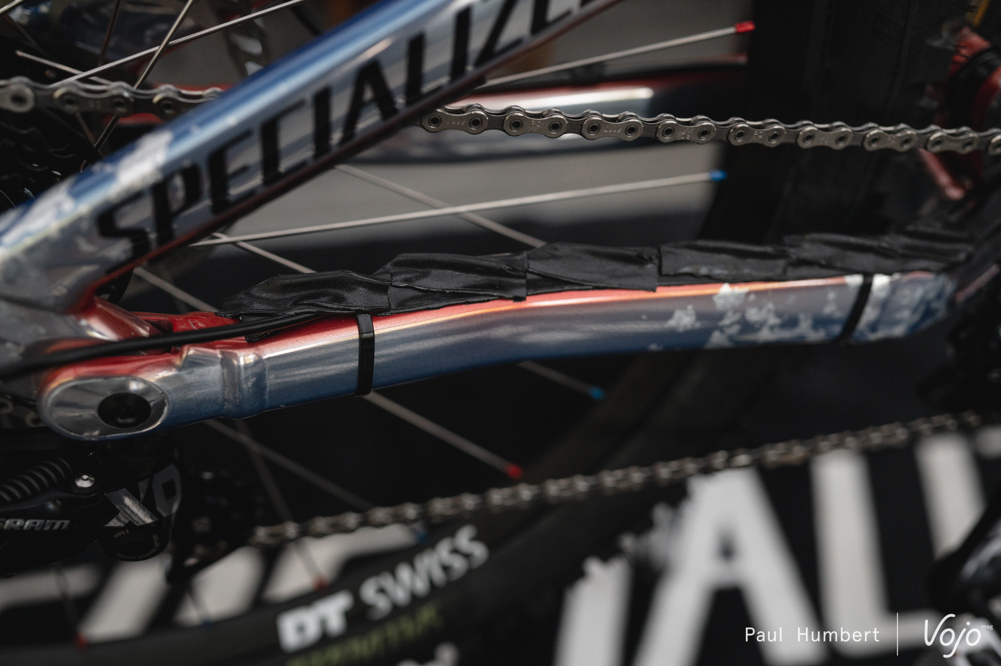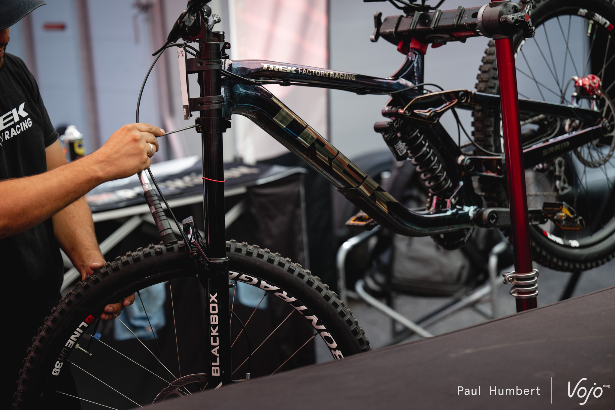 De l’autre côté de la rivière, le vélo de celui qui a déjà remporté quatre fois le maillot arc-en-ciel attend sagement le début des trainings. On y retrouve toujours ce cache noire utilisé pour masquer la tête de l’amortisseur. Un deuxième cache noire est également présent sur la fourche, sur la tête de la cartouche.