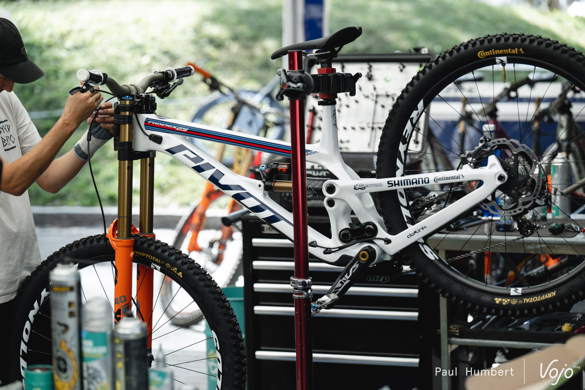 Afin de maîtriser au mieux son sujet, l’équipe Commencal Muc-Off se charge elle-même de l’entretien et de l’optimisation de ses suspensions. On notera que les Commencal Supreme V5 font partie des “rares” vélos à utiliser un amortisseur à air dans la majeure partie des cas.
