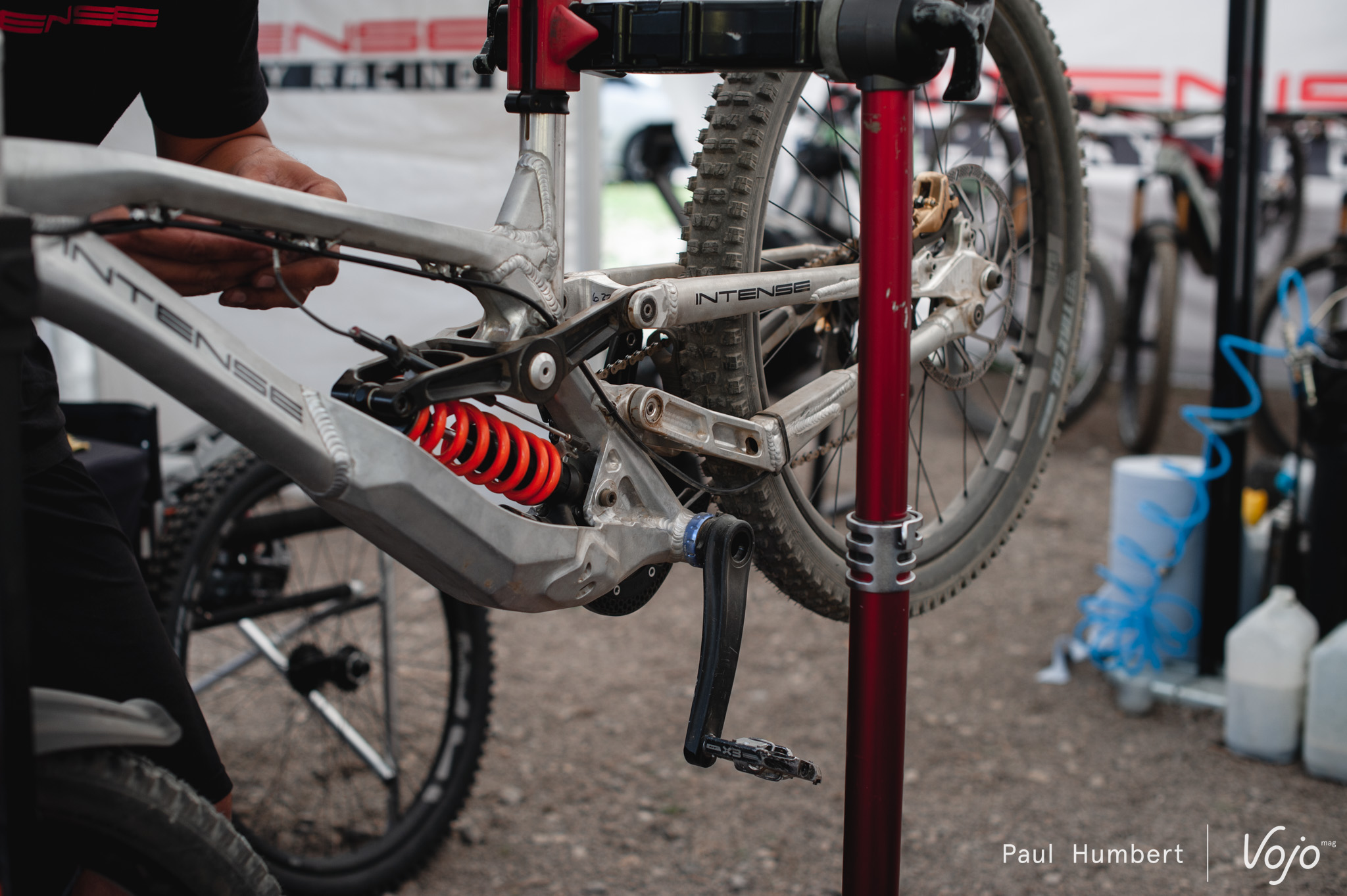 Du côté de chez Intense, les entraînements avaient commencé au moment où nous arrivons sur les stands mais il était déjà temps de procéder à quelques ajustements sur le vélo de Dakotah Norton. On notera le revêtement de la durite, utilisé pour éviter de rayer la plaque.