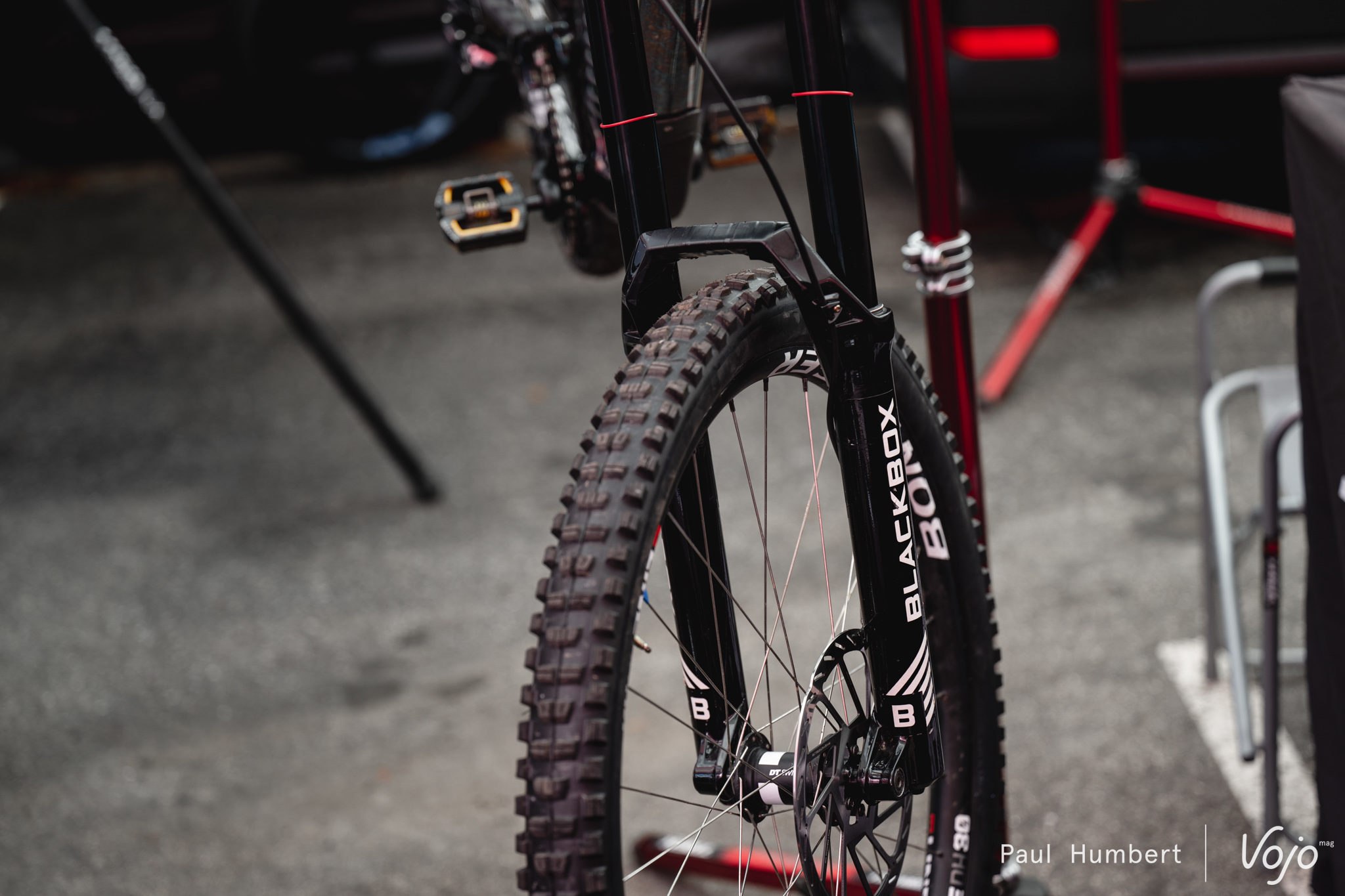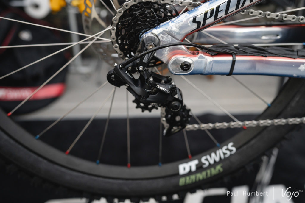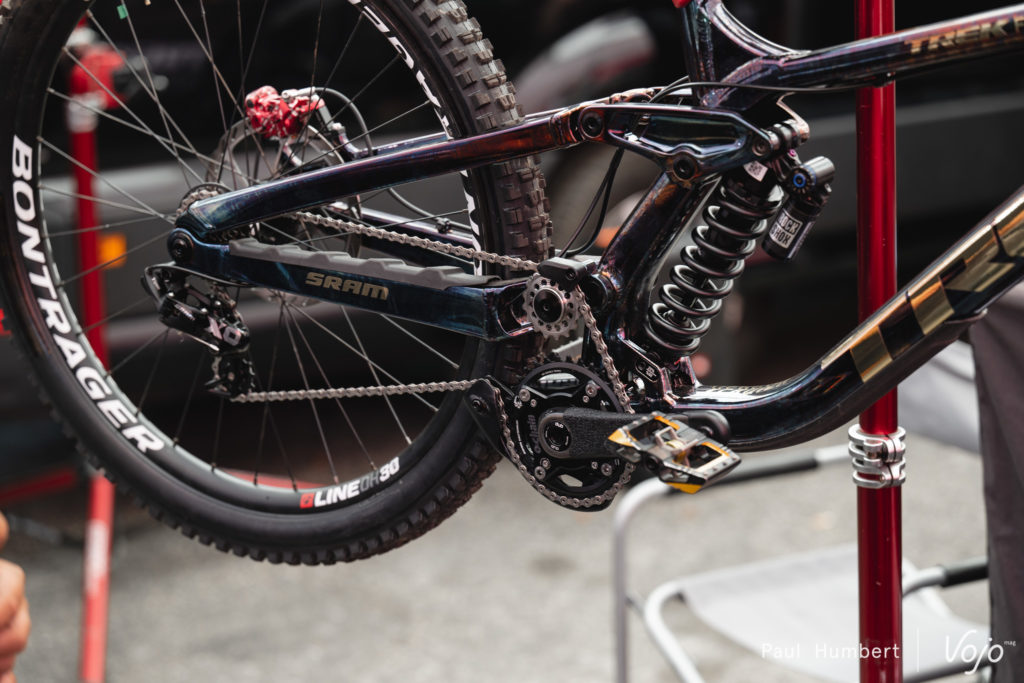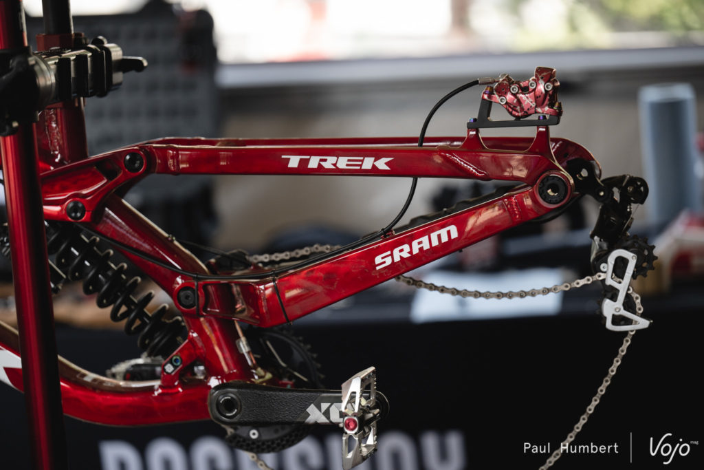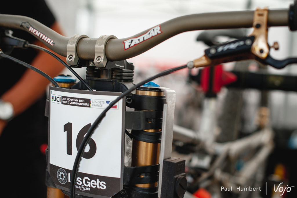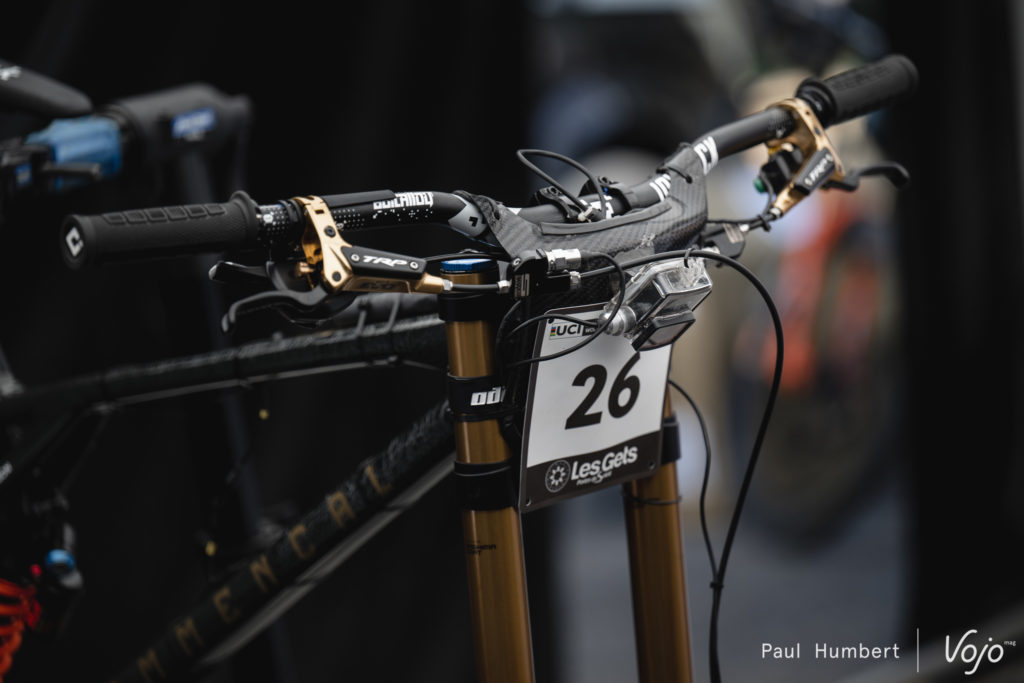 Blessé au Mont-Sainte-Anne, Loris Vergier sera bien présent pour ce championnat du monde, en témoigne la présence de son vélo dans les paddocks. Il était difficile de passer à côté de cet étrier Sram.