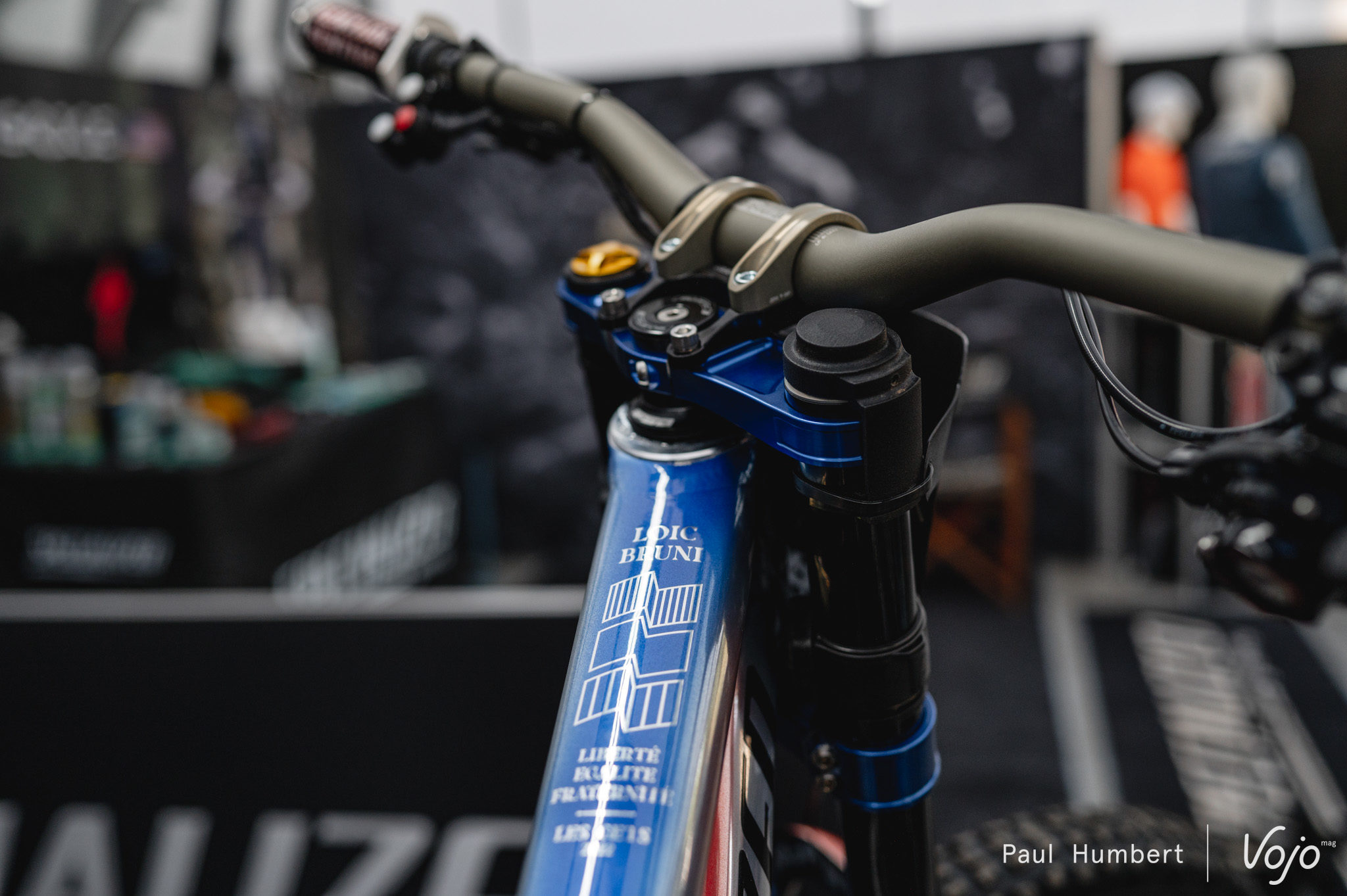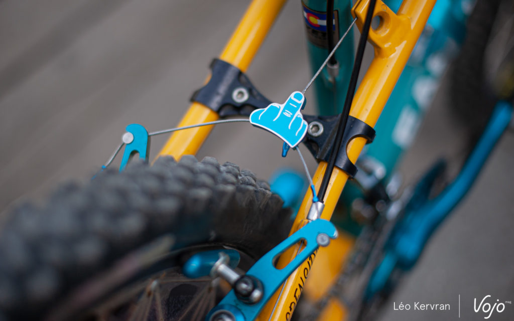 Dans la même allée, on retrouve les tentes de Commencal 100%. Si ce dérailleur TRP n’est actuellement pas disponible sur le marché, la touche de couleur complète parfaitement la peinture du cadre.